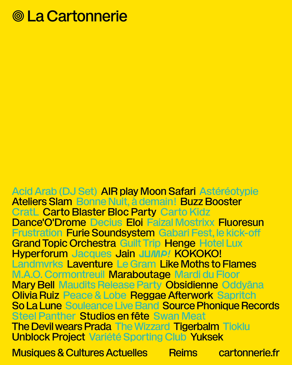 Opened in 2005, La Cartonnerie is a contemporary music venue in Reims, France, comprising three stage areas and six rehearsal studios. With the “Scène des musiques actuelles – SMAC” label, it offers concerts, artistic support, workshops, youth programmes, exhibitions and is behind the Elektricity and La Magnifique Society festivals, as well as summer highlights such as JUMP!