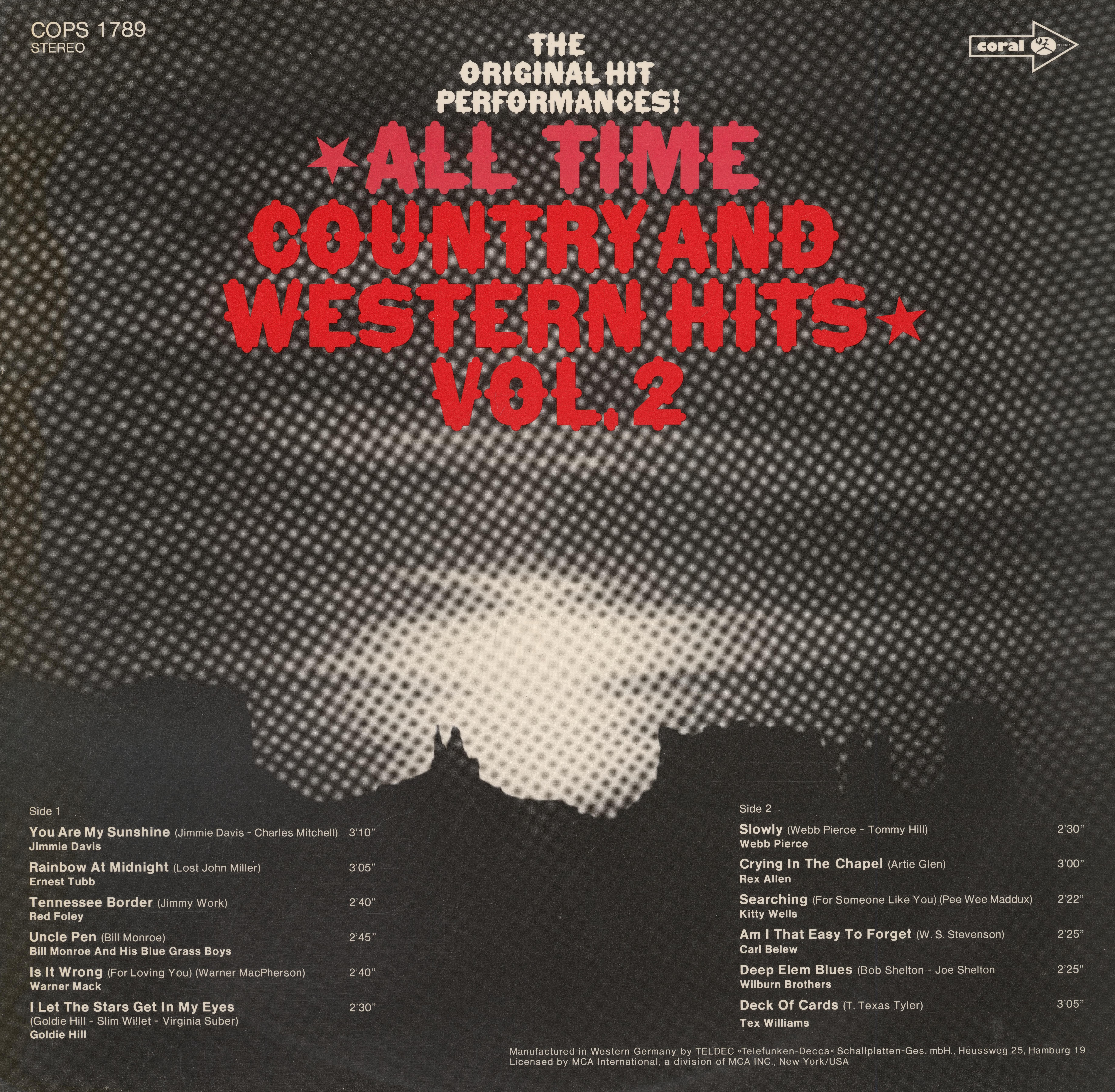 All Time Country and Western Hits Vol. 2 was first released in 1961 by Decca, with a different cover. Shown here is the German sleeve for the compilation album, issued by Coral Records as COPS 1789 about a decade later.
