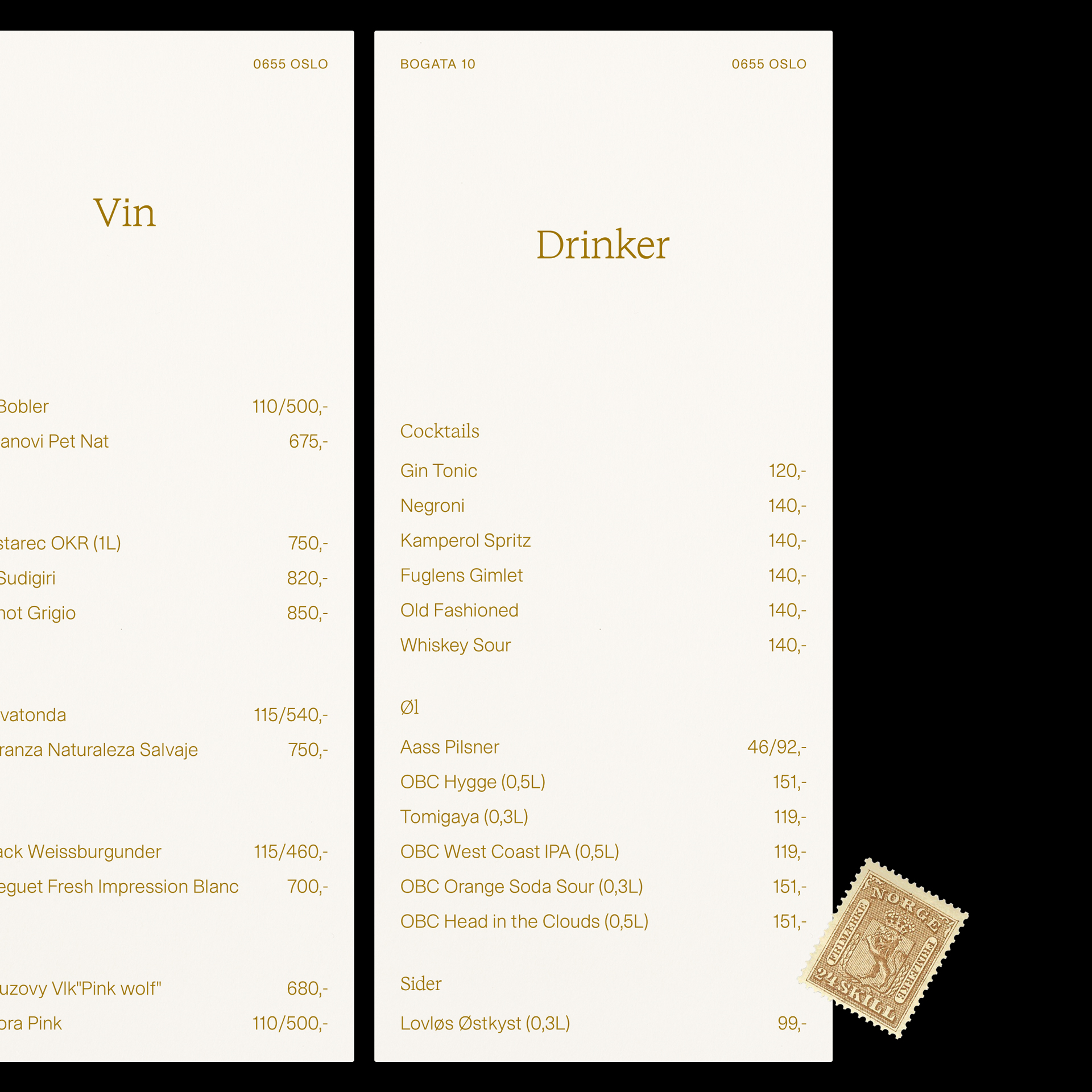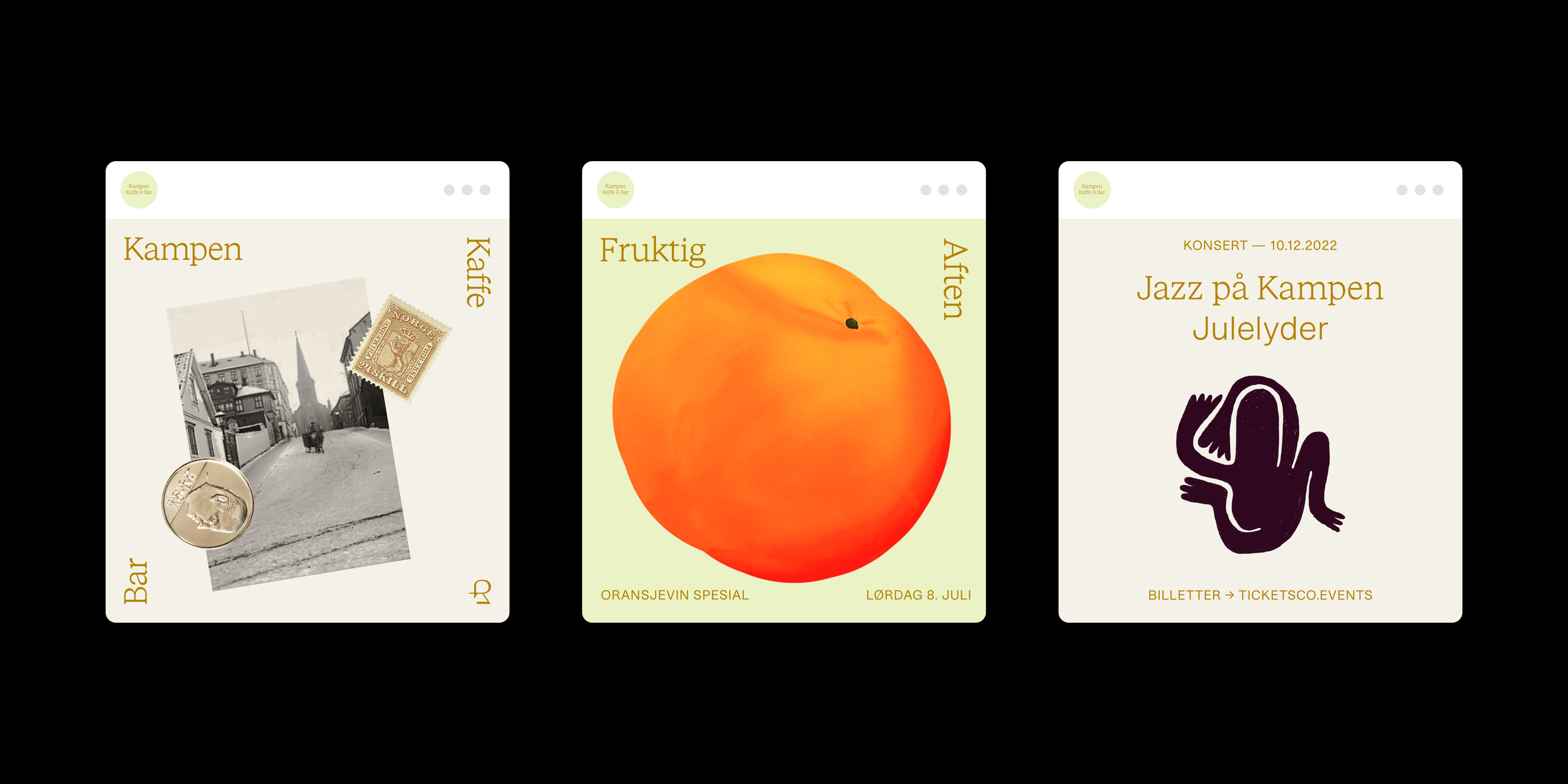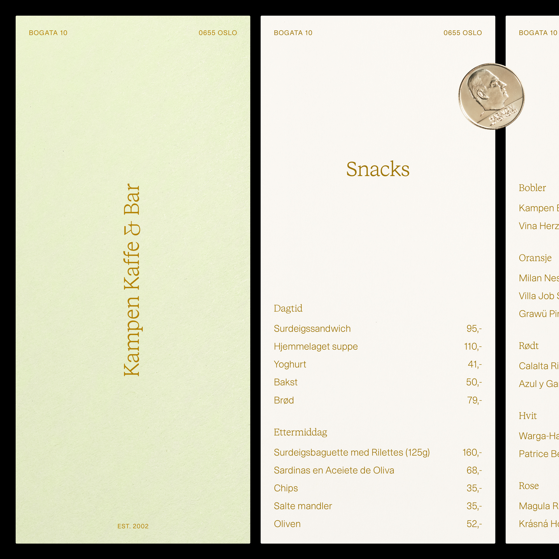 Identity for Kampen Kaffe & Bar, designed by Postpost Studio in collaboration with Natural State. Kampen Kaffe & Bar is a neighborhood gem offering coffee, cocktails and live jazz in beautiful Kampen, Oslo. The identity is based on a cross-pairing of STK Bureau, using both the serif and sans versions.