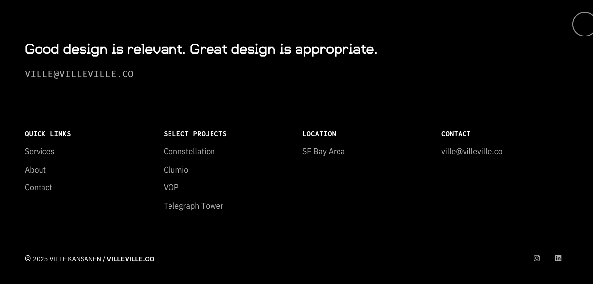 villeville.co Contributed by Jonas Pelzer on Feb 5th, 2025. Artwork published in January 2025. Source: villeville.co License: All Rights Reserved. The new portfolio website of art and creative director Ville Kansanen, villeville.co, combines Scope with Bergen Mono and IBM Plex Sans. Scope is used for headlines and prominent highlights, while Bergen Mono is used for project metadata in the overview. IBM Plex Sans is used for body copy. Source: villeville.co License: All Rights Reserved. Source: villeville.co License: All Rights Reserved. Source: villeville.co License: All Rights Reserved. Source: villeville.co License: All Rights Reserved. Source: villeville.co License: All Rights Reserved. Source: villeville.co License: All Rights Reserved. Source: villeville.co License: All Rights Reserved. Source: villeville.co License: All Rights Reserved. Typefaces More about ScopeGet ScopeMore about Bergen MonoGet Bergen MonoMore about IBM Plex SansGet IBM Plex Sans Formats Web (5556) Topics Services (1537) Graphic Design (2978) Designers/Agencies Ville Kansanen (1) Tagged withwebsites (3508)portfolios (759)personal websites (261)big type (1716)typeface combinations (3888)monospaced (1215)menus (UI) (555)404 pages (14) Artwork location United States (9822) San Francisco (337) In SetsSarah Portfolio (Moshi Mochi) (172) Post a comment Name Email – will not be published Website Your response Submit Comment More Scope in use PCH Innovations publications and social media2022unknownContributed by Jonas Pelzer BoKoMaT 2023 identity and website2023Schacht32Contributed by Jonas Pelzer ACOM Agrocomponentesc. 2023Rubio & del AmoContributed by Jonas Pelzer Sponsor More in Services Rapid Dyne Management website2023Revival MediaContributed by Jonas Pelzer Envato (2024 rebranding)2024EnvatoGradient TypeContributed by Milos Mitrovic Platinum Jubilee of Queen Elizabeth II stamp2022PaprikaContributed by VJ-Type Brehm2014Color TwisterSascha Marc Louis HenrichContributed by TypeTogether More in Web Nannac. 2016unknownContributed by Florian Hardwig ZEITmagazin Online2014EdenspiekermannContributed by Florian Hardwig TriFlorals branding & website2020Big FogContributed by Brian Dove Qatar Airways (2008–2015)c. 2008Qatar AirwaysDino FavaleContributed by Caslon More Fonts In Use Museumsinsel Berlin (Museum Island)PolyformContributed by Stephen Coles Staff Pick Public Service Broadcasting – Inform, Educate, Entertain album release poster2013TyporetumJustin KnoppContributed by Stephen Coles Staff Pick Sonic Space Basel identity2019Studio CollectContributed by Swiss Typefaces Staff Pick Matre2024Bielke&YangContributed by Max Phillips Staff Pick