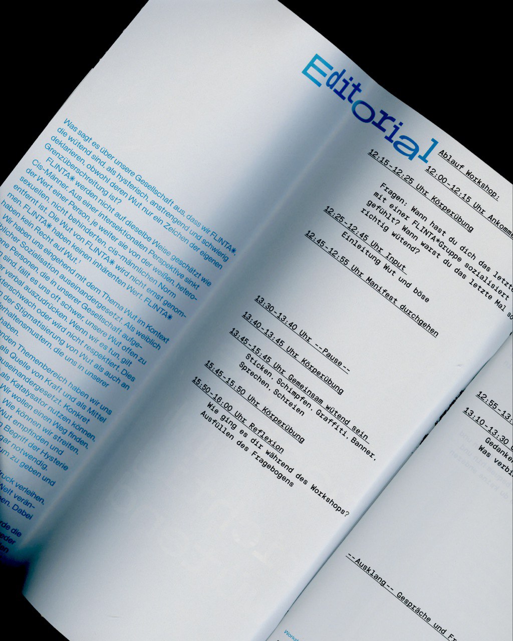 We researched anger in the context of female socialisation. The aim of our work is to make anger visible. FLINTA* who have changed the world are rarely described as angry, although anger was often their driving force. Due to gender-specific historiography, FLINTA* lack both anger role models and the opportunity to be seen as such themselves.