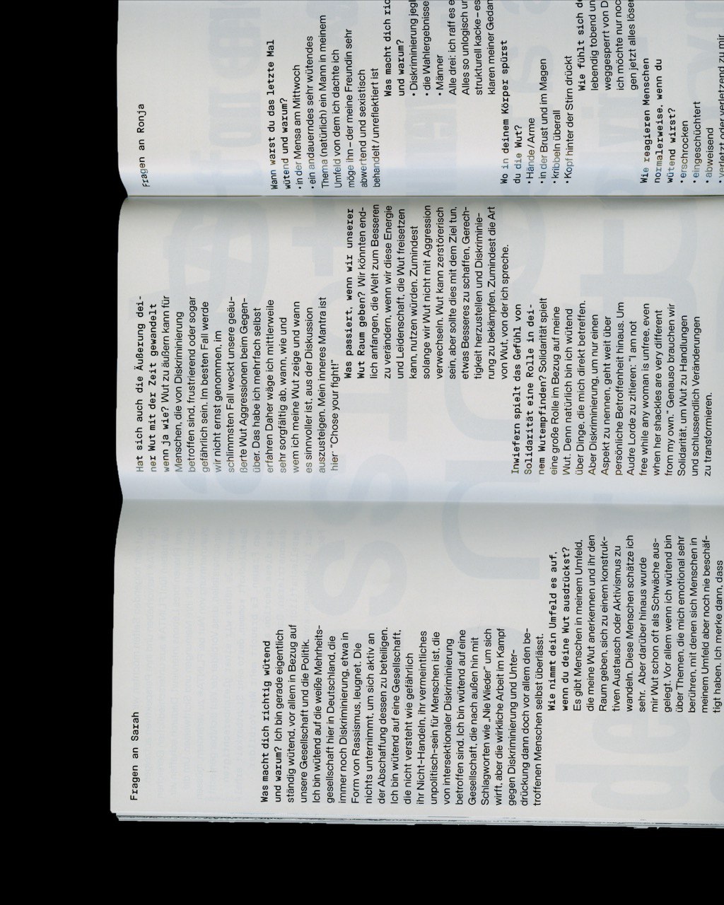 The publication Wuträume (spaces of / for anger) documents our exploration of the topic. It takes you through the workshops and guides you through the thoughts, statements and emotions of the participants. The publication is a workshop to take away.