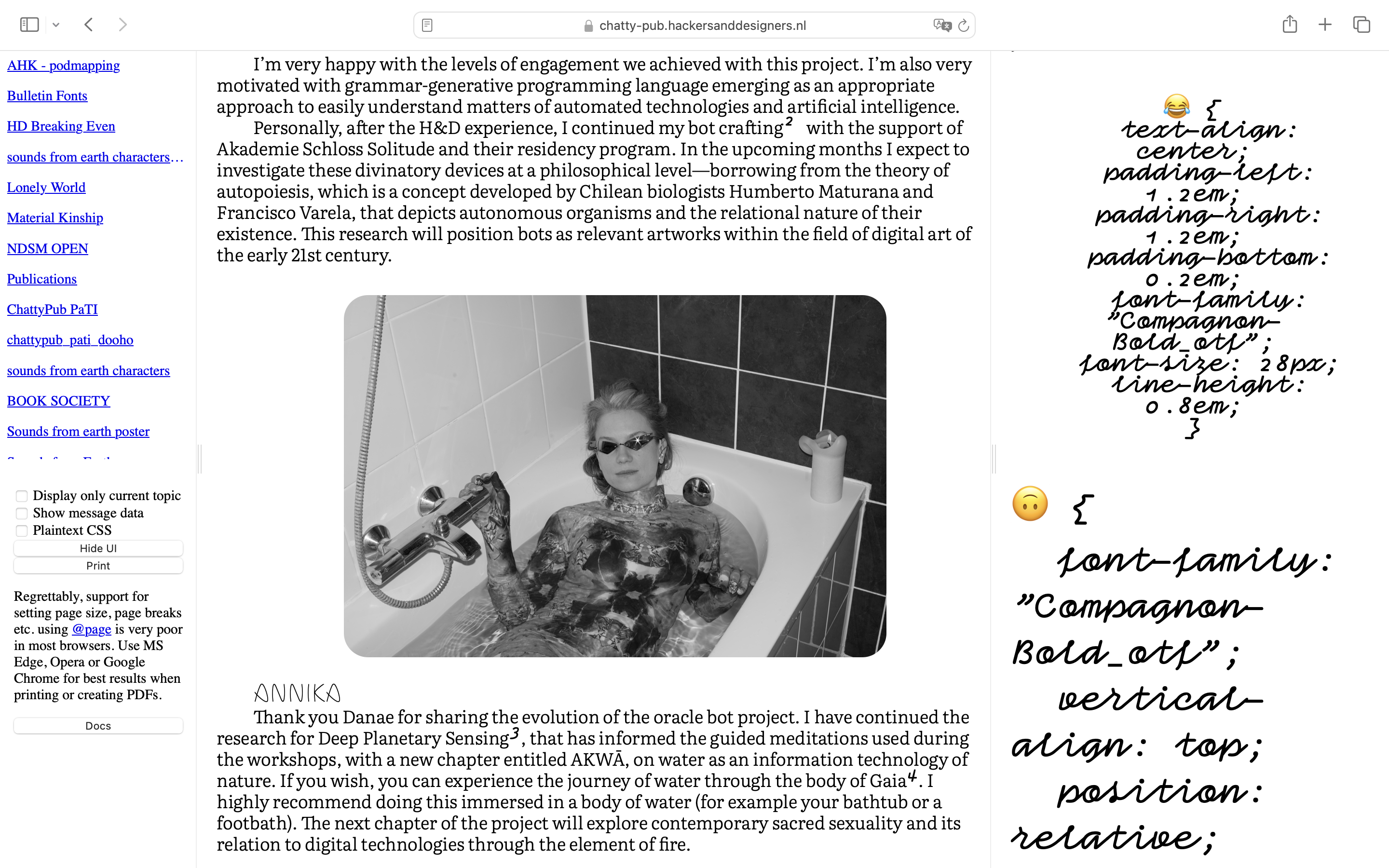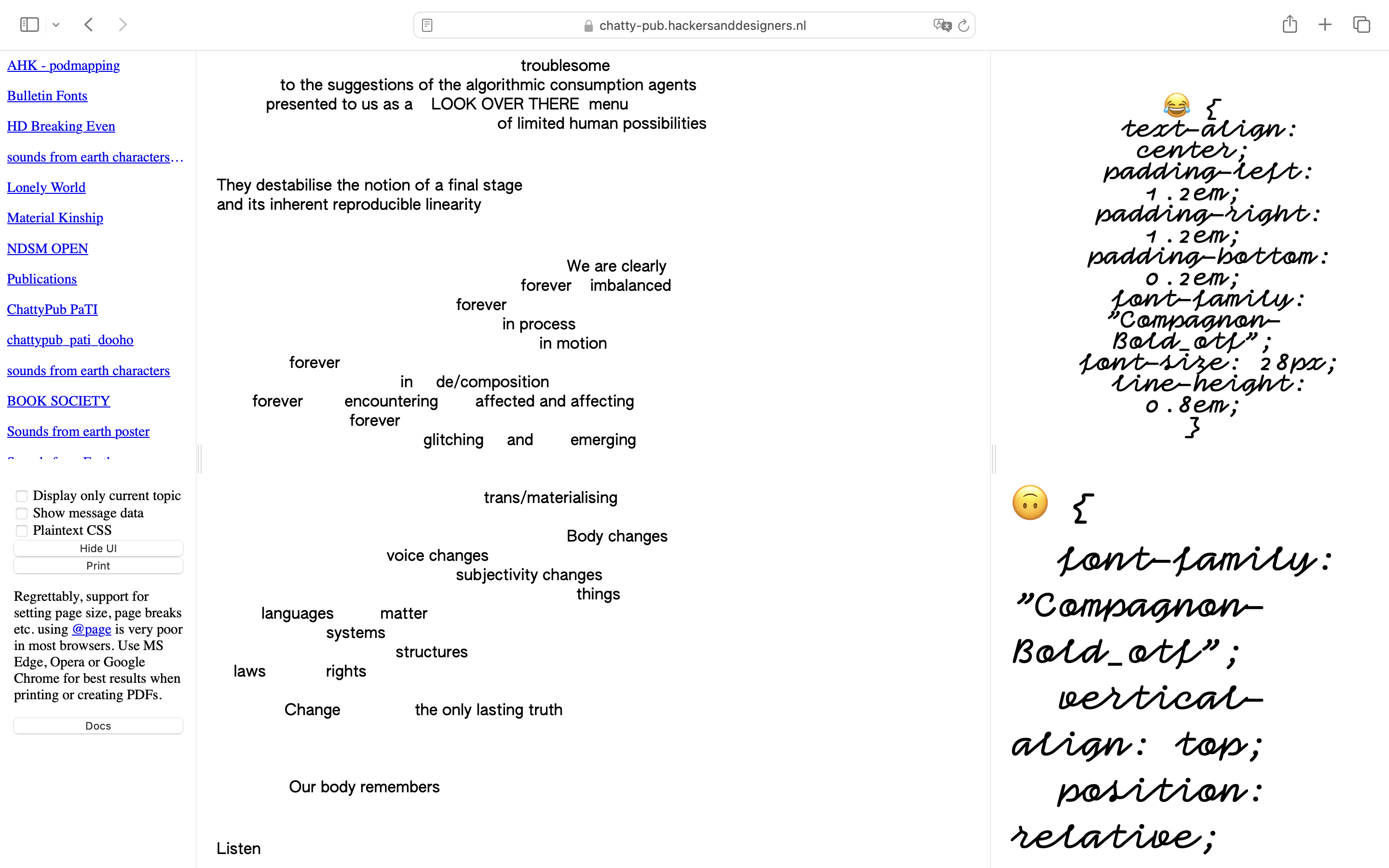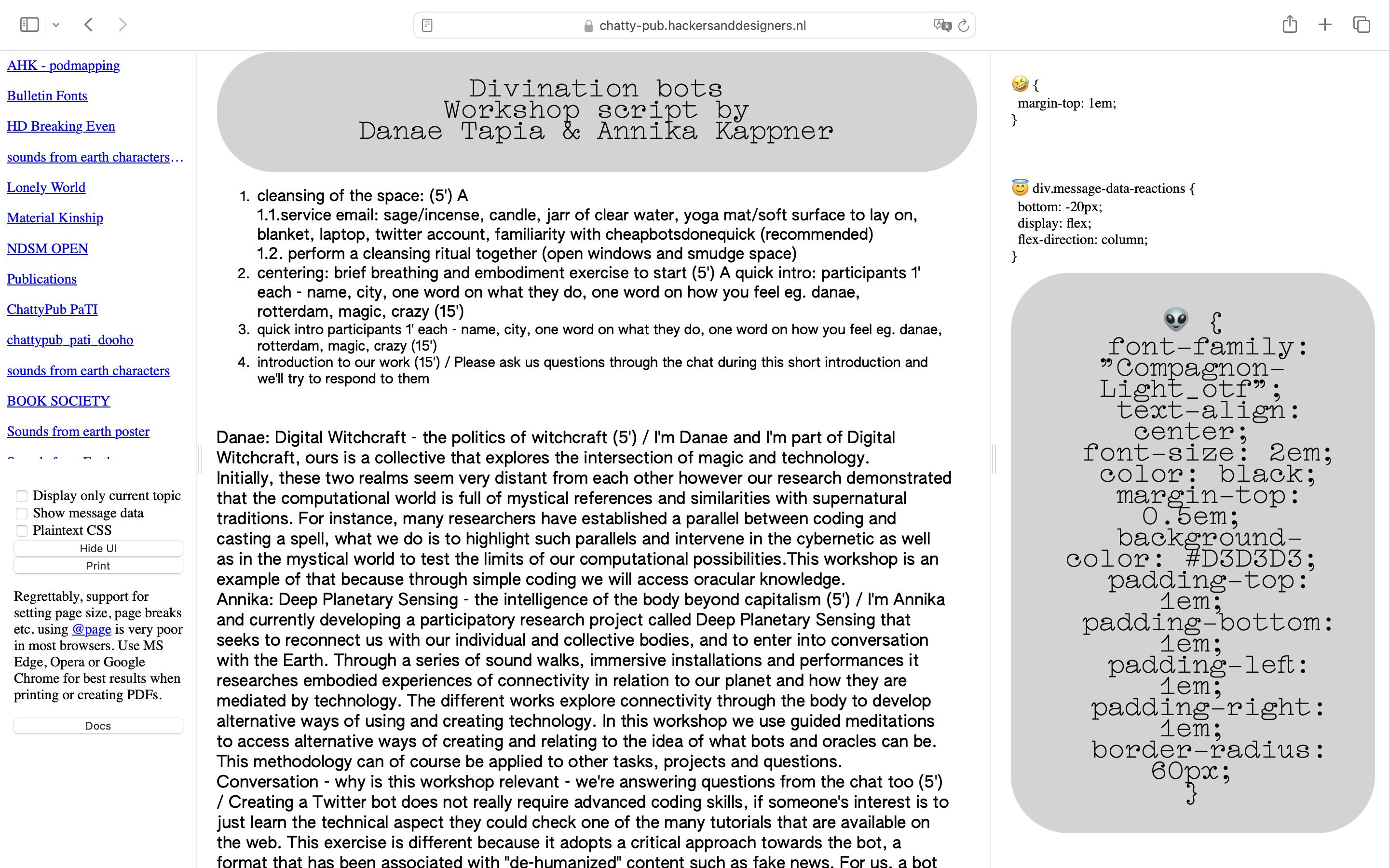 This publication was designed with ChattyPub, a self-made publishing tool leveraging an open source chat interface (Zulip) to apply css styles to the contributions. ChattyPub explores how a process of co-designing a publication unfolds in a chat environment, specifically when several people are designing and interfering at the same time. Through workshops H&D opened up the process of making this tool, and explores together with participants its possibilities and limitations.