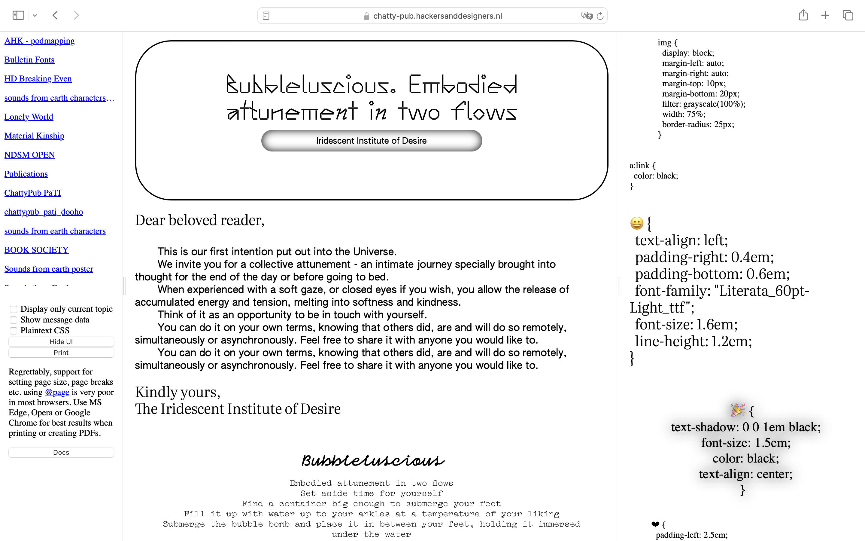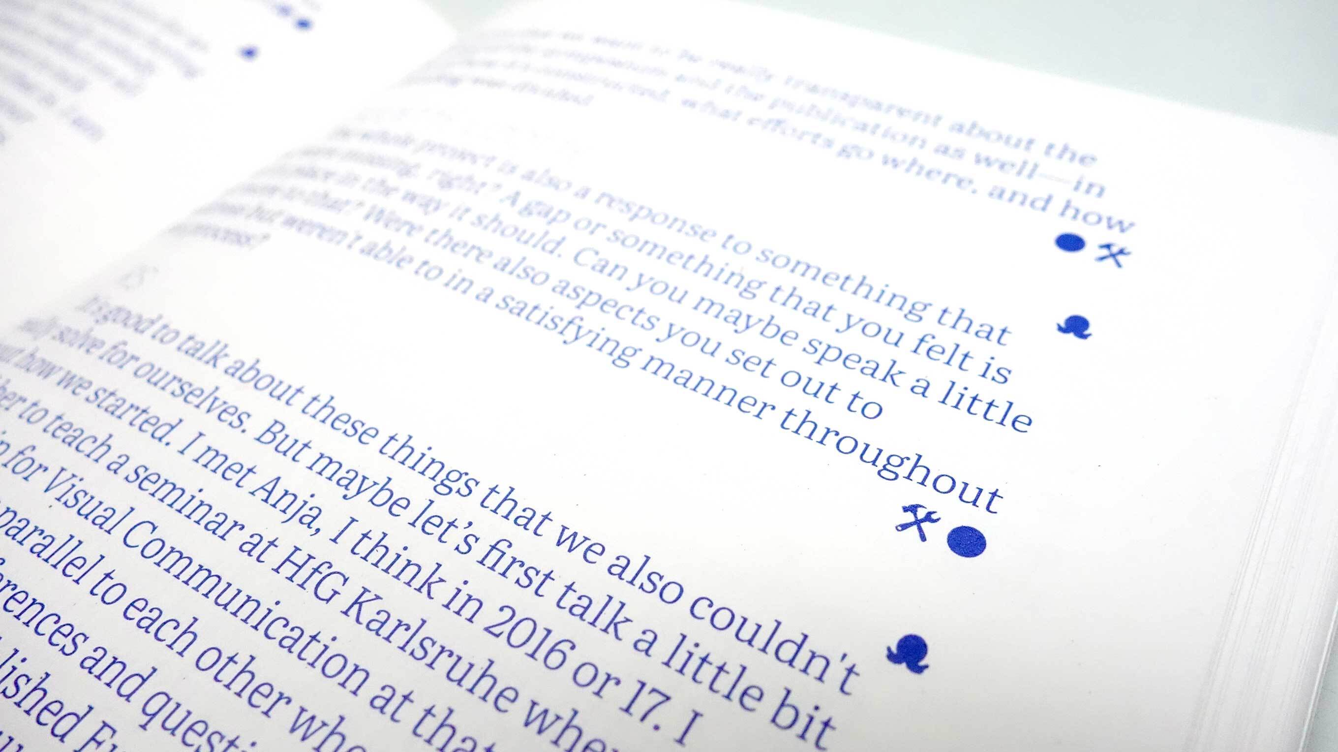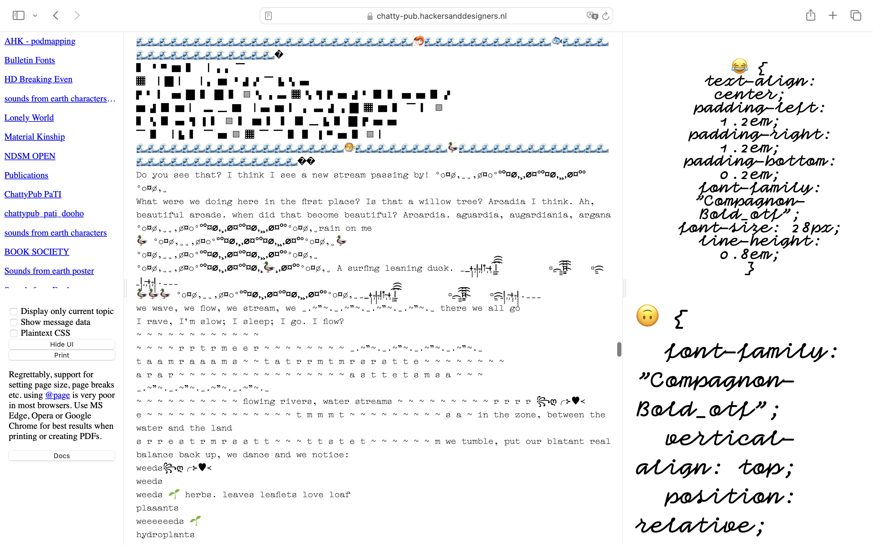 This publication was designed with ChattyPub, a self-made publishing tool leveraging an open source chat interface (Zulip) to apply css styles to the contributions. ChattyPub explores how a process of co-designing a publication unfolds in a chat environment, specifically when several people are designing and interfering at the same time. Through workshops H&D opened up the process of making this tool, and explores together with participants its possibilities and limitations.