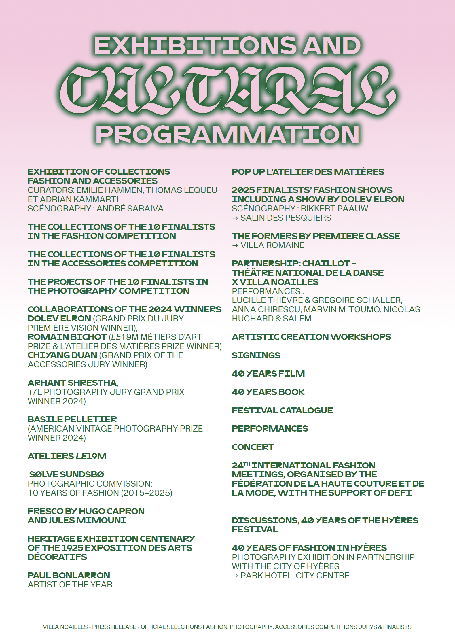 A springboard for young fashion designers since 1986, the International Festival of Fashion, Photography and Accessories – Hyères will hold its 40th edition from 16 to 19 October 2025 at the Villa Noailles. The jury for the three competitions – fashion, accesoires, and photography – includes Marine Serre, Jean-Charles de Castelbajac, Christian Louboutin, Alexandre Mattiussi, and Florence Tétier, among others. It was announced using Respira and Krasz. The additional informations and texts are set in Enduro.