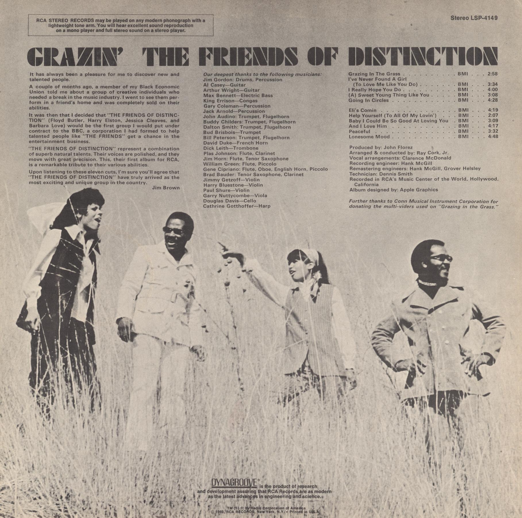 Grazin’ is the debut album by The Friends of Distinction, released in 1969 by RCA Victor. The album features the group’s biggest hit, “Grazing in the Grass”, a soulful vocal adaptation of Hugh Masekela’s instrumental hit, which became a Top 10 single on the Billboard Hot 100.