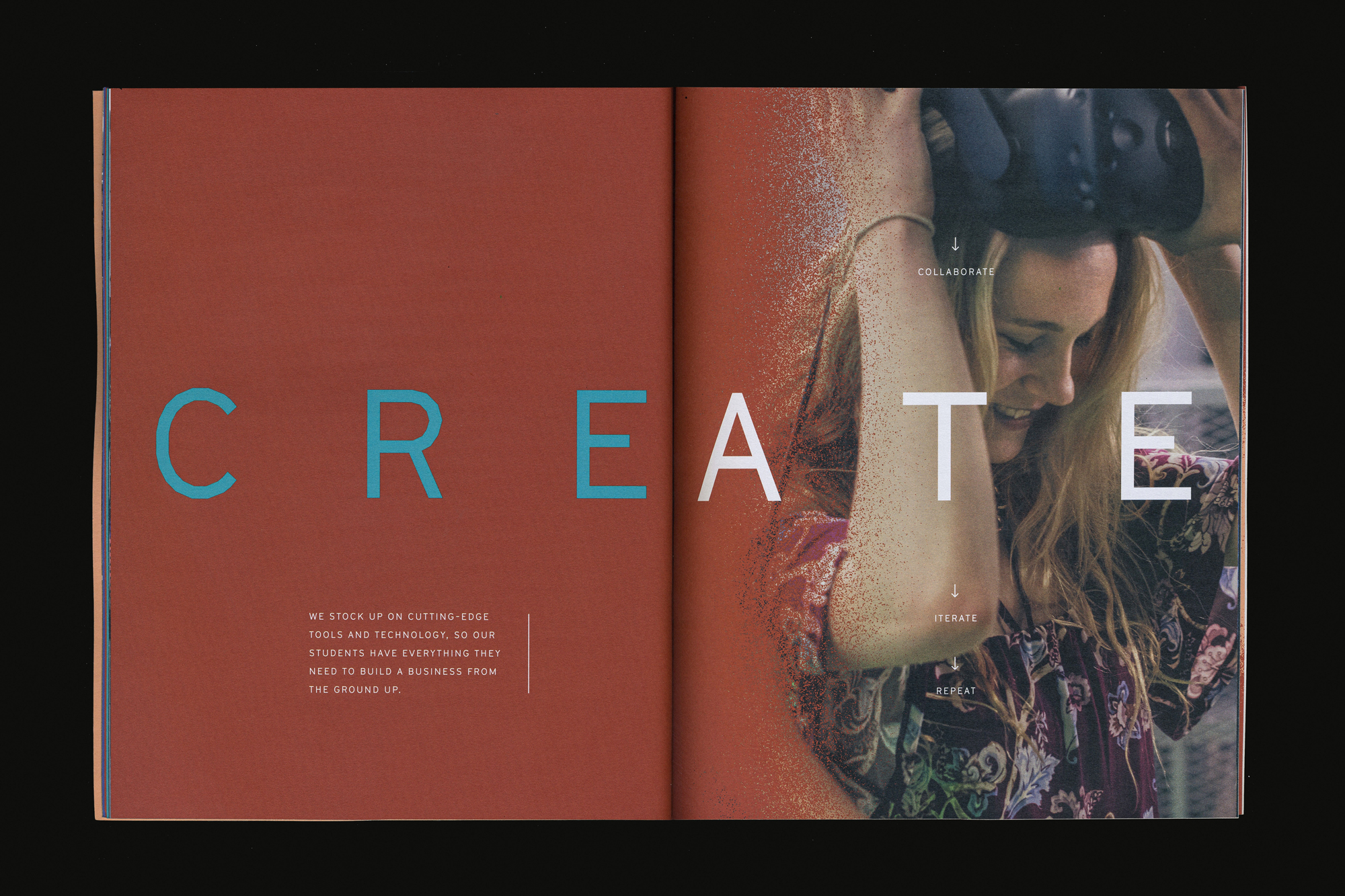 The prospectus featured four unique laser-cut outer layers, digitally printed in white and applied to the bound book body. These were produced onsite at The Garage and affixed during the print run at Graphic Arts Studio. Short sheets featuring photography of successful alumni were inserted throughout adding depth and dimension to the format and information.