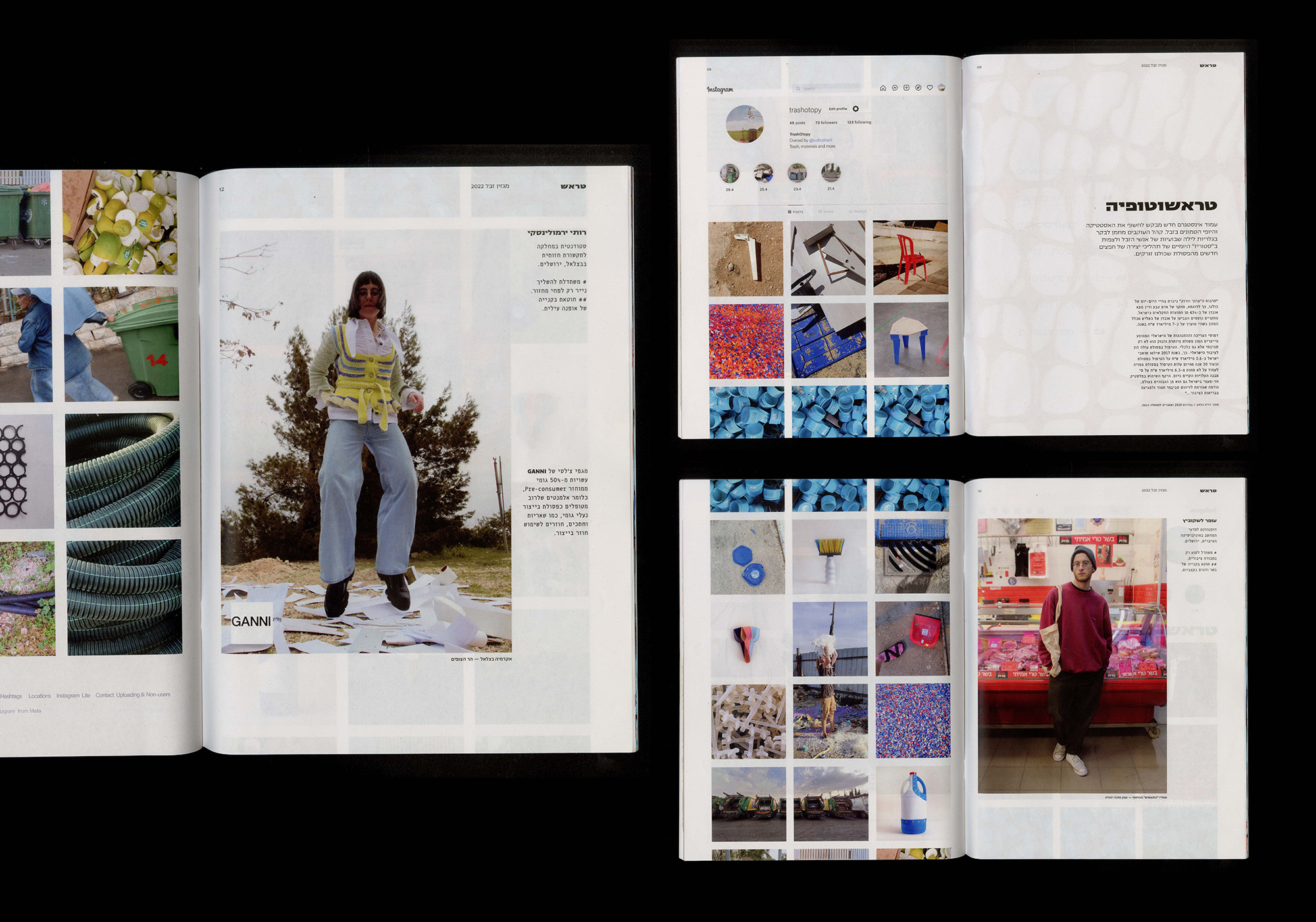 The magazine brings together various street actions involving people carrying trash, documentation from an Instagram page, on-site and remote interviews, photographs, reflections, poems, and sketches. In fact, the magazine is the project itself: on one hand, it documents the project and its evolution, and on the other, it disseminates the idea that “there is no such thing as trash,” operating under two distinct roles.
