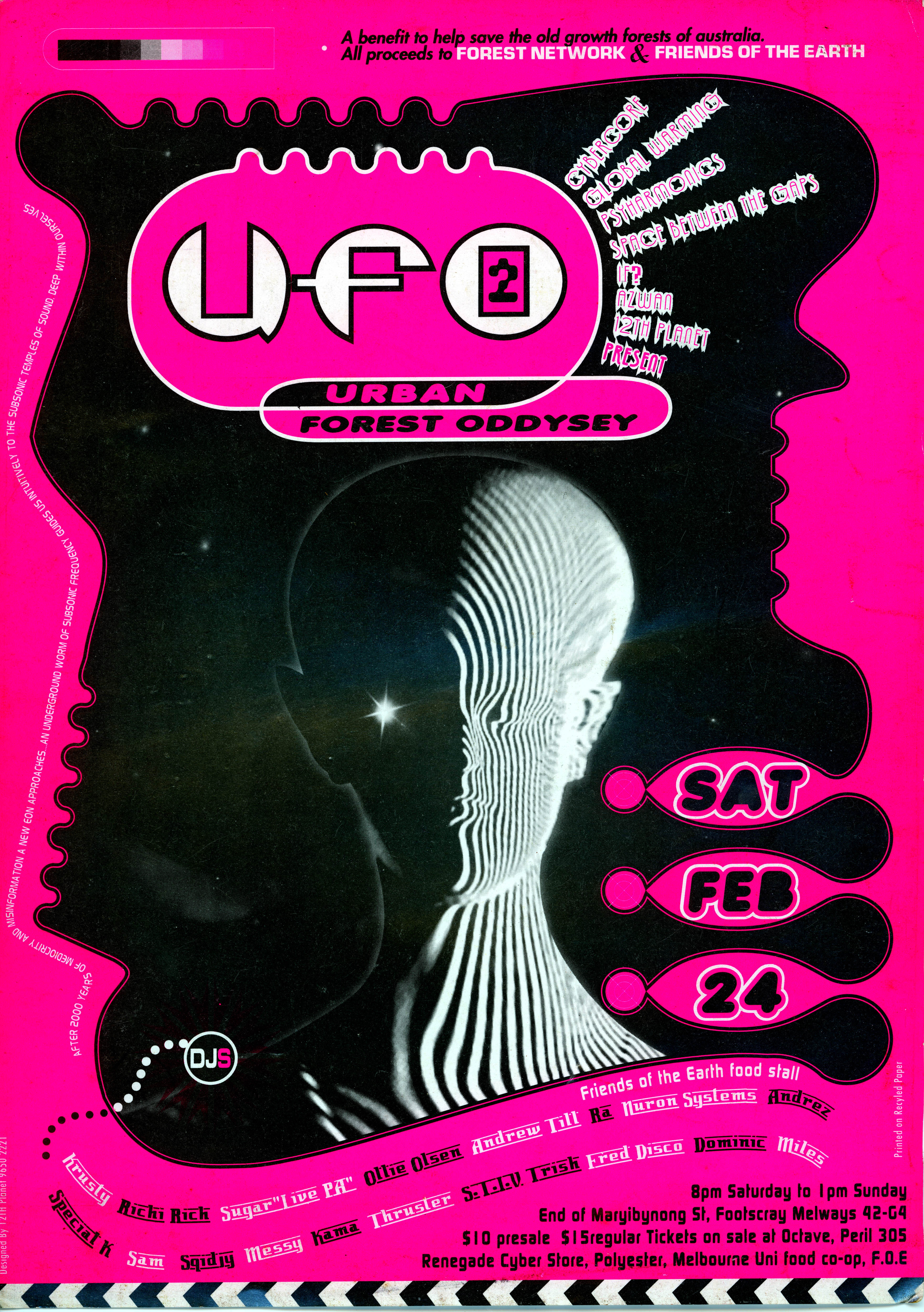 A flyer for Urban Forest Odyssey 2, a “doof” (outdoor rave) held in Melbourne, Australia, on 24 February 1996. The design is credited to 12th Planet.