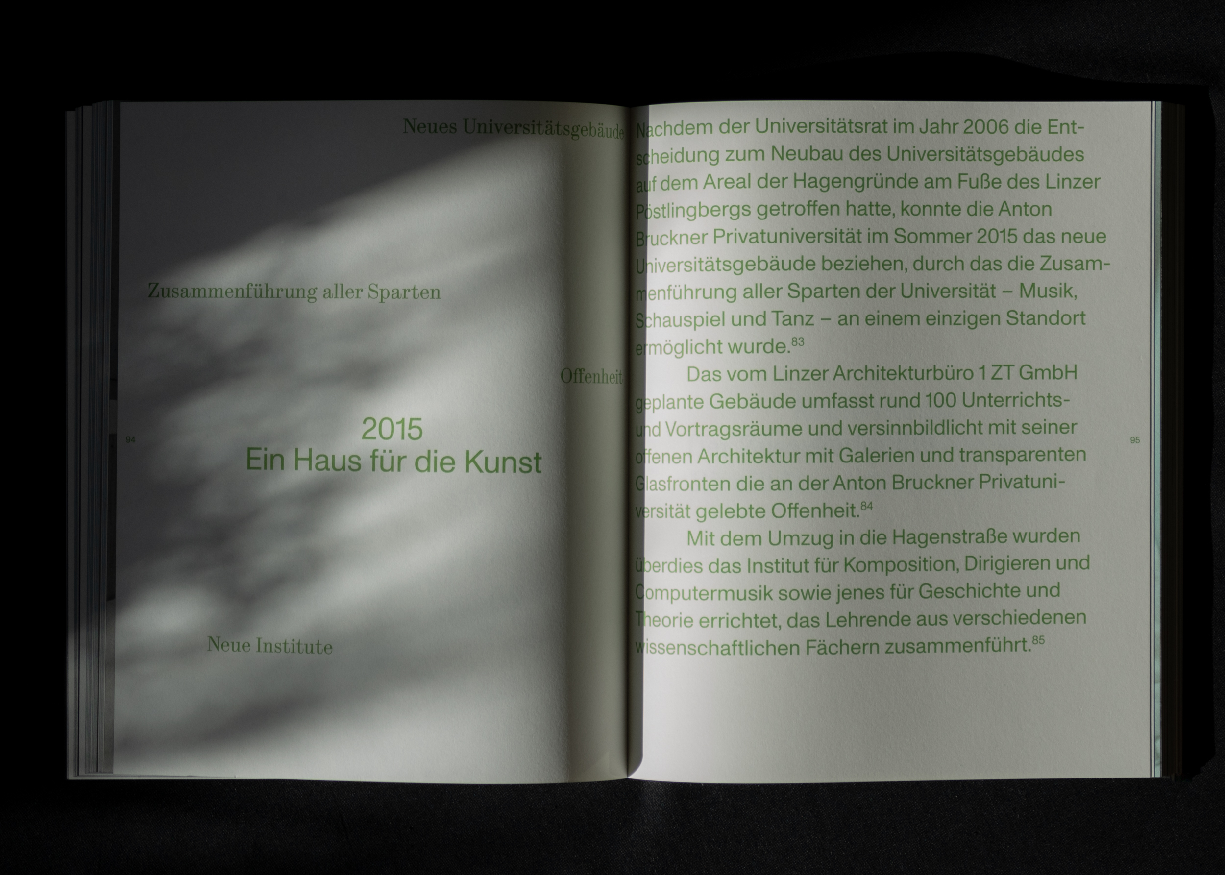 These narratives unfold in a visual crescendo – starting with a single word, evolving into condensed thoughts, and culminating in an analog photo series that captures the institution’s ever-changing story. Historical intermezzi serve as structural pauses, interweaving key facts and milestones of the journey of the Anton Bruckner University.