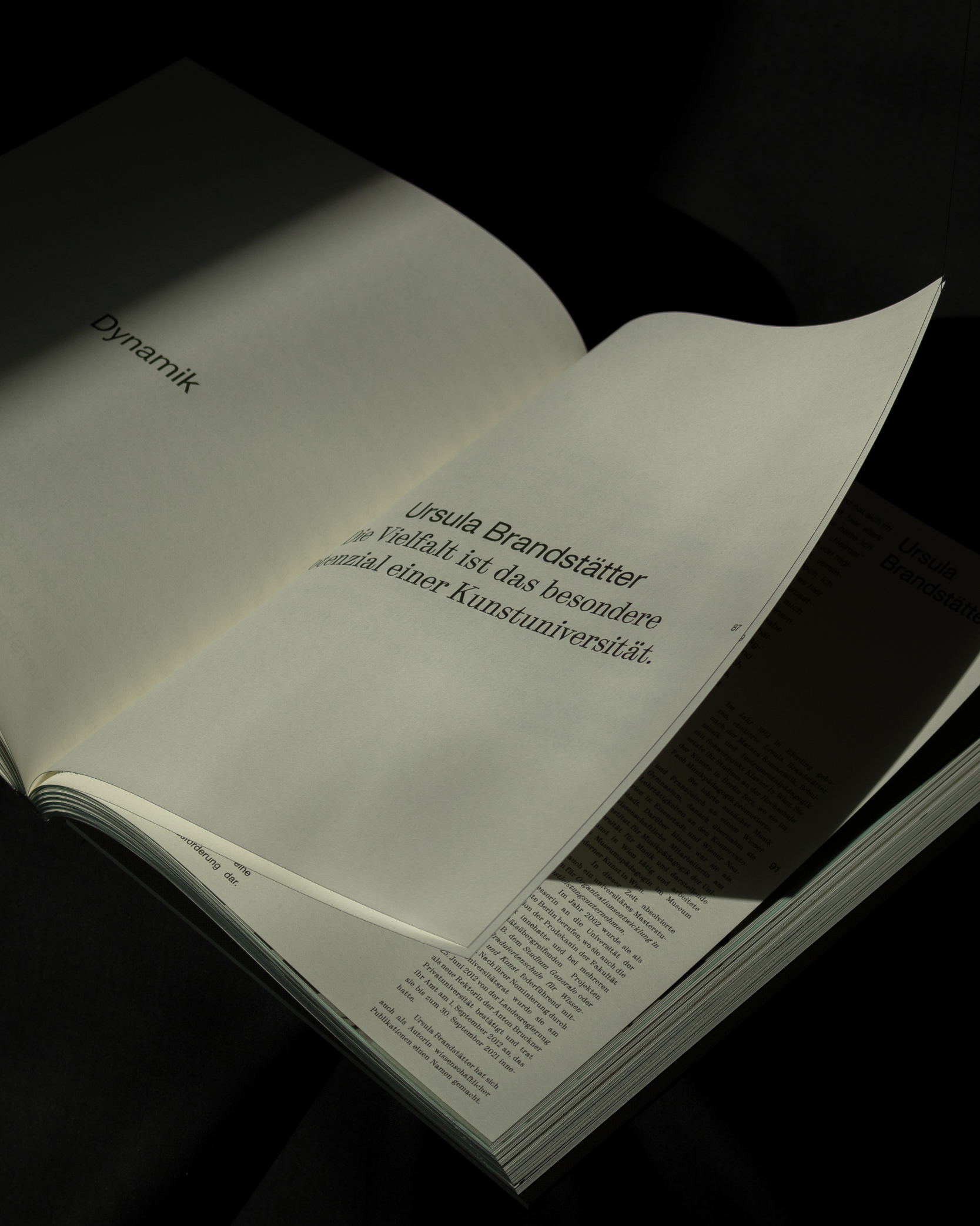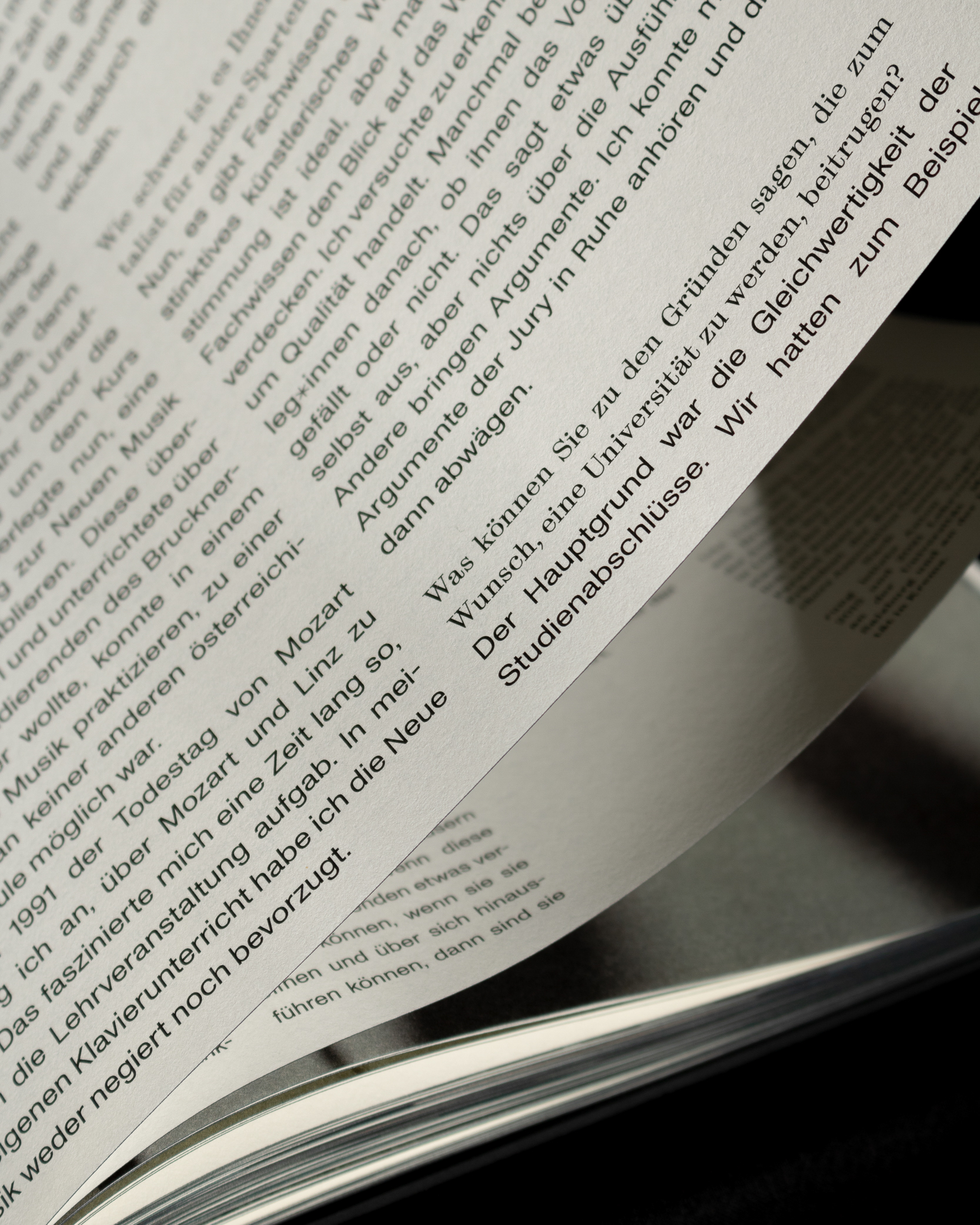 The typography is defined by the interplay of ABC Synt and ABC Monument Grotesk, both from Dinamo. Synt, with its precise, parametric rhythms, evokes the staccato-like pattern of musical notes, reinforcing the visual dynamism of the publication. In contrast, Monument Grotesk conveys a sense of permanence with its bold, monumental letterforms. Together, these typefaces embody the balance between tradition and innovation, lending the publication a distinctive, contemporary aesthetic.