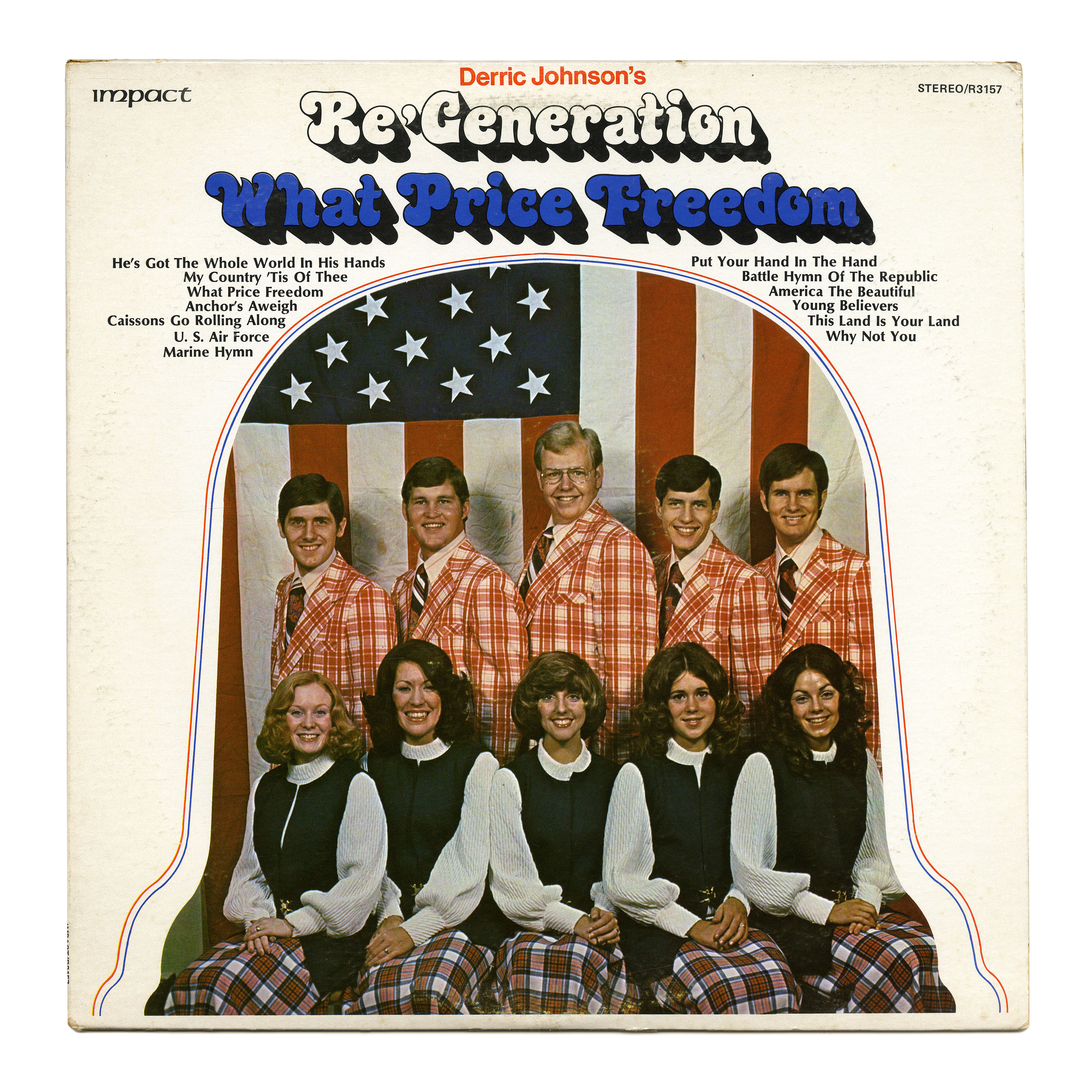 Re’Generation was a soul/gospel touring ensemble of a cappella singers founded and led by Derric Johnson, and active from 1970 to 1983. This album from 1972 comes with a cover designed by Bob McConnell, featuring photography by Bill Grein and a bichromatic use of Swinger Shadow, designed by Ray Cruz for Schaedler. The track names in Optima Bold are arranged around the top of the bell that encloses the photograph.