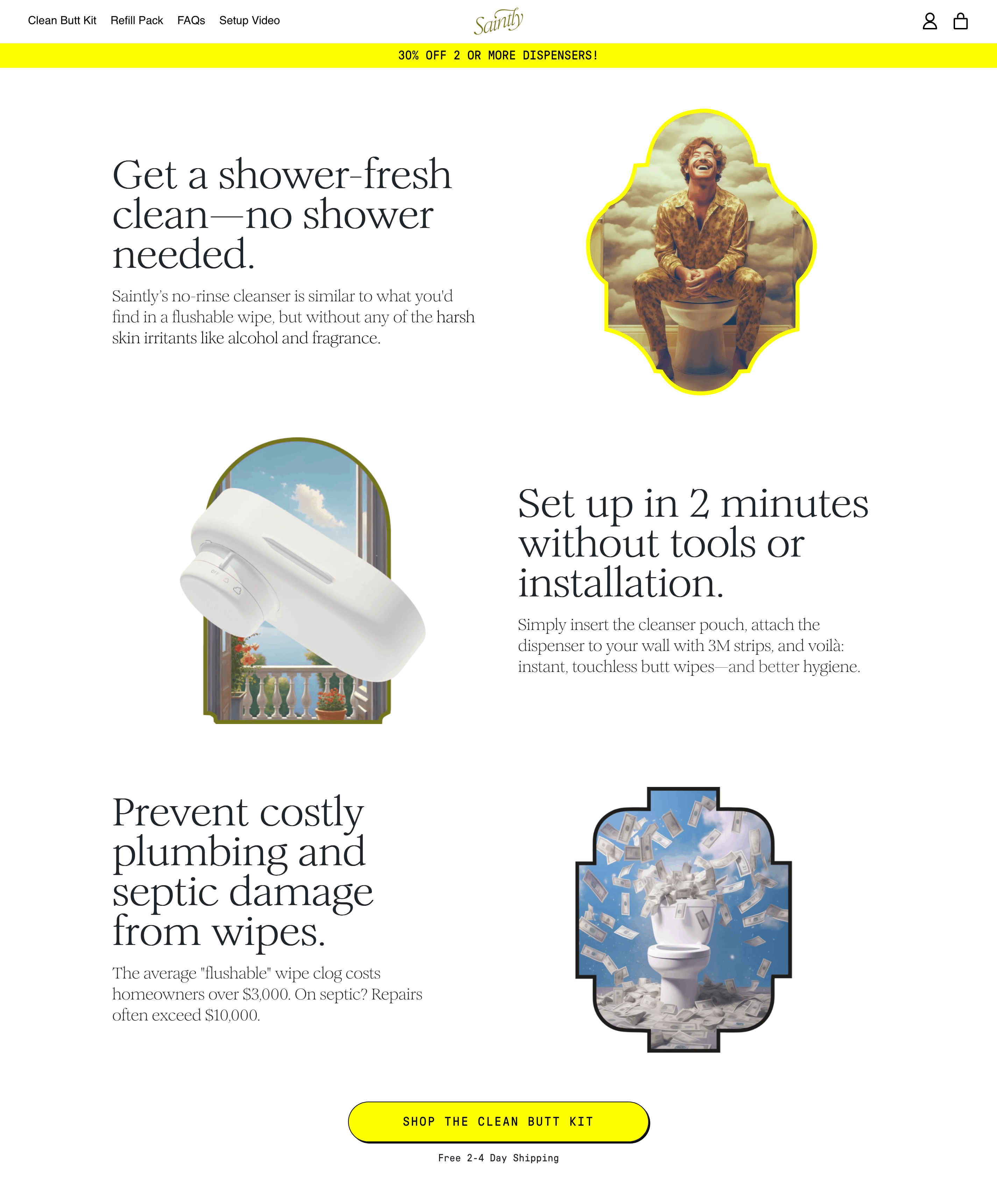 Saintly is on a mission to lead the world to a cleaner future from behind. They are reimagining the personal care and toilet hygiene space starting with a cleansing foam dispenser that serves as a flushable wipe upgrade. With the cheeky belief that “cleanliness is next to godliness” and a promise to deliver “that new butt feeling, every time,” Saintly redefines the category with a Renaissance-inspired aesthetic that turns the everyday bathroom routine into a ritual of confidence.
