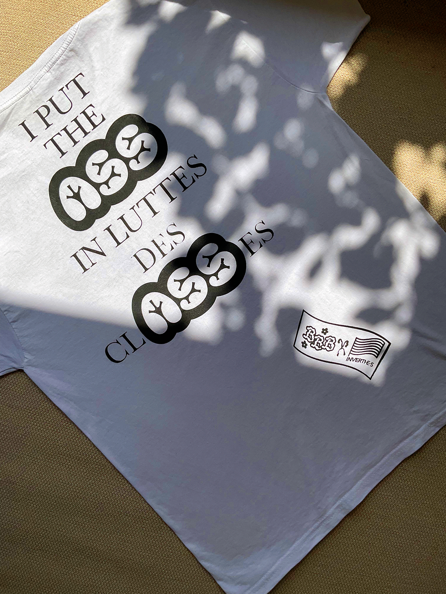 In the context of the French legislative elections of 2024, Bye Bye Binary*, a French-Belgian collective for post-binary typography, organized a T-shirt printing workshop along with the communist queer collective Les Inverti·es. The phrase “I put the ASS in lutte des clASSes” (“I put the ASS in clASS war”) is set in the Lobular typeface by Ariel Martín Pérez, which was chosen by the T-shirt designer H·Alix Sanyas because of its voluptuous lettershapes. The additional typeface is some version of Baskerville.