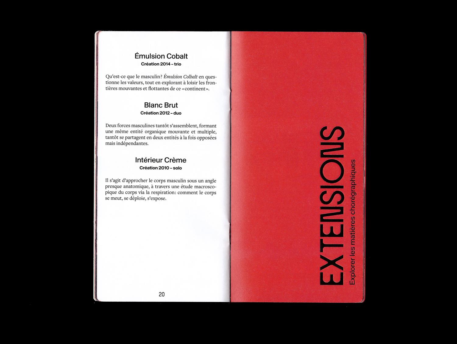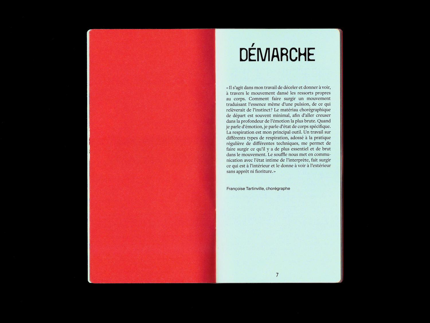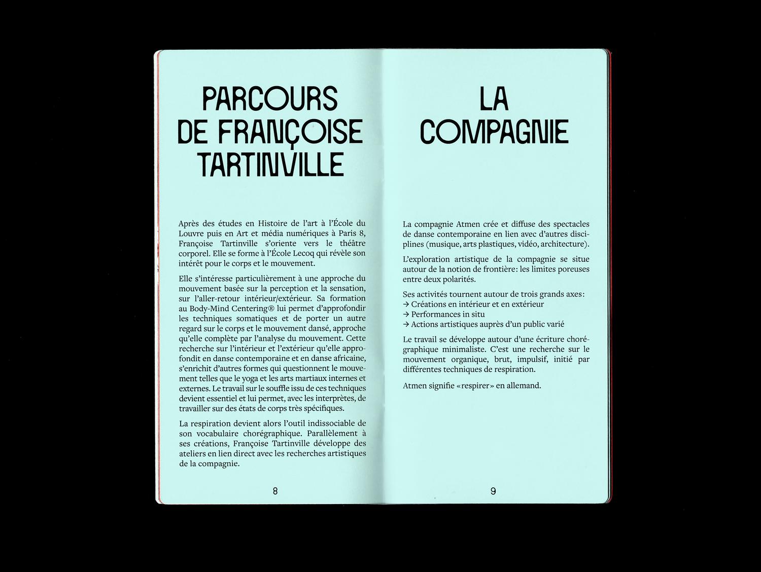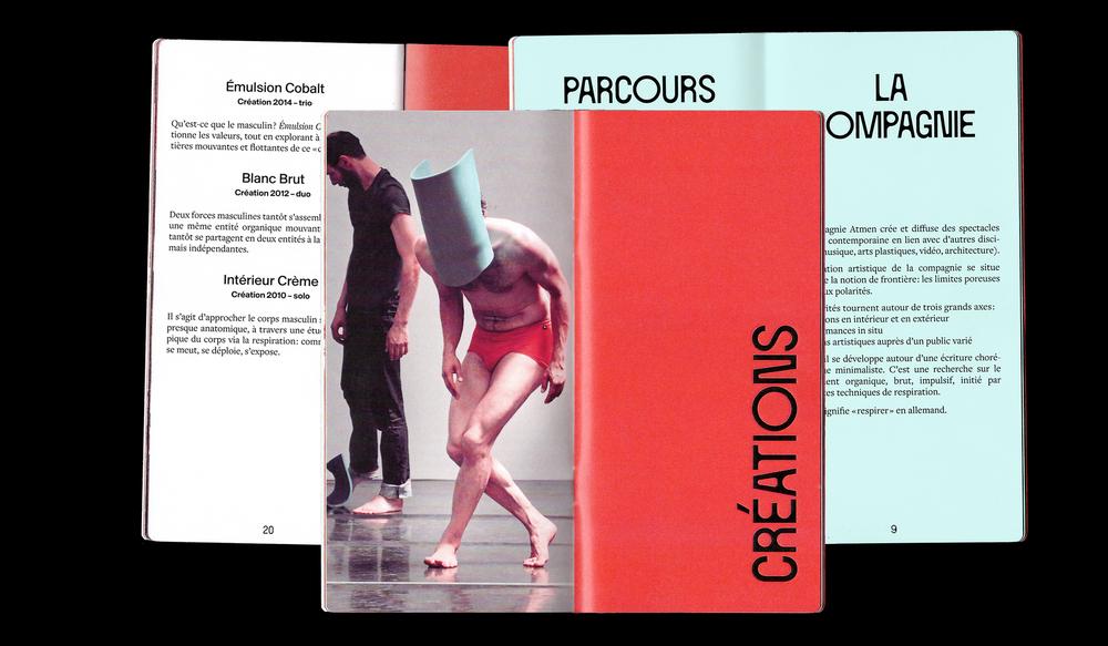 Jeanne Triboul designed a program brochure for the dance company Atmen, which wanted a publication to present itself and showcase its creations. The company, which creates a dialogue between contemporary dance and historical heritage in its performances, finds expression here through the combination of a traditional serif typeface – Freight Text – and two contemporary ones: Circule and a yet unidentified grotesk. The provided images, which varied in quality and nature, were color-corrected to create a harmonious look throughout the publication.