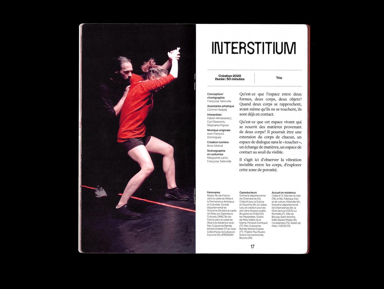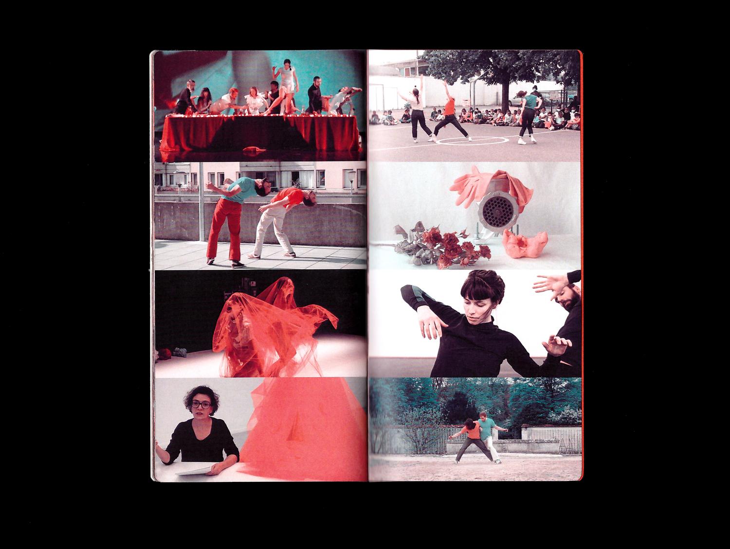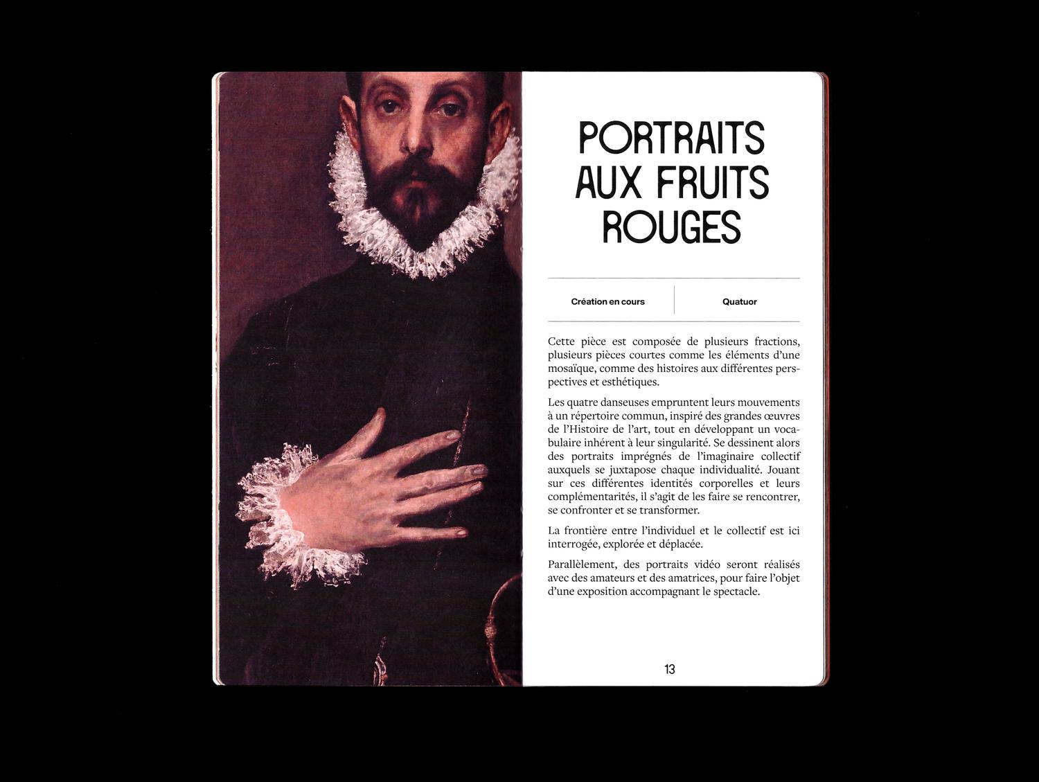 Jeanne Triboul designed a program brochure for the dance company Atmen, which wanted a publication to present itself and showcase its creations. The company, which creates a dialogue between contemporary dance and historical heritage in its performances, finds expression here through the combination of a traditional serif typeface – Freight Text – and two contemporary ones: Circule and a yet unidentified grotesk. The provided images, which varied in quality and nature, were color-corrected to create a harmonious look throughout the publication.