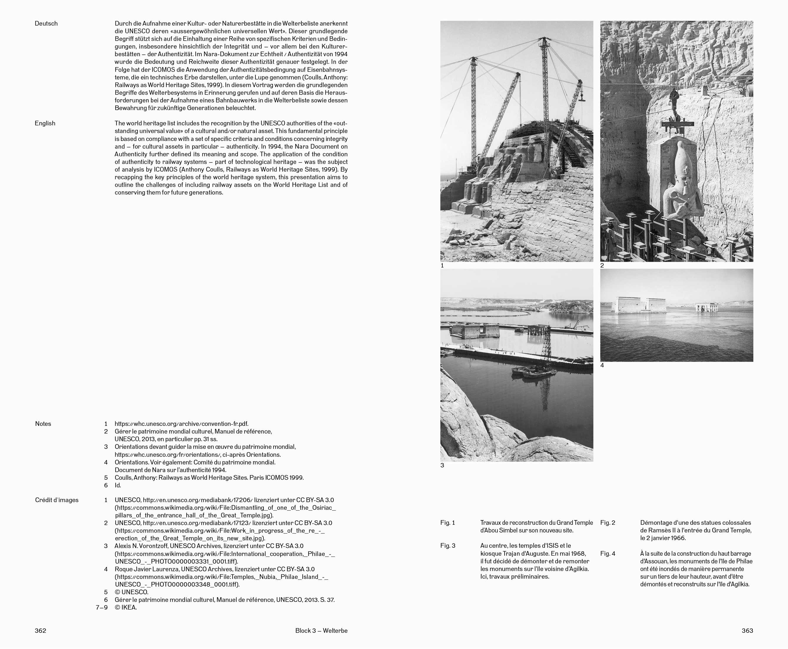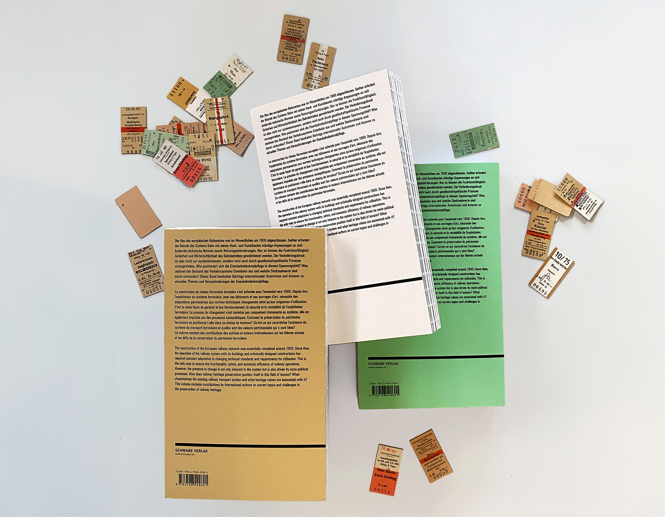 Eisenbahndenkmalpflege – Préservation du patrimoine ferroviaire – Railway Heritage Preservation was published by Schwabe Verlag and designed by Huber/Sterzinger and Miloš Gavrić. The book was printed by Merkur Medien on Werkdruck and Bierdeckelkarton papers by Fischer Papier. Texts in German, French, or English, with translated abstracts.