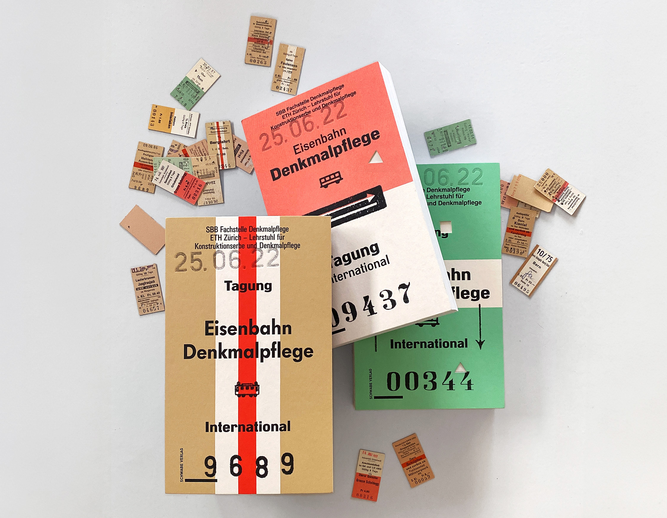 The trilingual texts and the titlings in the sewn-bound volume with 460 pages are typeset with the regular and black cuts of Neue Moderne Grotesk FSL, while the cover variants reference a typographic hodgepodge of Neue Moderne Grotesk FSL, Futura, Helvetica and Univers Condensed, plus some unidentified numerals and color patterns found in typical mid-1900 Swiss railway tickets. In a wider context the format of the book (170×280 cm) references the typical Edmondson railway ticket that has been in use from 1840 until recently in countries all over the world. This also resonates with the international contributions about the topic of the railway heritage preservation (excerpt from the Schwabe Verlag):