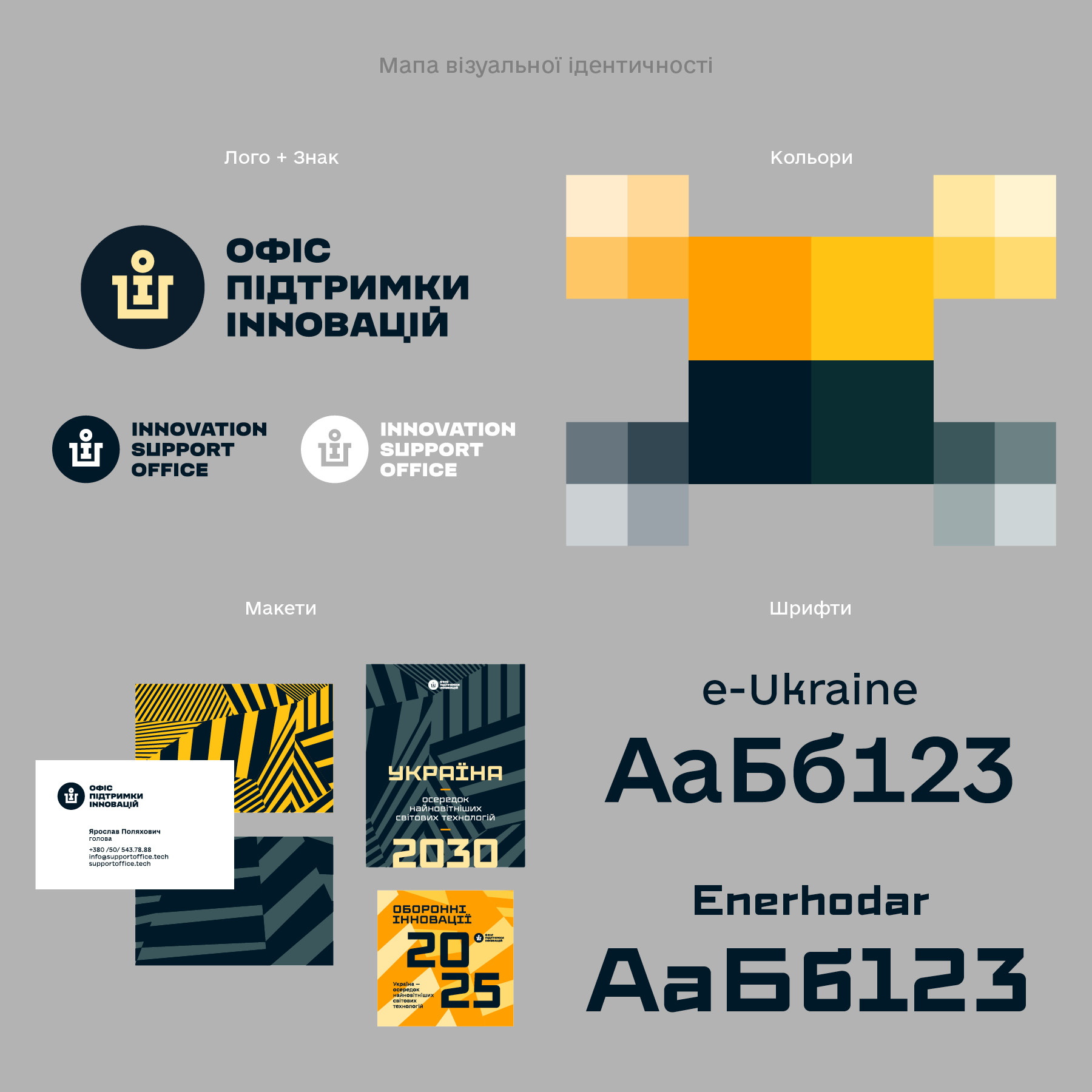 One of Bulanov büro’s first projects in the year 2025 was the development of a visual identity for Ukraine’s Innovation Support Office (Офіс підтримки інновацій).