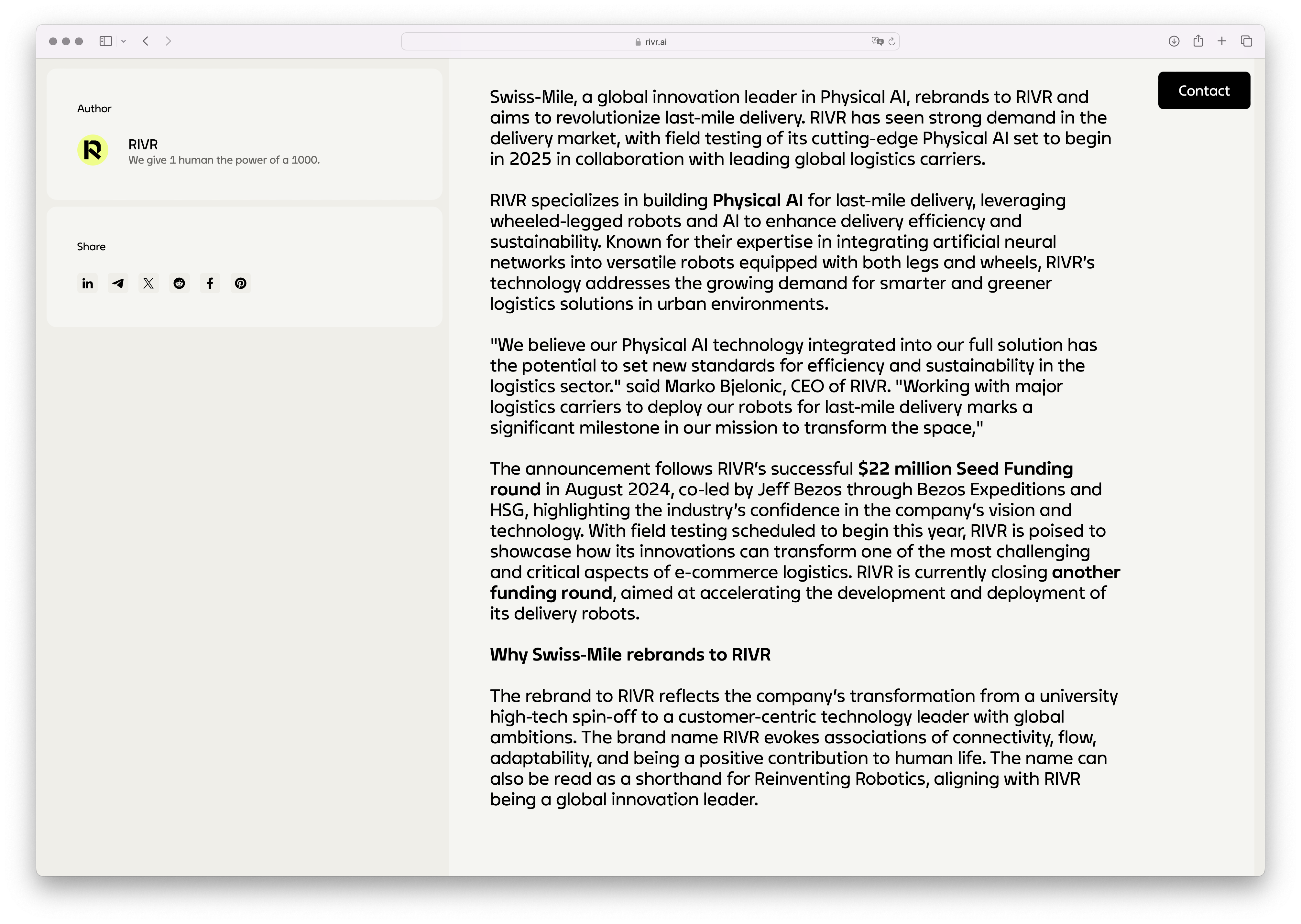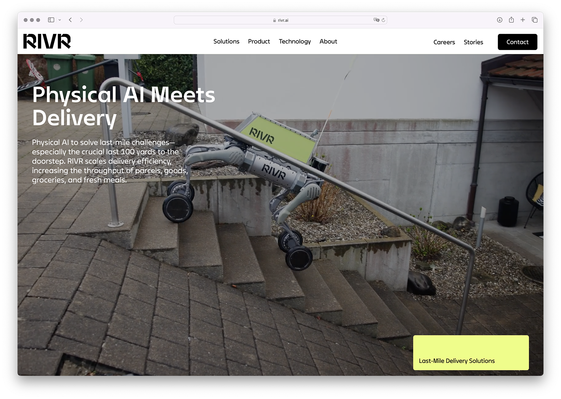 RIVR is redefining last-mile delivery—bringing parcels, goods, groceries, and fresh meals straight to your doorstep. Powered by General Physical AI, RIVR enables faster, safer, and more sustainable delivery at scale.