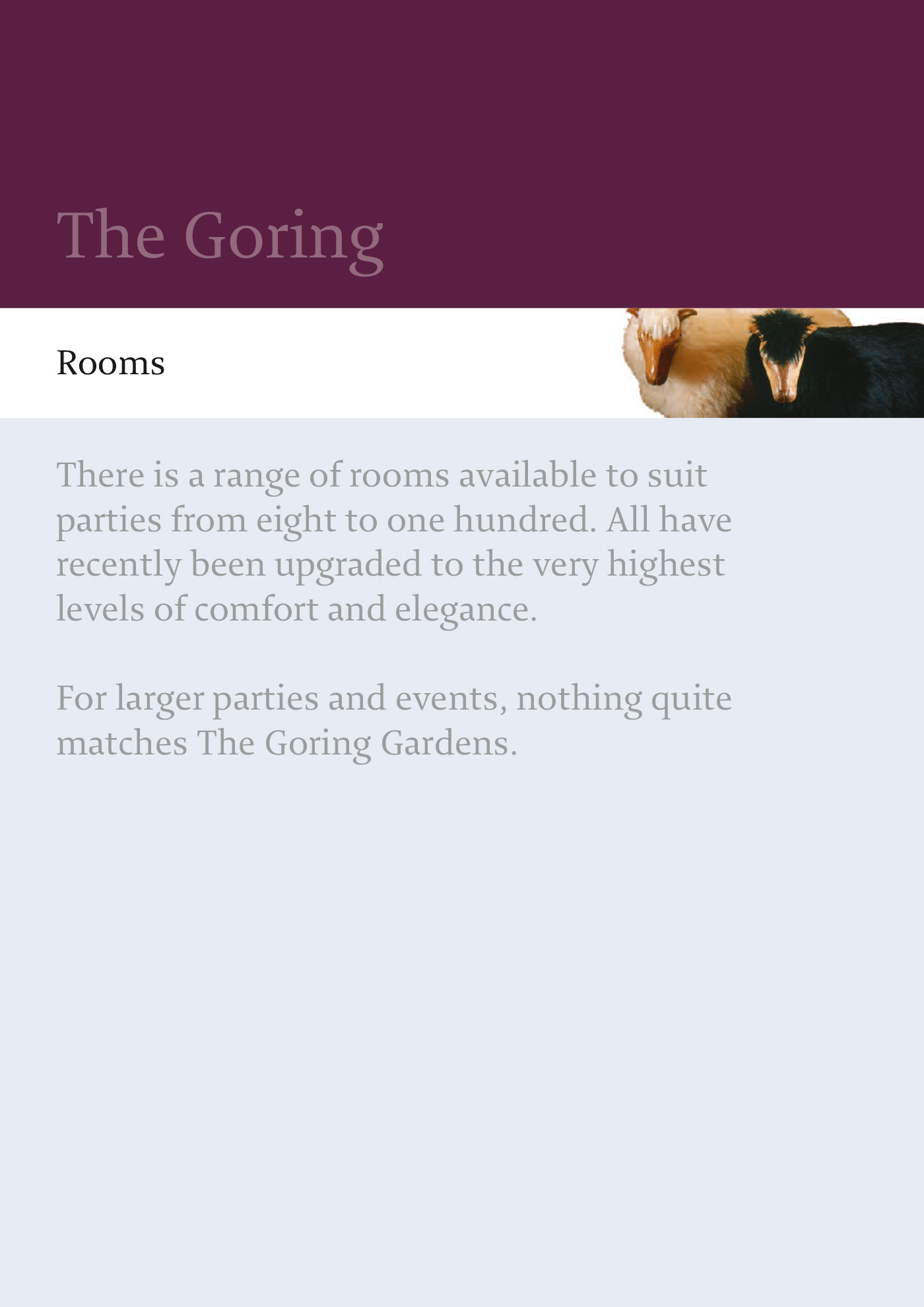 The Goring is an historic luxury hotel in London. Jeremy Tankard’s distinguished Enigma was chosen as the typeface for the visual identity — an appropriate choice for The Goring’s style, which encompasses “an Englishness, traditional yet entirely in tune with the 21st century.”