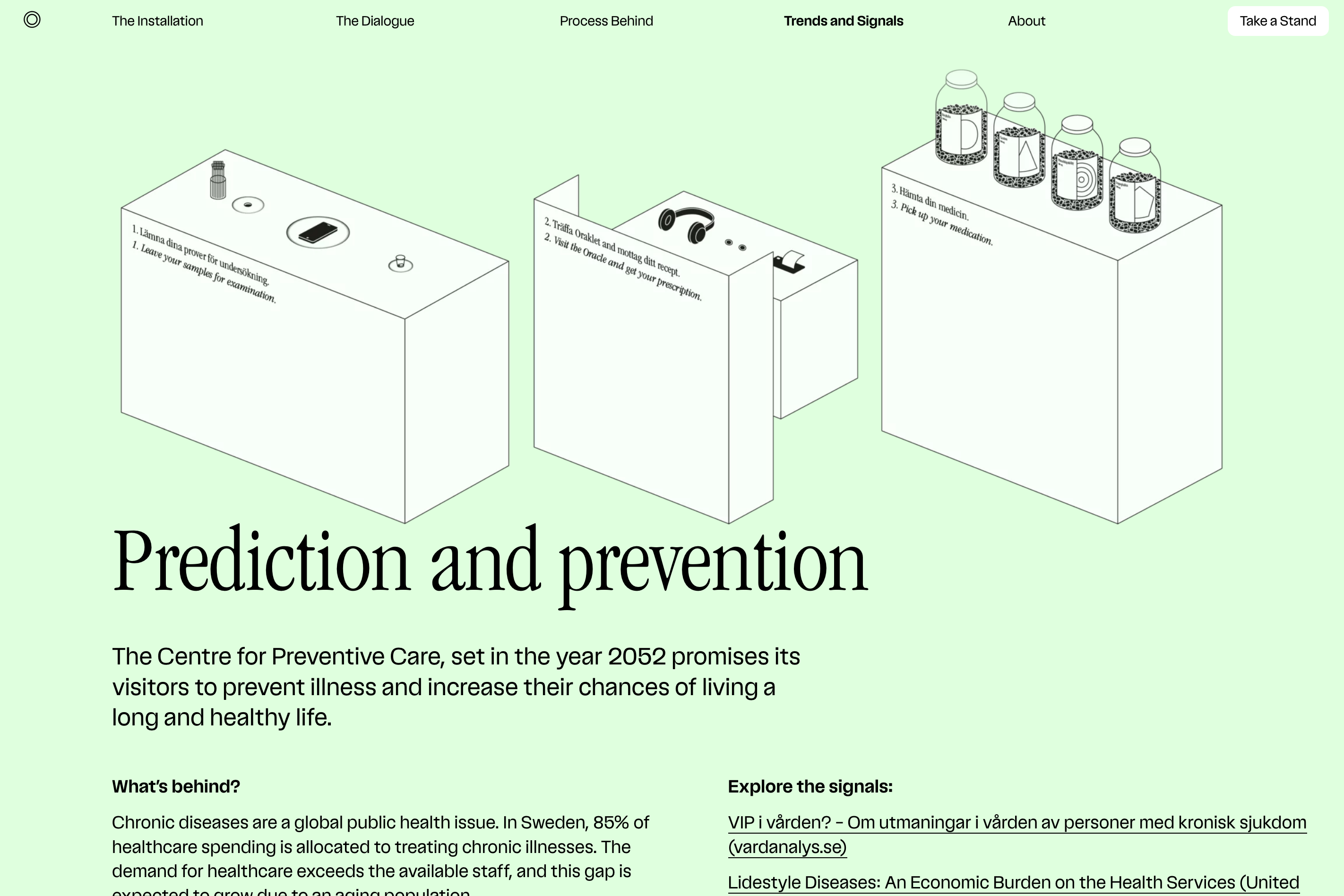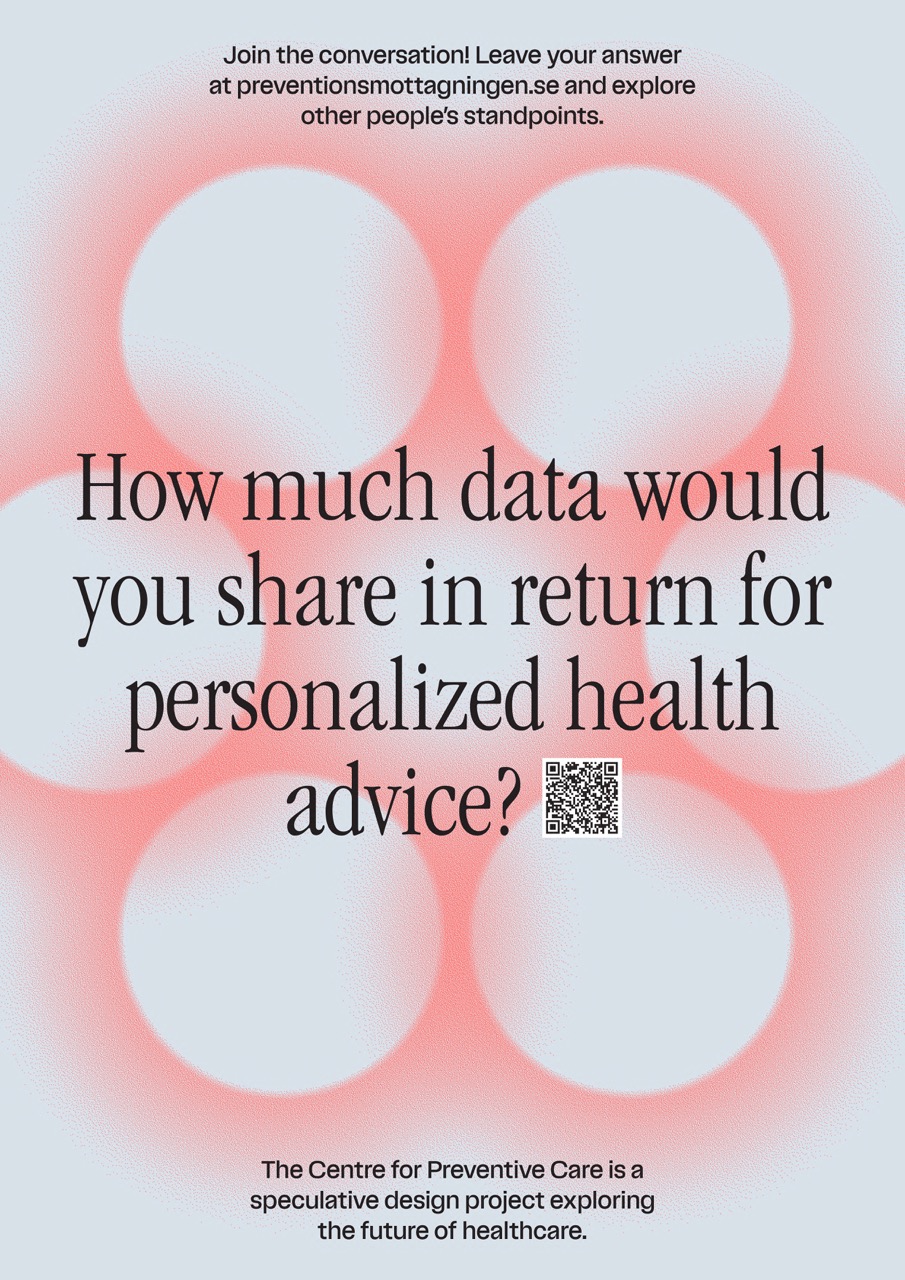 The Centre for Preventive Care is a speculative design project exploring the future of healthcare. In November 2022, the Centre for Preventive Care, set in the year 2052, opened its doors for a week inside the main entrance of Stockholm’s Södersjukhuset hospital.
