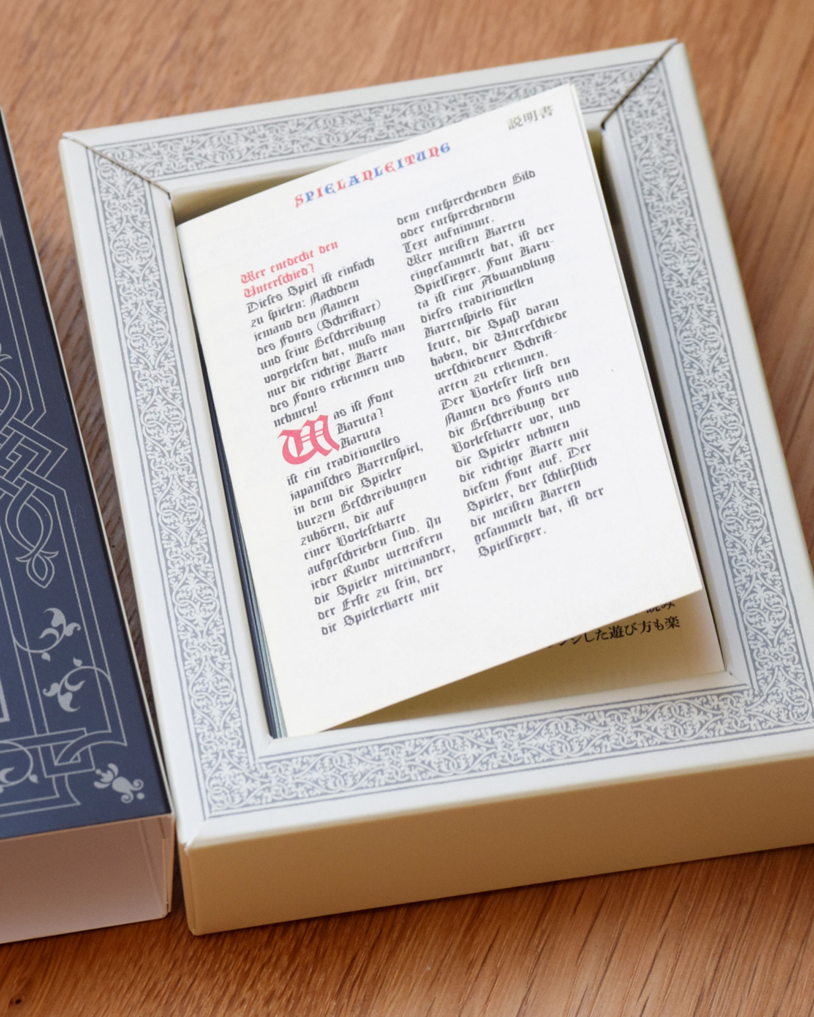 Font Karuta is a variation designed for typography enthusiasts. Instead of pictures, the reader announces the font name and description on the reader’s card, and players compete to pick up the card displaying that font. The player who collects the most cards wins the game.
