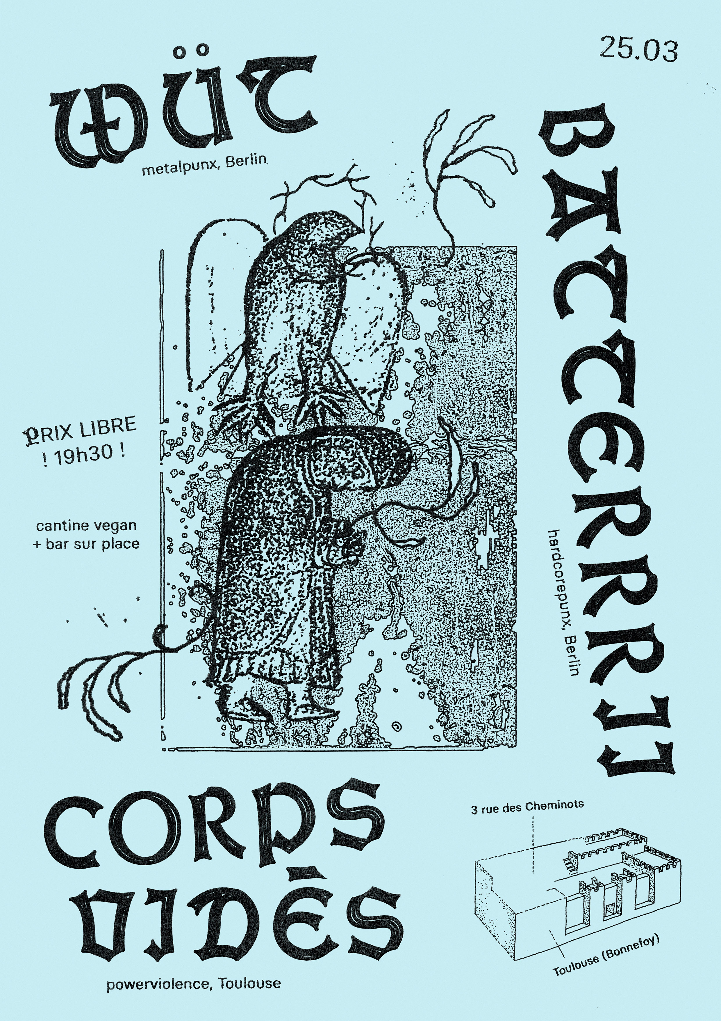 WüT, Batterrrii, Corps Vidés concert flyer Contributed by Ludovic Boy on Jun 15th, 2025. Artwork published in March 2025. Source: www.instagram.com License: All Rights Reserved. Flyer for a punk/hardcore show with WüT, Batterrrii, and Corps Vidés which took place on the 25th of March in Toulouse, at Atelier des Cheminots. Typefaces More about Weiß-Gotisch InitialenGet Weiß-Gotisch InitialenMore about BasierGet BasierMore about AneirinGet Aneirin Formats Posters/Flyers (5760) Topics Event (3211) Music (6356) Designers/Agencies brique noire (8) Tagged withhardcore punk (18)DIY (113)concert & gig posters (513)type on an angle (1340)French (language) (2538)all caps blackletter (48)initials (233)Atelier des Cheminots (2) Artwork location France (2840) Toulouse (70) In SetsColossal Combinations (Jay W. Mellor (JWM)) (2128)Fonts I like (Skyler Edwards) (14)PHANTA (Leonardo de la Fuente) (285)Fonts I Like (Bijou K) (102) Post a comment Name Email – will not be published Website Your response Submit Comment More Basier in use Liquid Love2022Ceren Burcu TurkanContributed by Ceren Burcu Turkan Llidó2024Fase StudioContributed by Sandrine Nugue Česká vlajka website2021Julie DítětováJáchym MoravecContributed by Julie Dítětová Sponsor More in Event La Place des Femmes2025Félix BisiauxAdleyContributed by Bisiaux Félix Type Thursday Tbilisi June 20252025Mikhail LychkovskiyContributed by mikhail lychkovskiy Accident(s) book fairc. 2021Atelier Choque Le GoffContributed by Oudin Romain Staff Pick Peter Mitchell – Nothing Lasts Forever exhibition2024Lydia CapraniRRB PhotobooksContributed by Lydia Caprani More in Posters/Flyers Hester Street movie poster for NonStop Entertainment2024Malmsten HellbergContributed by Stefania Malmsten Trppn brand identity2023CM.SUPPLYContributed by Alex Slobzheninov Castle → Concepts, Objects, Spaces exhibition2024Alja HerlahSara BadovinacSara ŠkaricaContributed by Alja Herlah Staff Pick Desvio postersc. 2018Miguel AnønimoDOMO–AContributed by DOMOA studio More Fonts In Use McDonald’s “Choosey Cheese Choosers” stickerc. 1975Contributed by Nick Sherman Staff Pick Listy Matke by Ján Cikker2017Ladislav TkáčikContributed by TypeTogether Staff Pick Der Prozess ist der Parcours2025Alexandra VögtleContributed by Alexandra Vögtle Staff Pick Chris Forsyth – Techno Top album art2020Darryl NorsenContributed by Florian Hardwig Staff Pick