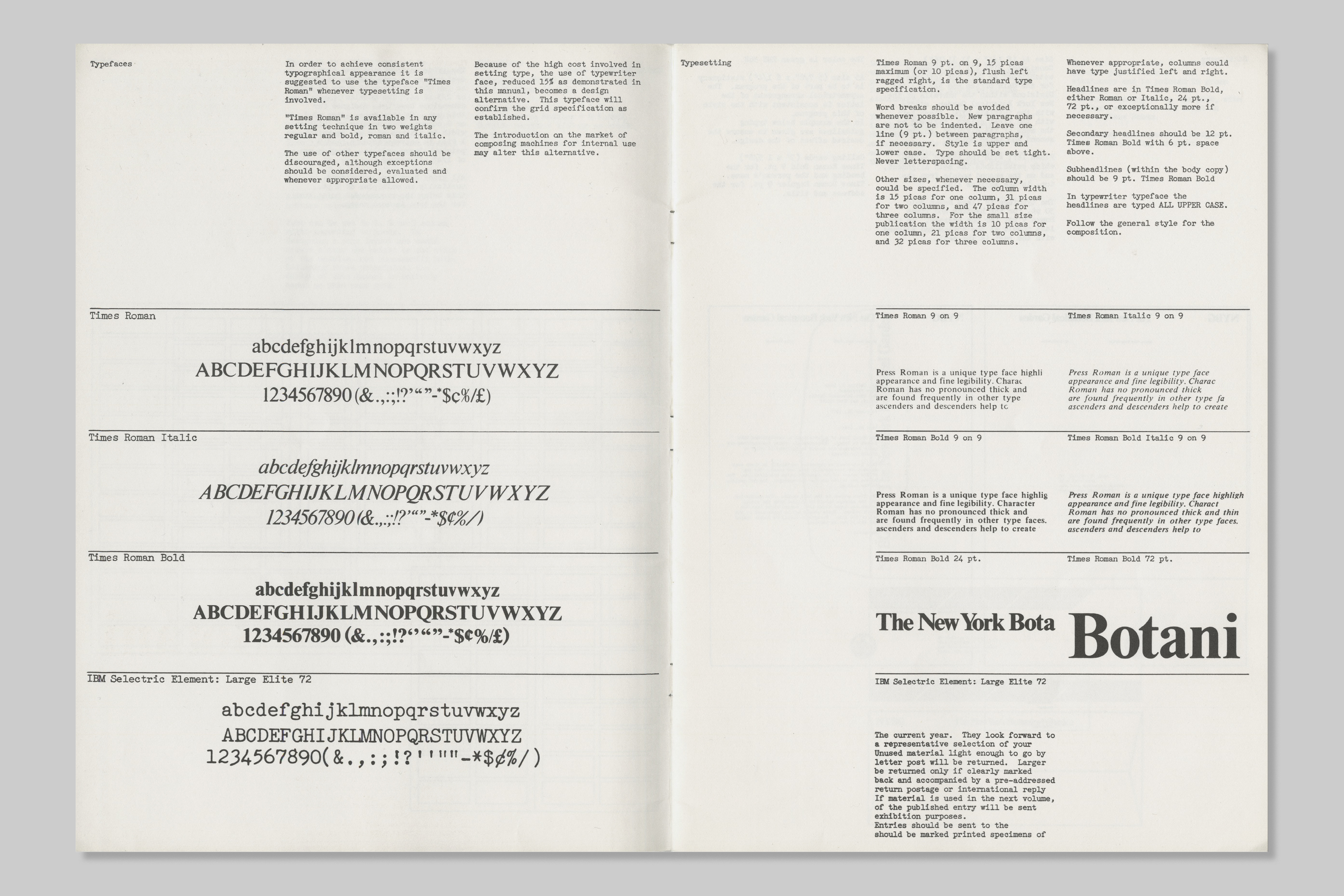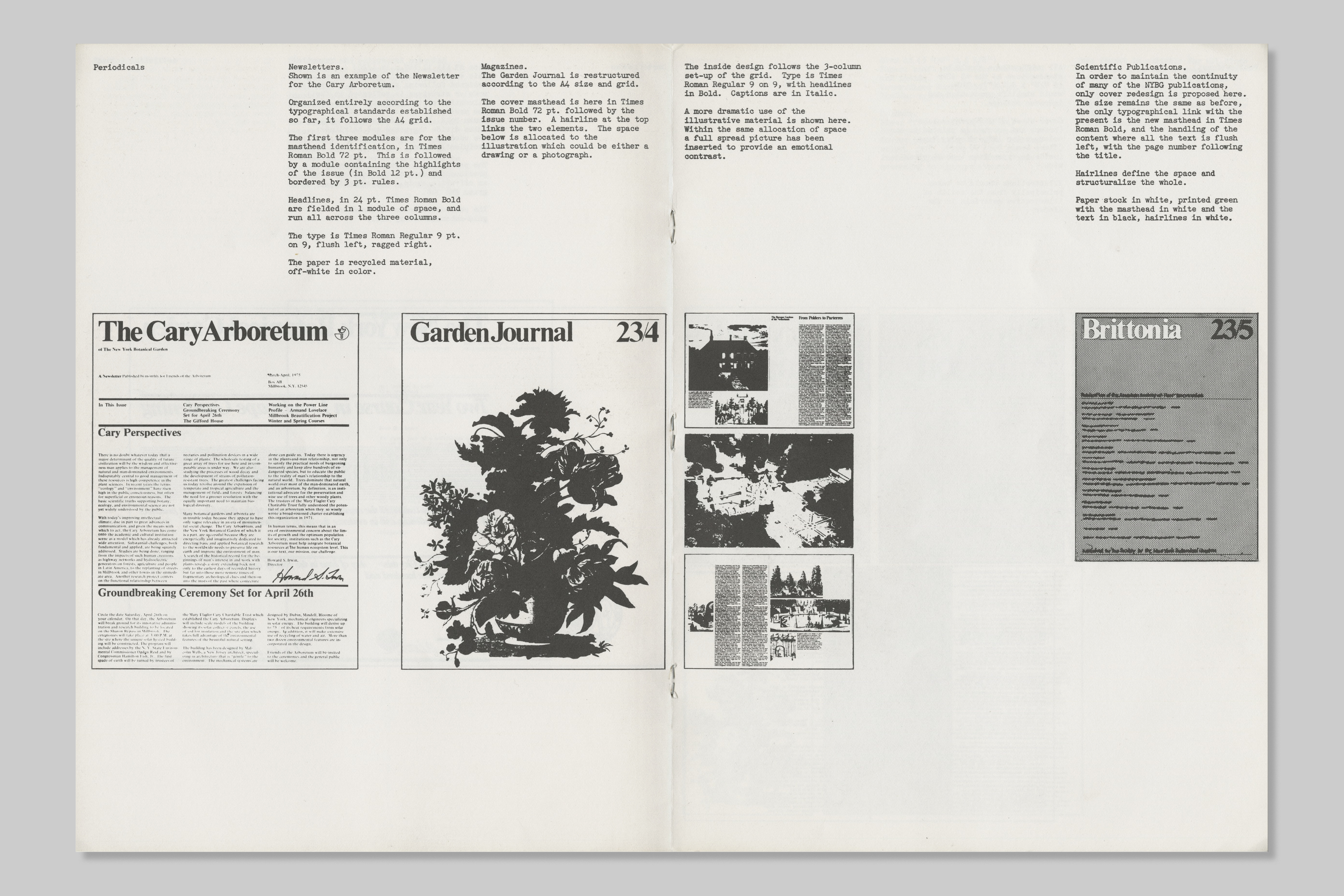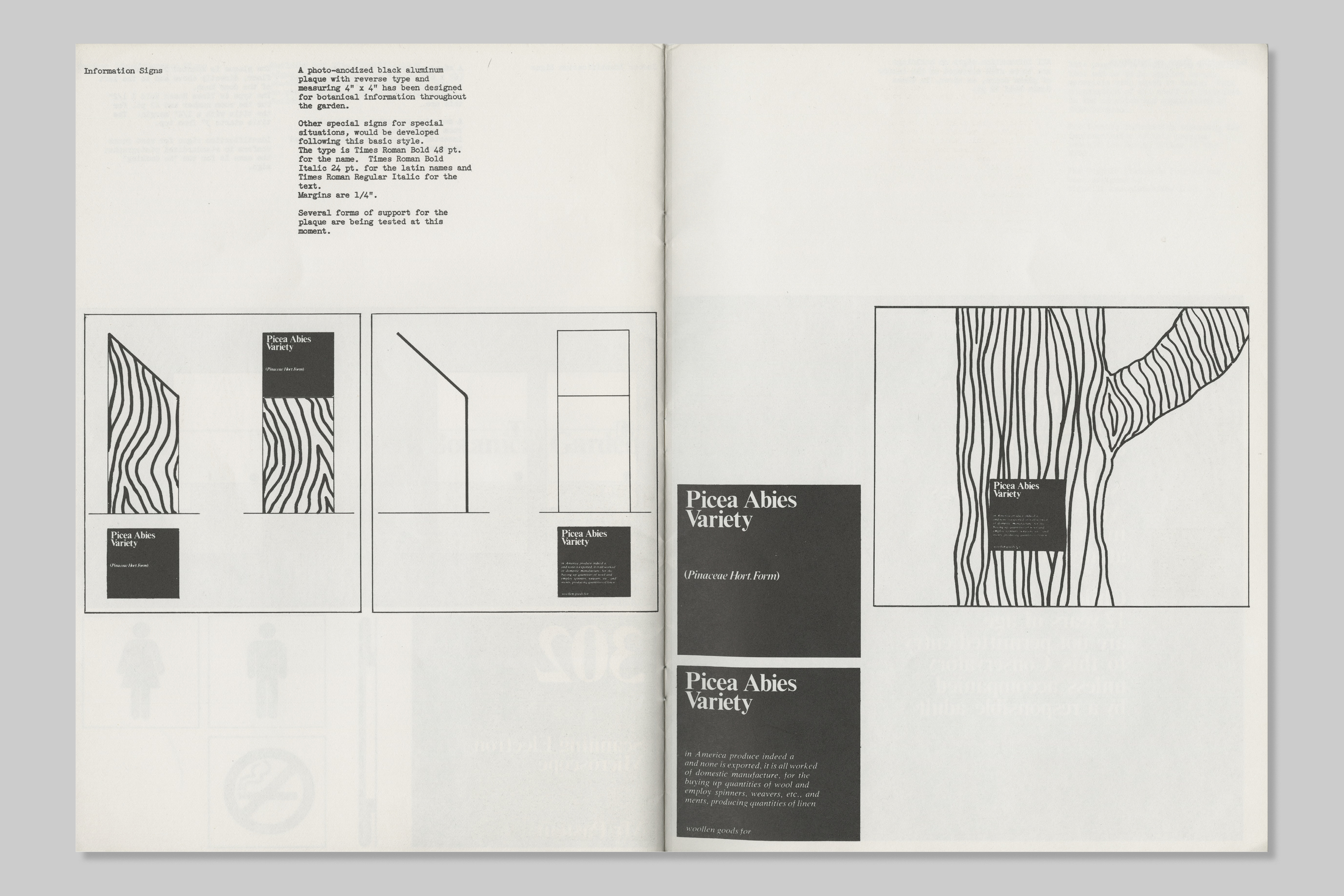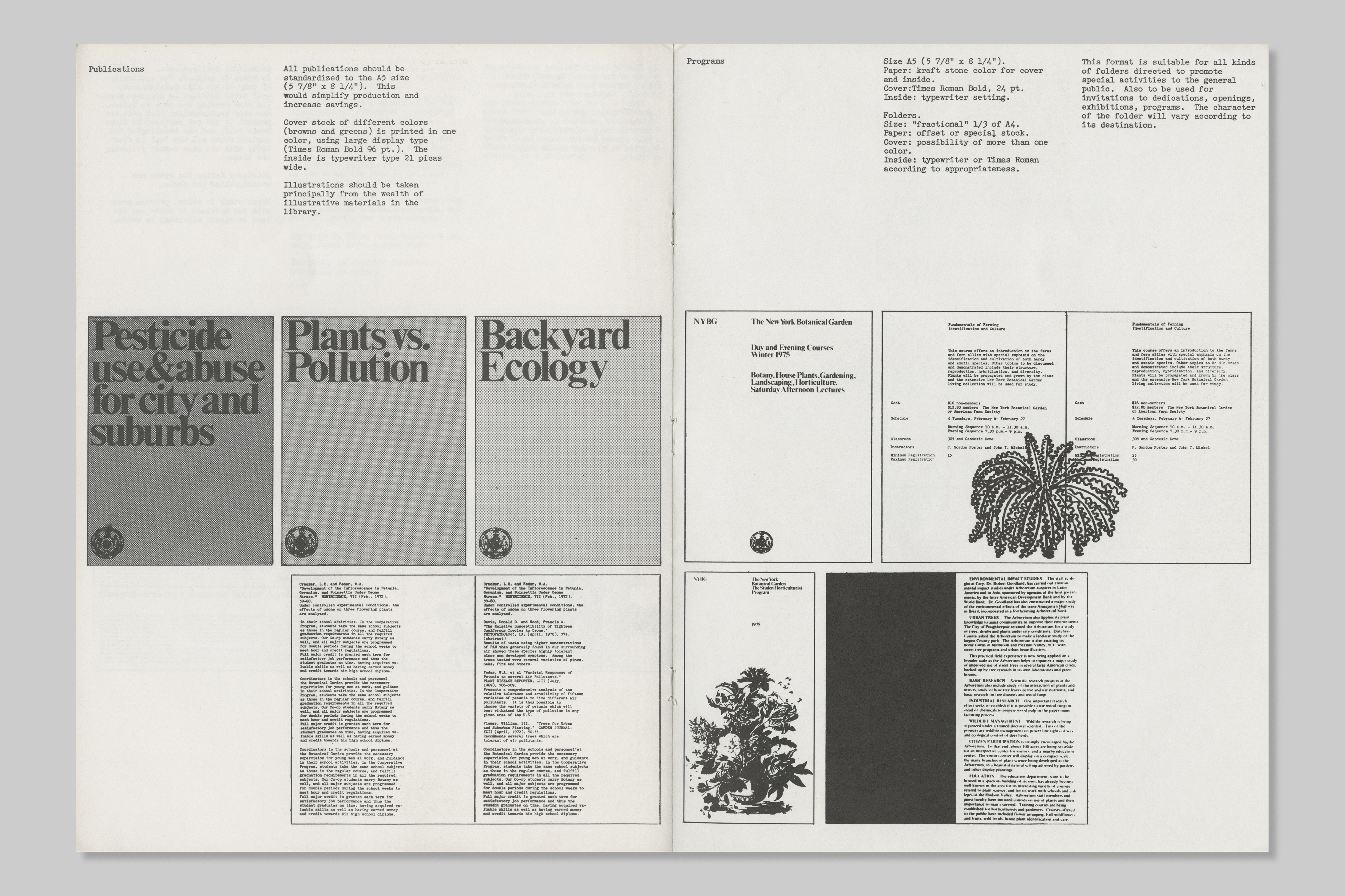 The graphic standards manual for the New York Botanical Garden was developed in 1973 by the designer Massimo Vignelli. This manual is a 32-page document that describes the graphic design standards for the garden, including the standardization of signage and other communication materials.
