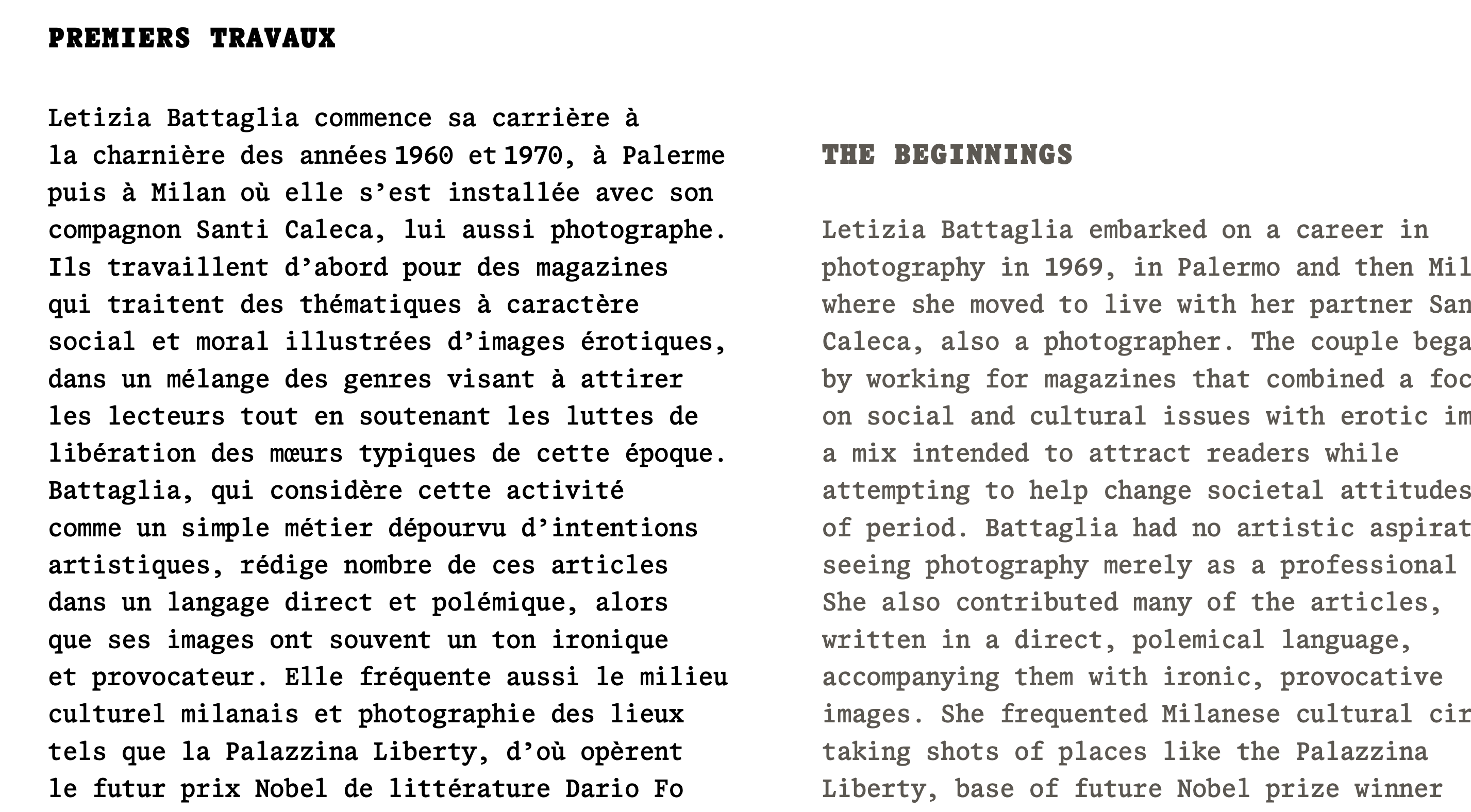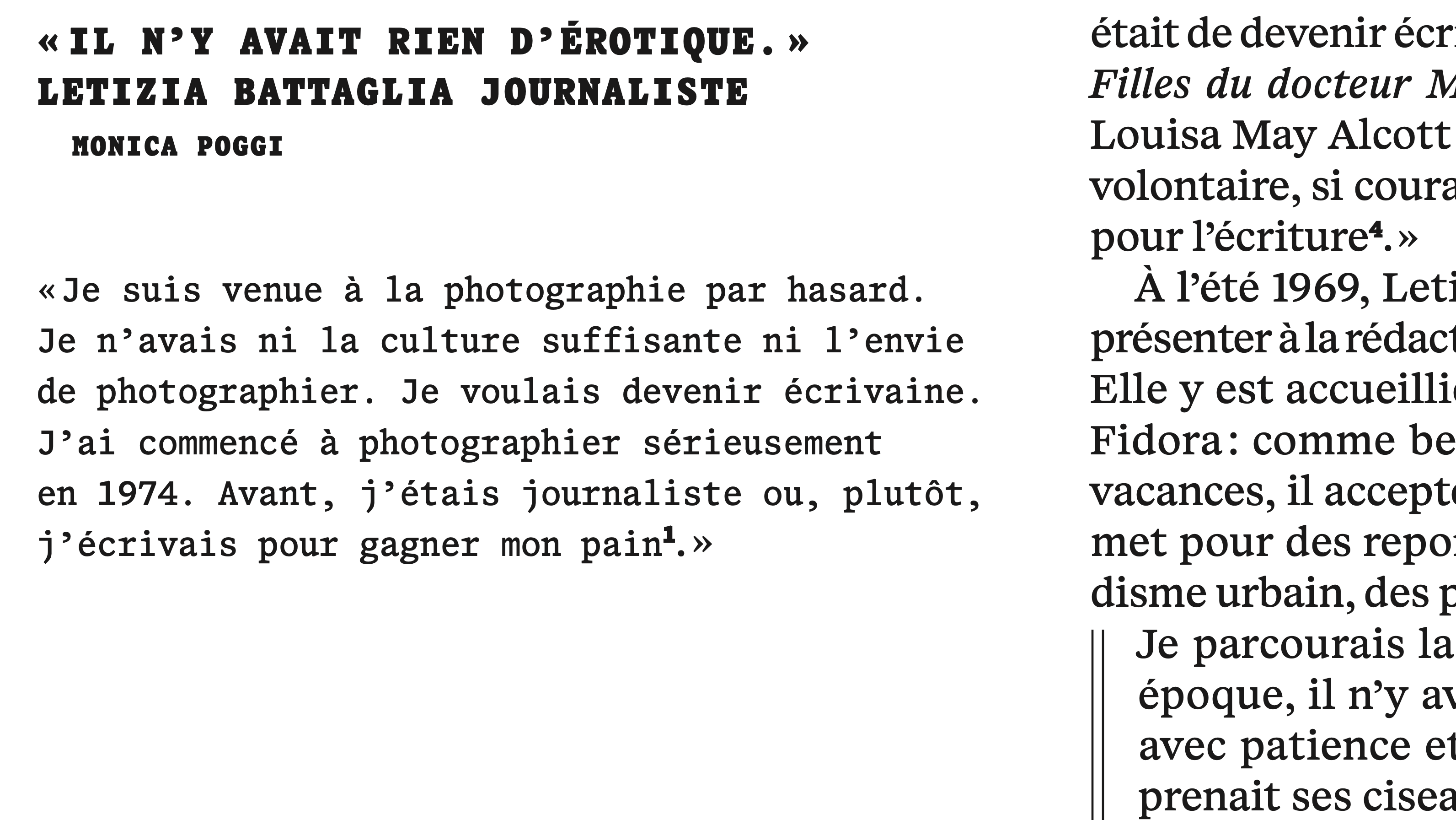 The design uses both the proportional and monospaced versions of 00 Wagram, a serif typeface by D0UBLE ZER0. The proportional version ensures clarity and legibility for body text, while the monospace version introduces a typewriter-like feel, adding a tactile, journalistic quality that aligns with the raw, reportage nature of Battaglia’s work.