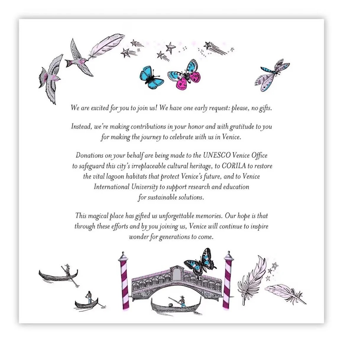 The wedding ceremony of Jeff Bezos and Lauren Sanchez took place in Venice over several days in late June 2025. The invitation is set in the delicate italic style of Mrs Eaves (Emigre’s 1996 interpretation of Baskerville), accompanied by graphics including eight medium-sized stars (four shooting), three butterflies, three feathers, three gondolas, two birds, a dragonfly and the Rialto bridge. The graphical style has been variously described as “an MS Word template in the 90s”, “worse than an 8-year-old’s scrapbook”, “clip-art”, “tacky” and “the ugliest fucking invite ever”.