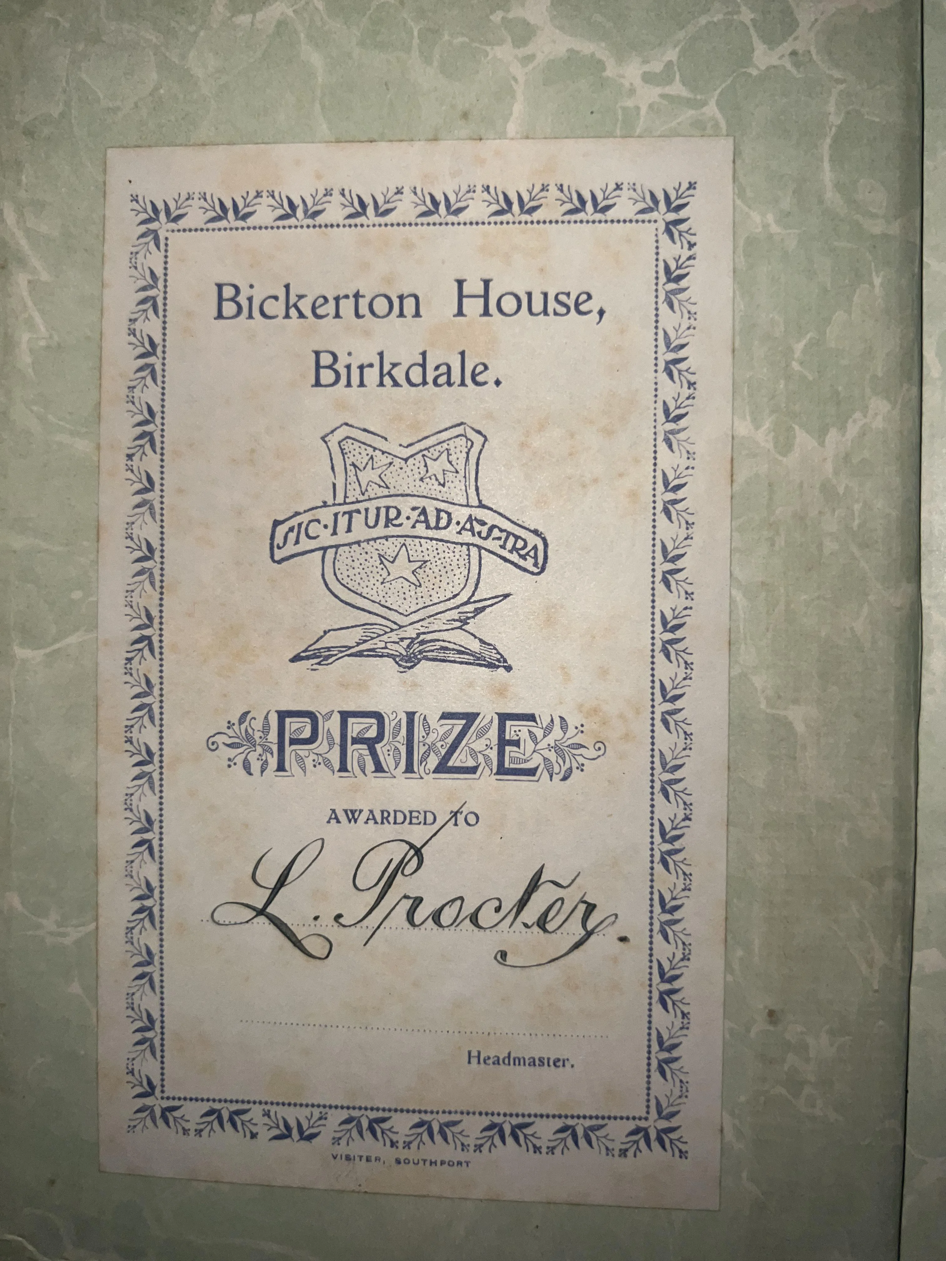 A bookplate inserted a book of Walter Scott’s poetry in 1923, indicating it was a prize given by the Bickerton House School. The bookplate itself isn’t dated and may be an earlier design.