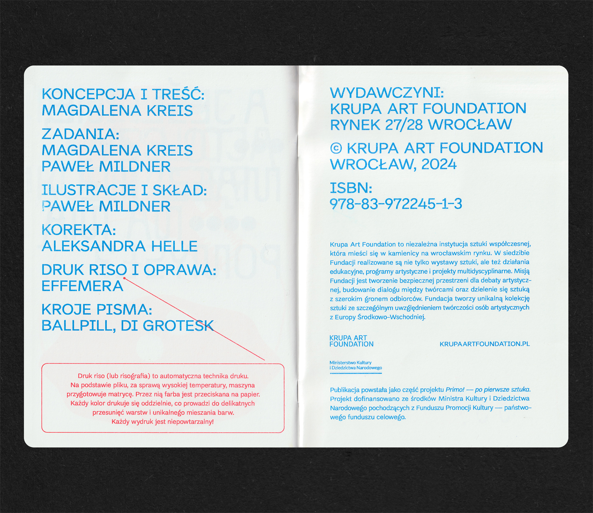 Published by Krupa Art Foundation in a limited edition of 400 numbered copies, this 14.8×20.8 cm book was conceptualised and written by Magdalena Kreis and designed by Paweł Mildner.