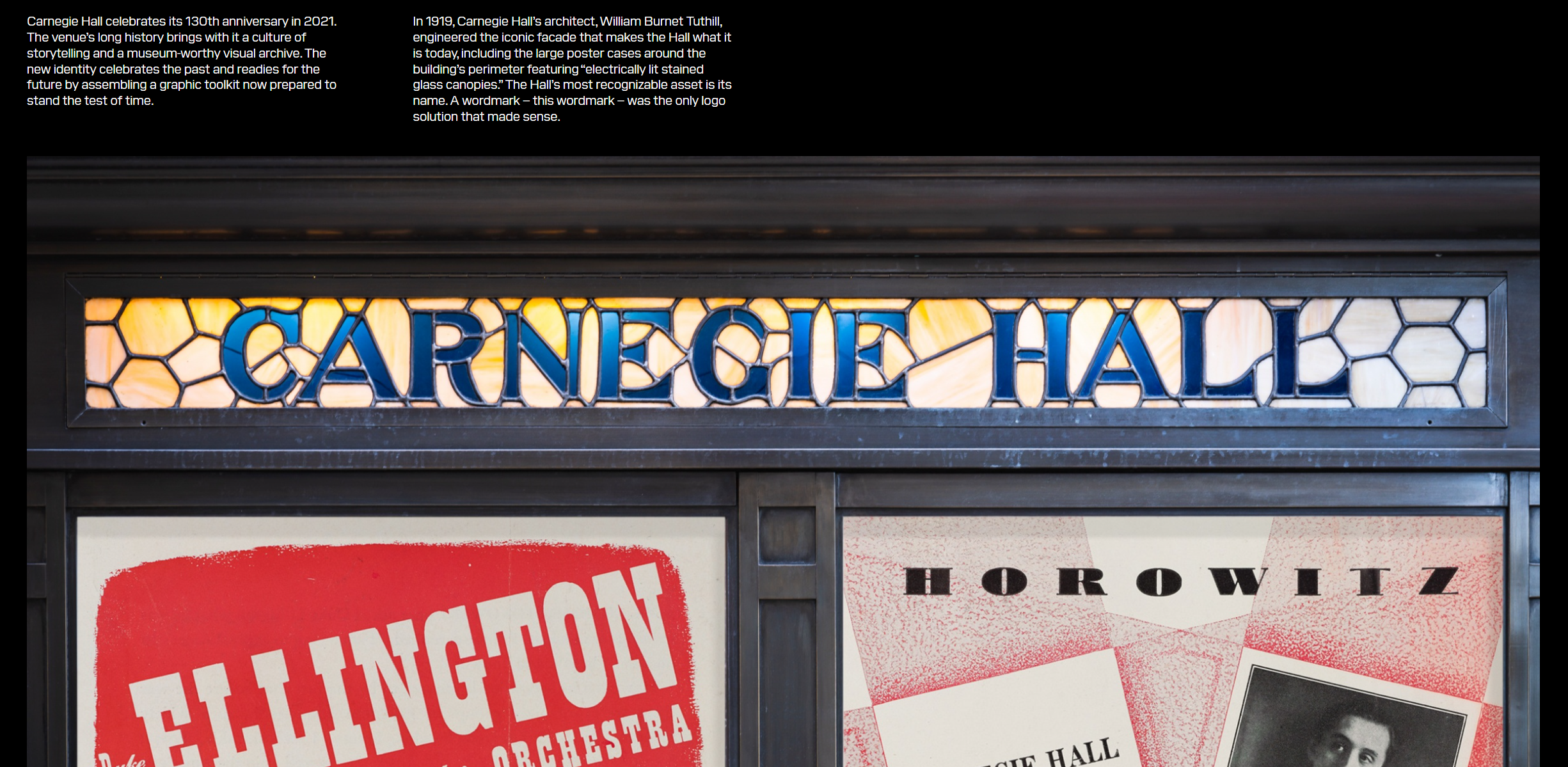 In 1919, Carnegie Hall’s architect, William Burnet Tuthill, engineered the iconic facade that makes the Hall what it is today, including the large poster cases around the building’s perimeter featuring “electrically lit stained glass canopies.” The Hall’s most recognizable asset is its name. A wordmark – this wordmark – was the only logo solution that made sense.