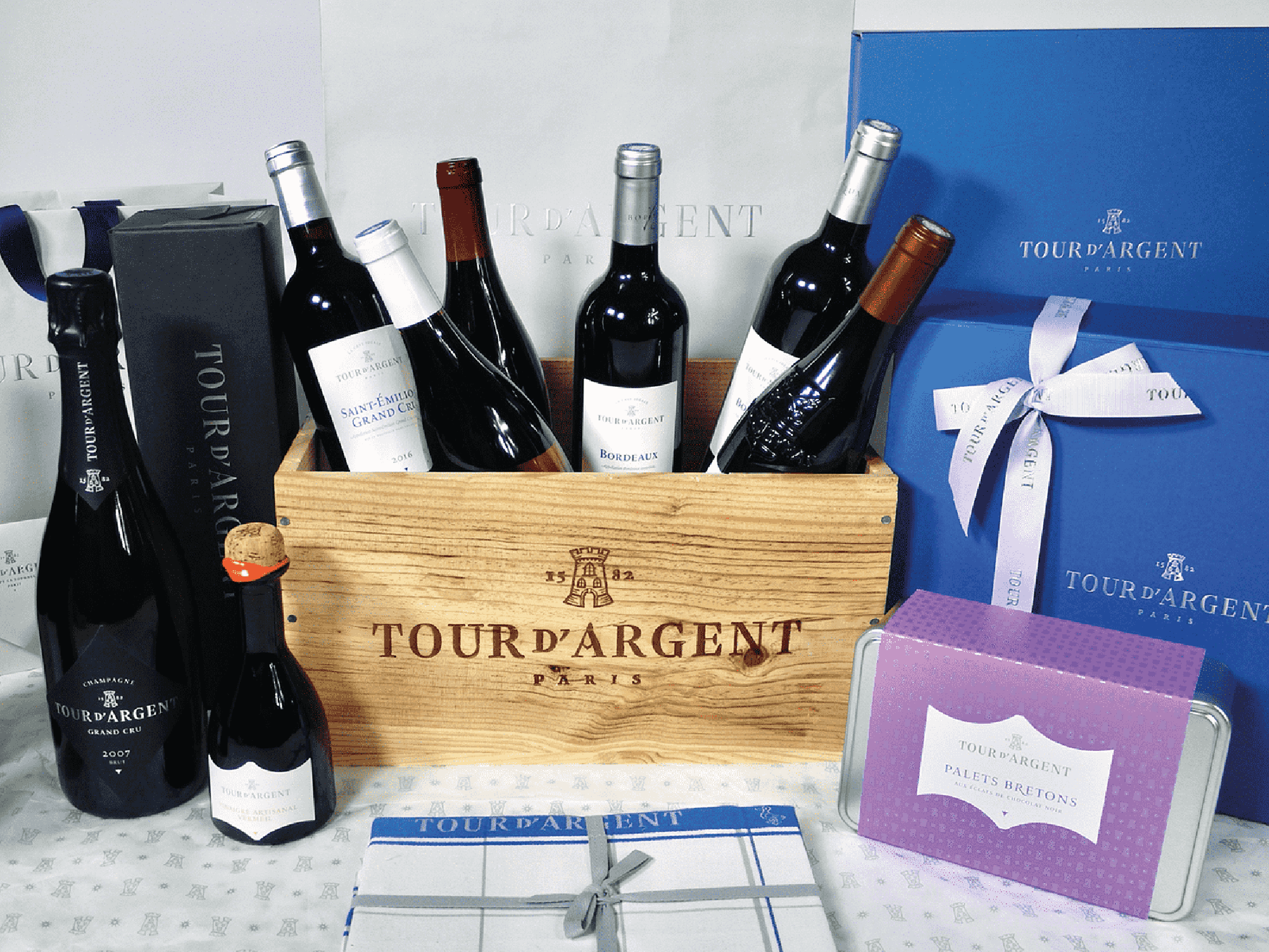 Creative director Aaron Levin recommended the use of two typefaces in association: Le Monde Livre Classic by Typofonderie and Darby Sans (not show on products presented, but you can see it on the website) by Commercial Type. Le Monde Livre Classic works beautifully on text and titling settings. This typeface is used for packaging, menus, and other items at the Tour d’Argent. Designed as an extension of Le Monde Livre, this family distinguishes itself by its historical forms and by its numerous stylistic effects. Le Monde Livre Classic’s italics follow the models of the Renaissance and feature swashes for capitals and lowercase letters.