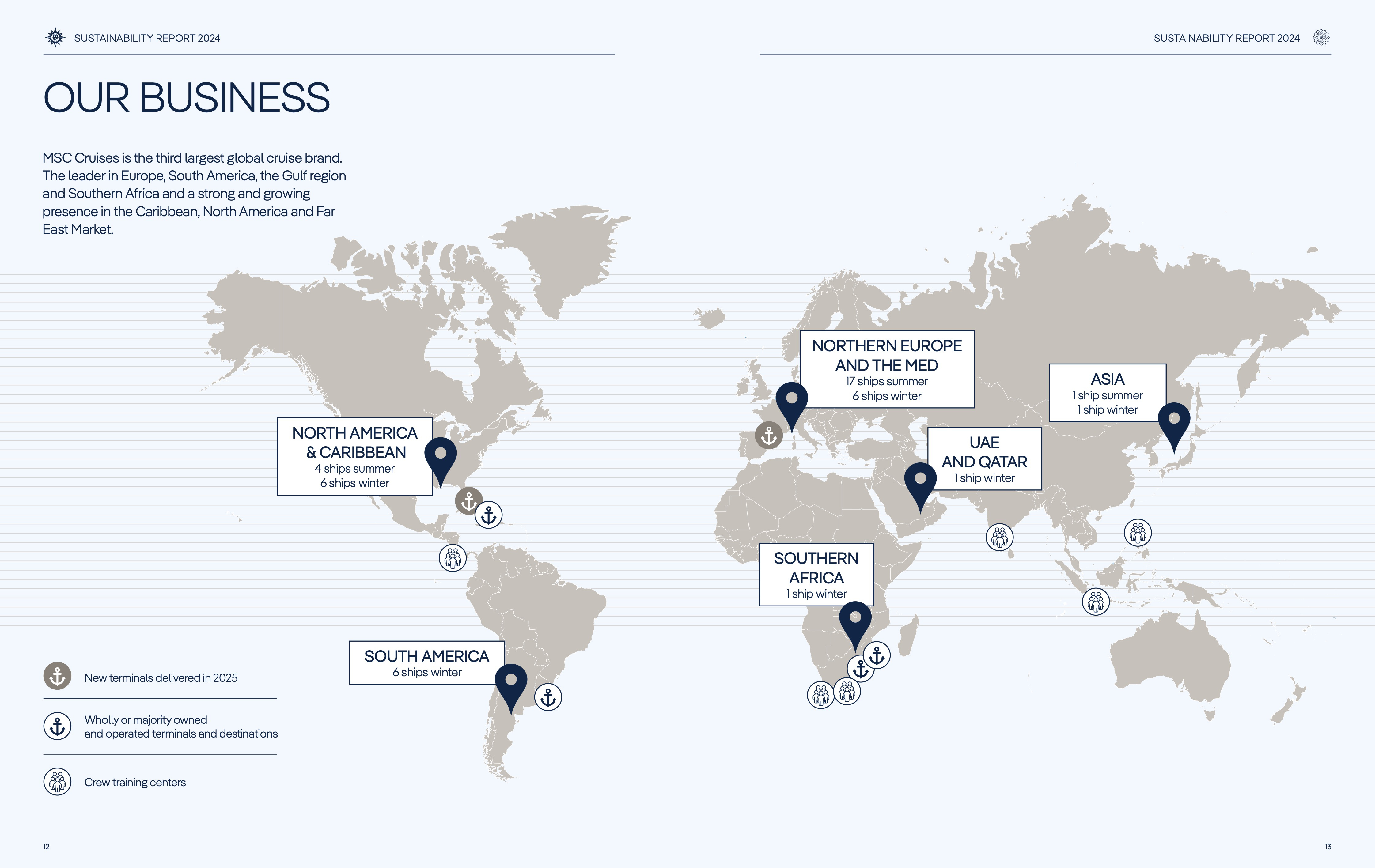 The cruise company MSC Cruises was founded in Naples in 1988 following the merger of the Mediterranean Shipping Company (MSC) with the shipping company Lauro Lines. Starting out as a family business, it developed into a leading provider of cruises over the following decades. Today, the Geneva-based MSC Cruises is the third largest cruise brand in the world and is known for its luxurious ships, Mediterranean hospitality and exclusive travel experiences.