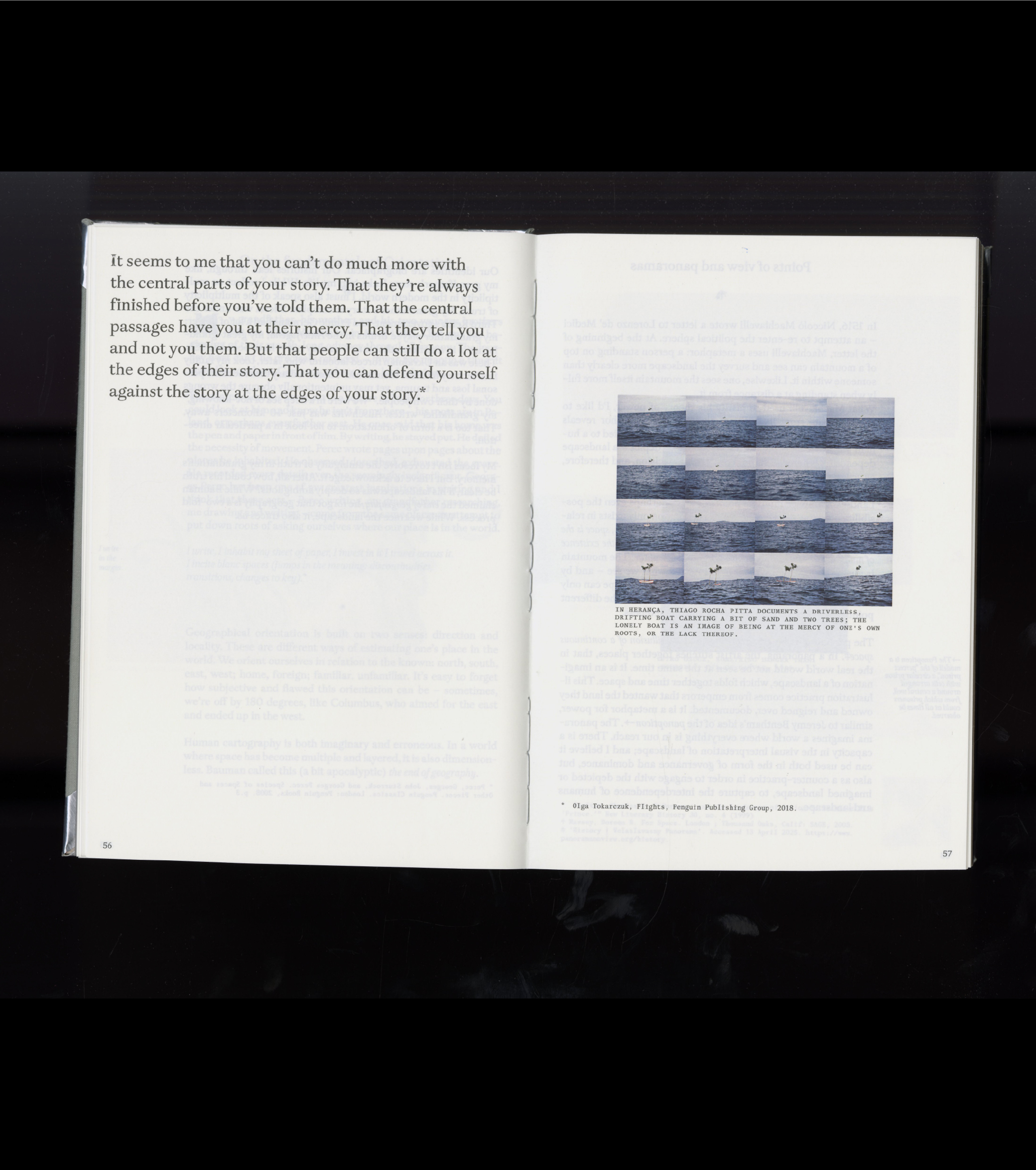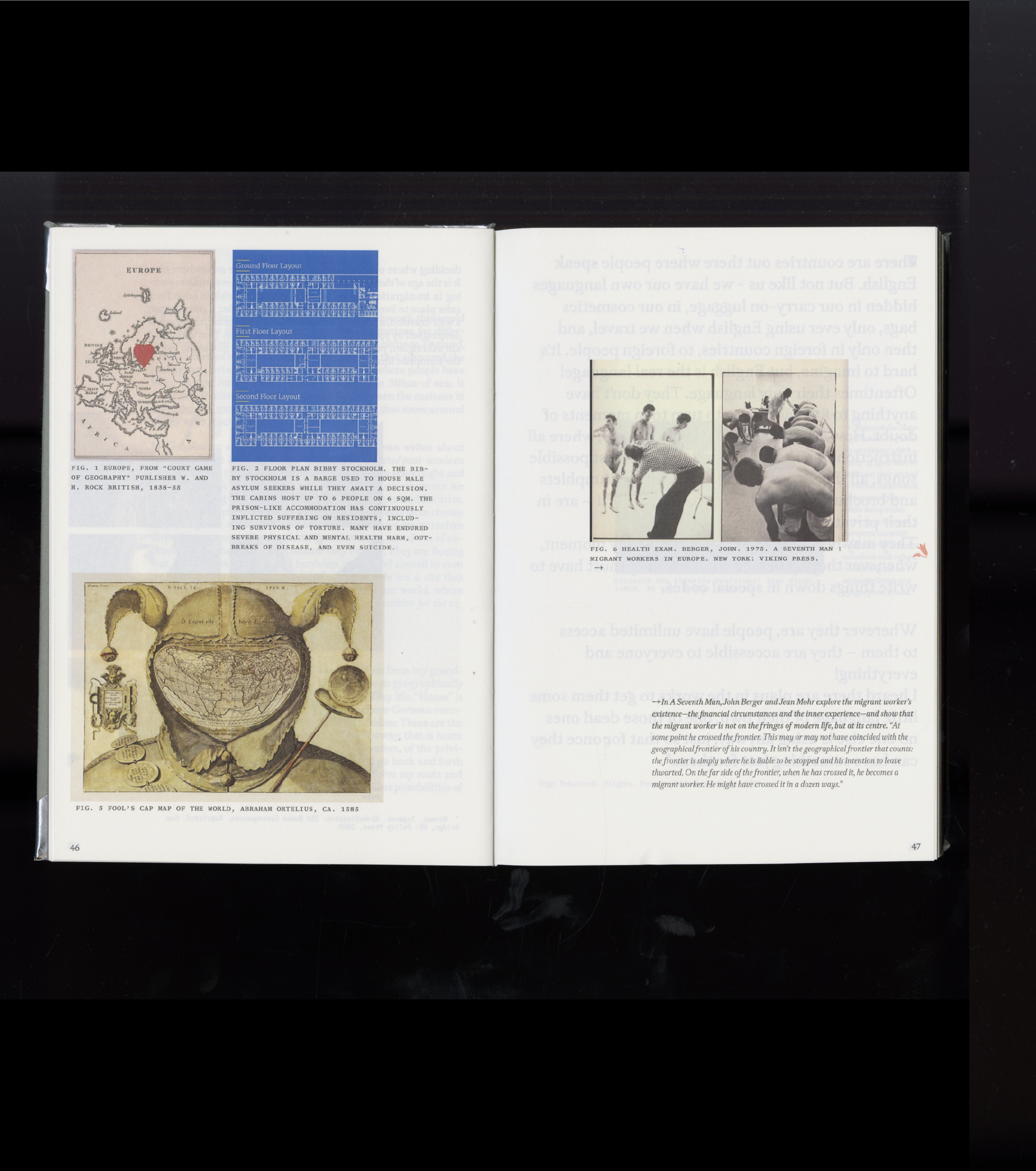 The book juxtaposes text with archival photographs, reproductions of artworks, and full-bleed visual material. Layouts range from dense text spreads to spacious pages with floating captions, creating rhythm and breathing room. Images are annotated with precise figure labels, recalling both the language of academic research and the intimacy of a family album.