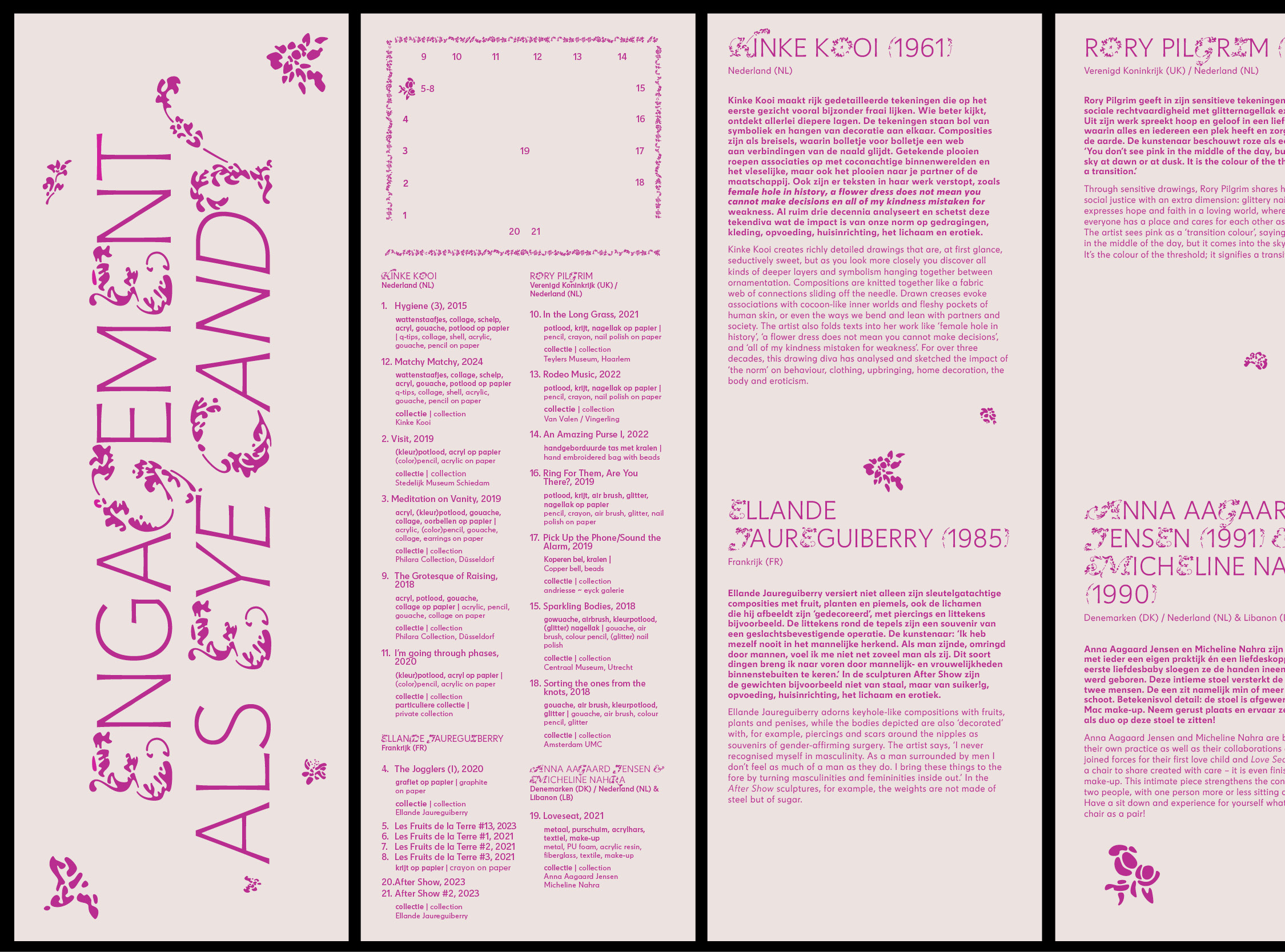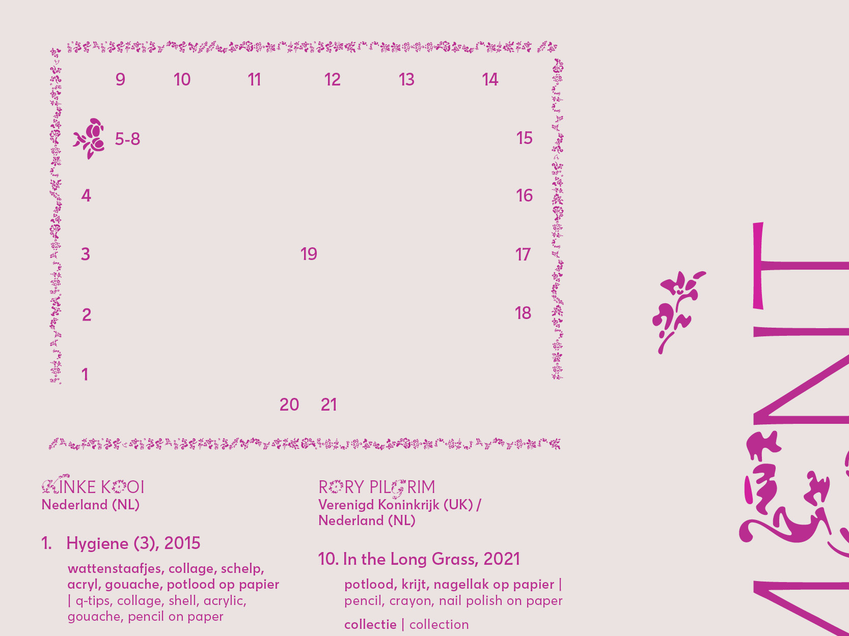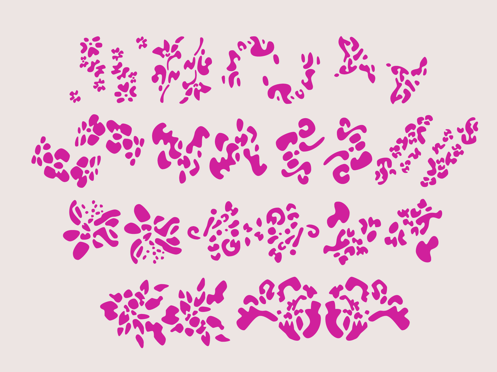 In addition to the existing ornaments of Versailles Gate, we developed a custom set of ornamental flowers, with each character representing an artwork or artist in the exhibition. These were used for the tags of the works. I designed custom shapes for the label stickers, and the ornaments were also incorporated into the floor plans. The exhibition primarily features light shades of pink and magenta. The exhibition design follows some conventional typographic rules while adding lots of layers of hidden meaning and Easter eggs through the usage of Versailles Gate and through the ornaments. The custom ornaments have not been released to date.