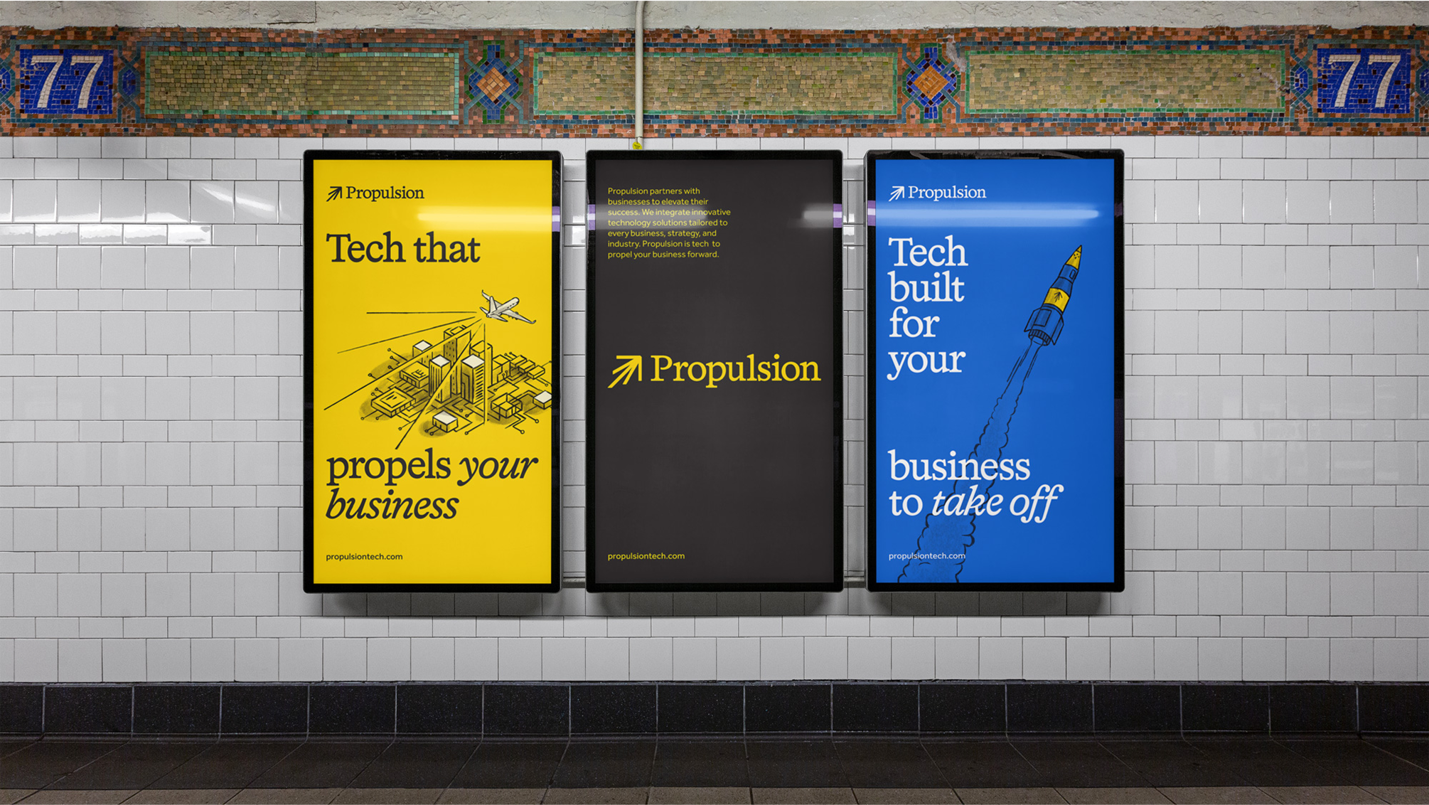 Our visual identity for Propulsion was inspired by their name and mission. To stand out from a crowded market as being both premium and trustworthy, we crafted an identity focused on the upward momentum that Propulsion brings to any business. We positioned Propulsion as not just problem solvers but as proactive partners crafting an identifiable and motion forward mark and brand system.