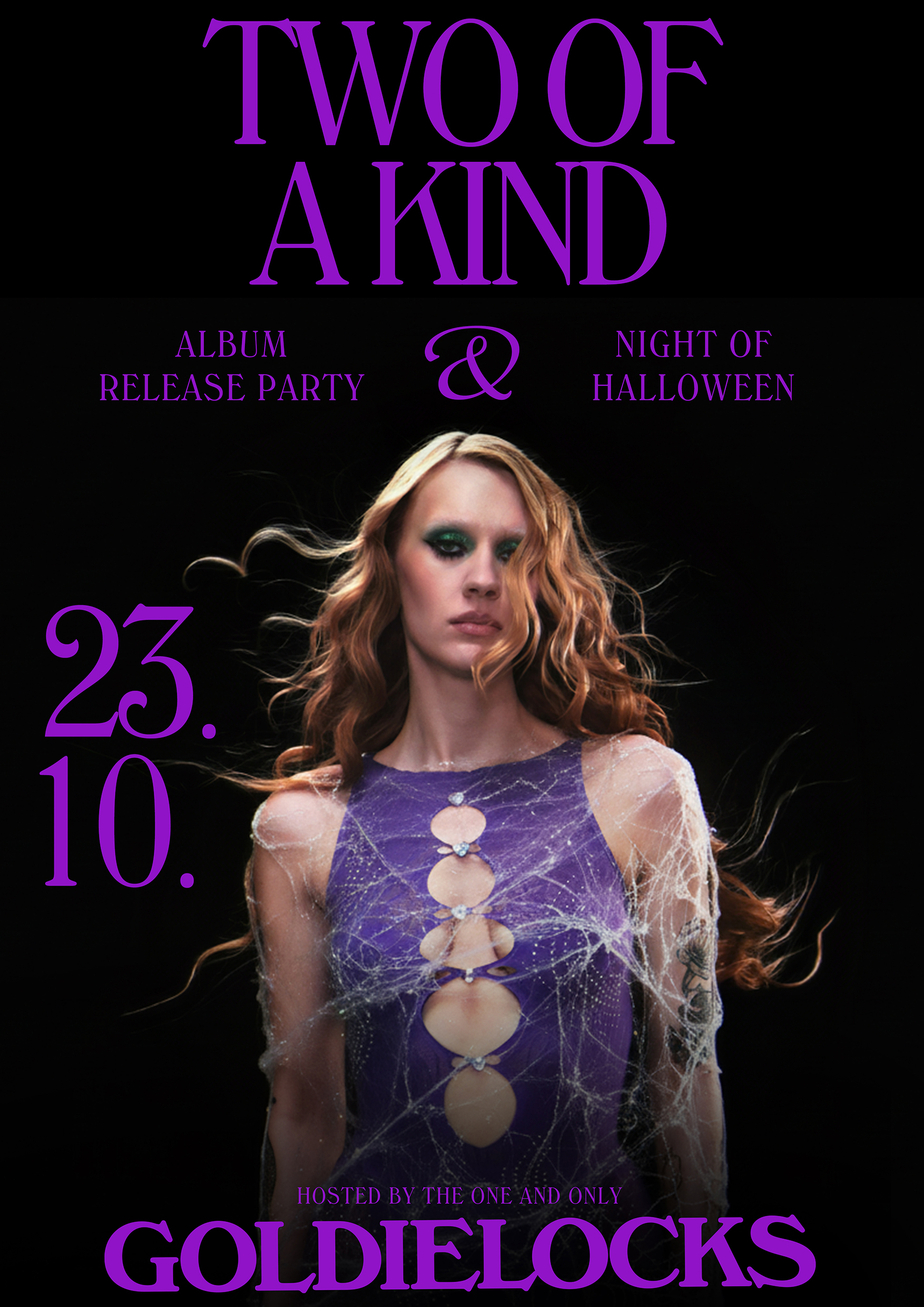 For the release party of music artist Goldielocks—following her breakthrough year and standout success at UMK—we designed a poster built around her primary typeface, Windsor Roman, with Windsor BT’s Light Condensed for the smaller texts. As the event took place close to Halloween, the concept introduced a subtle, atmospheric Halloween influence layered onto the official promotional and press imagery for her debut album, Two of a Kind. The album marks Goldielocks’ emergence as one of Finland’s most promising new international pop artists.