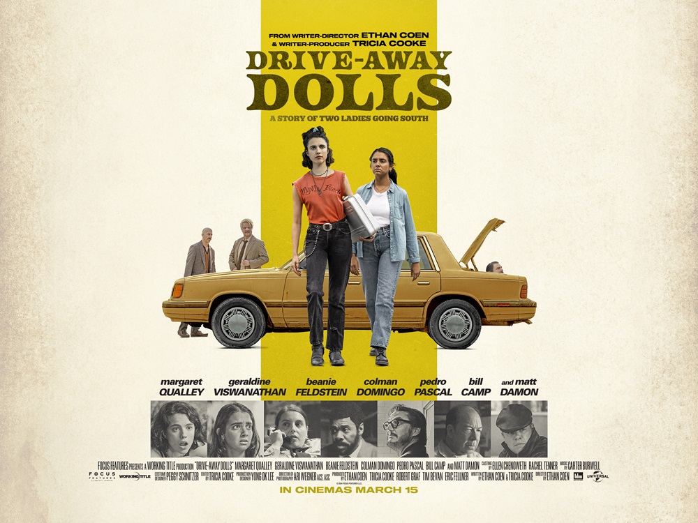 Drive-Away Dolls is a 2024 crime comedy directed by Ethan Coen and co-written with his wife Tricia Cooke, who was also the film’s editor and uncredited co-director. It stars Margaret Qualley and Geraldine Viswanathan as two lesbian friends on a road trip that takes a wrong turn. Set in 1999, the film has a gritty aesthetic that fits its classic caper plot.