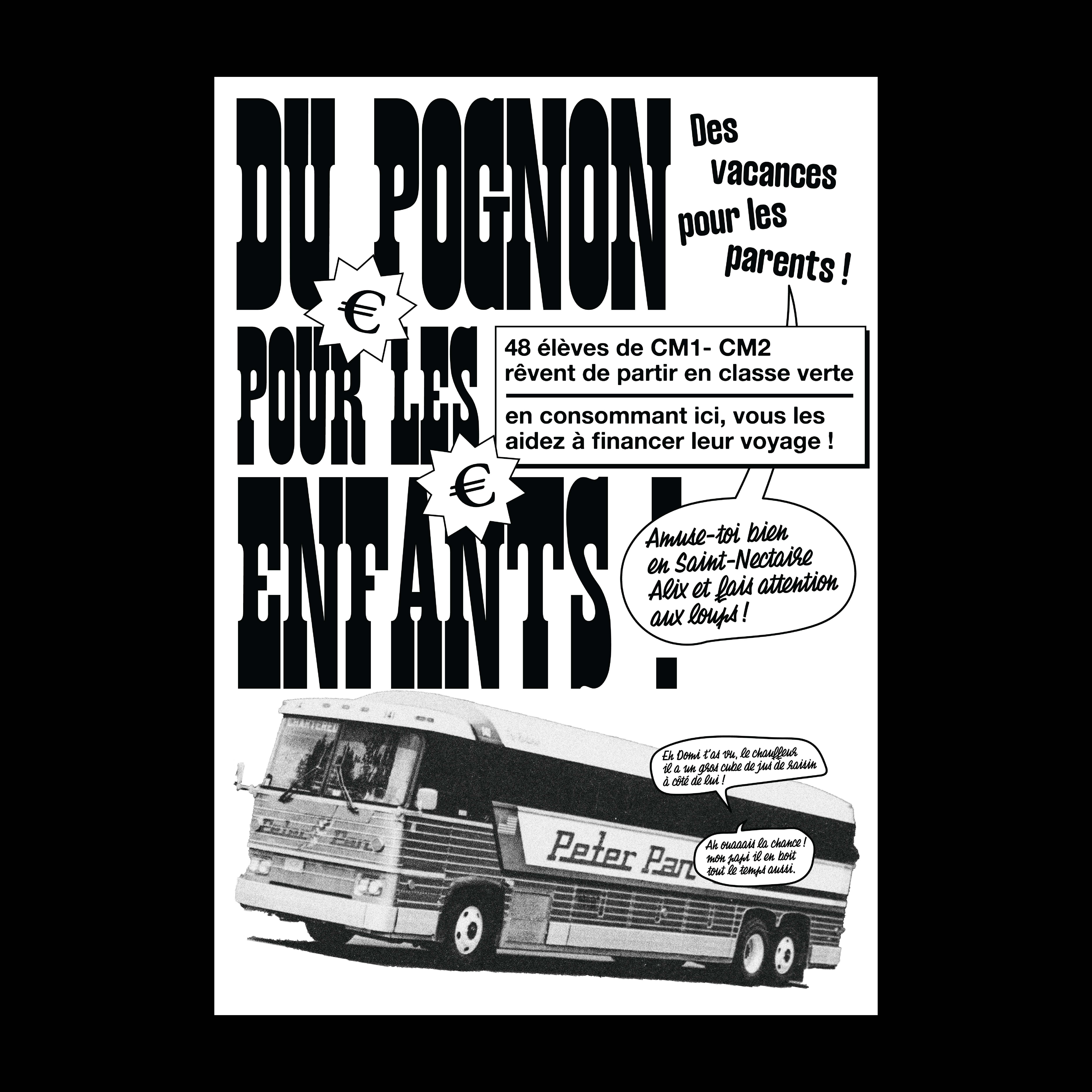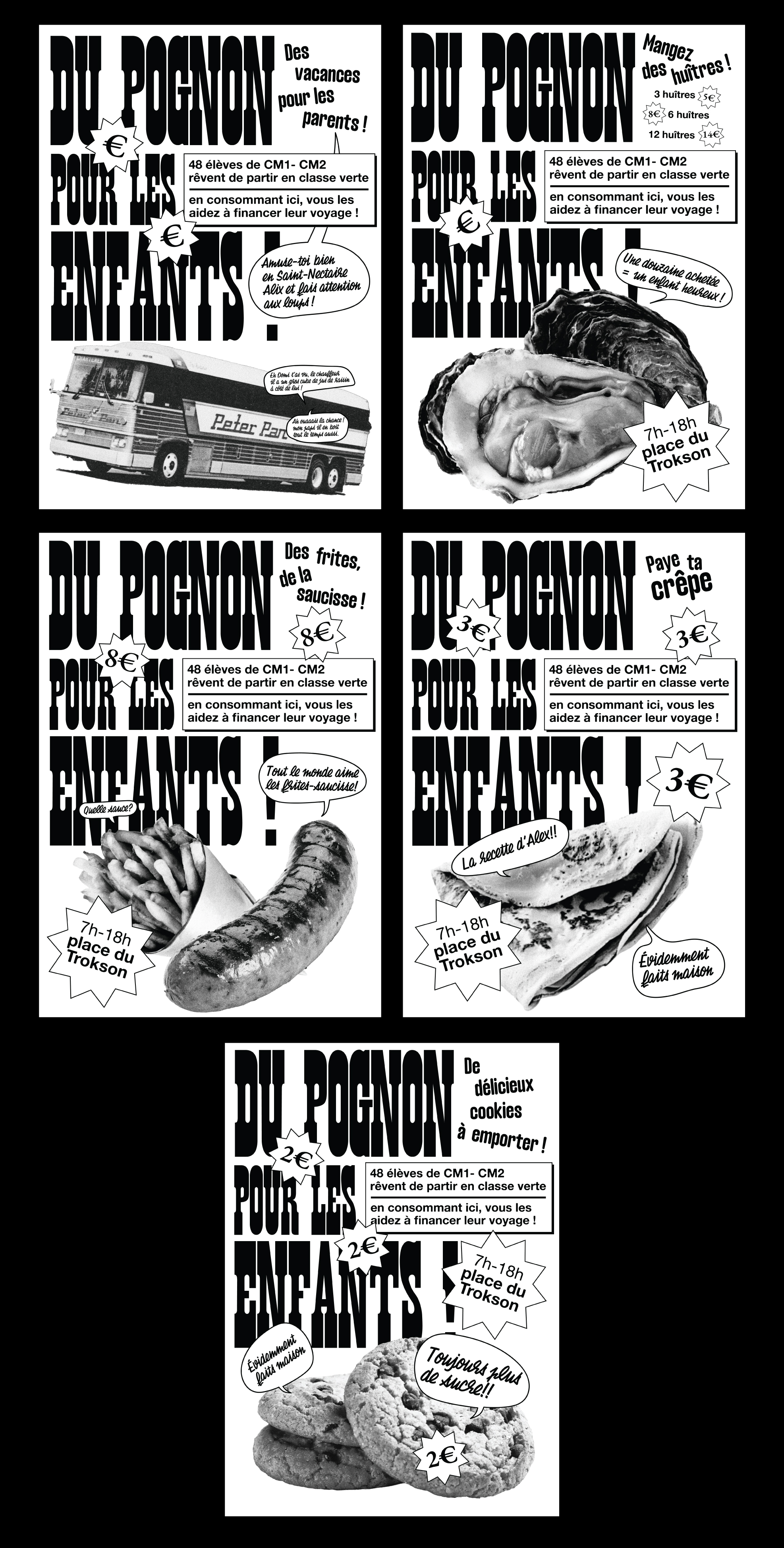 This series of five black-and-white posters was designed to promote a fundraising event for a CM1-CM2 class trip. The main poster features the bold tagline “DU POGNON POUR LES ENFANTS !” (“Money for the kids!”) and a bus symbolizing the journey. A recurring text block across all posters explains: “48 CM1-CM2 students dream of going on a school trip. By purchasing here, you help fund their journey!”