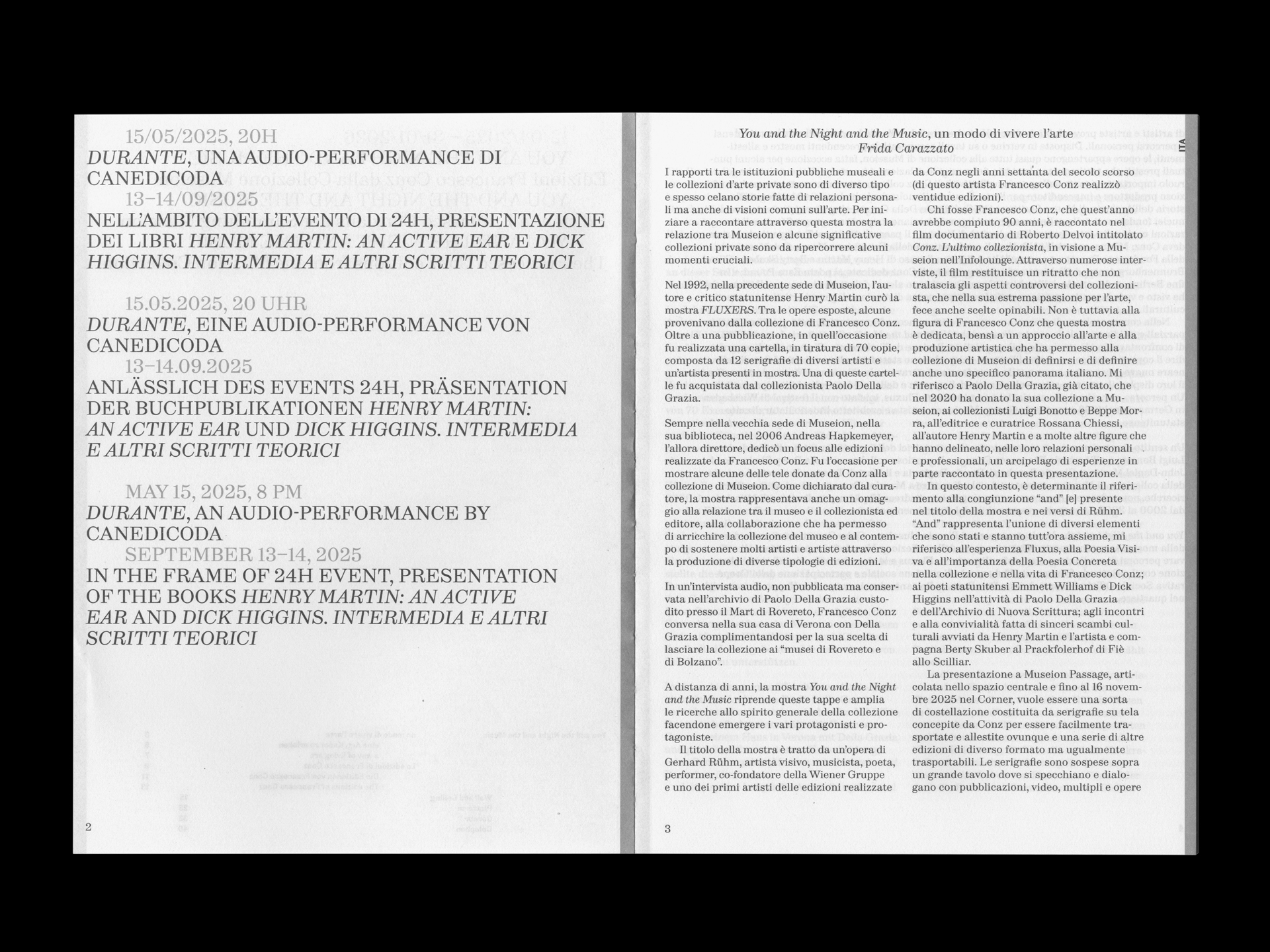 You and the Night and the Music is the exhibition booklet for the eponymous exhibition curated by Frida Carazzato, produced in collaboration with the Fondazione Bonotto and with Patrizio Peterlini’s curatorial advice. The booklet was designed by SS16 Studio in collaboration with Andrea Tabocchini Architecture, reflecting the exhibition’s visual identity and curatorial narrative.