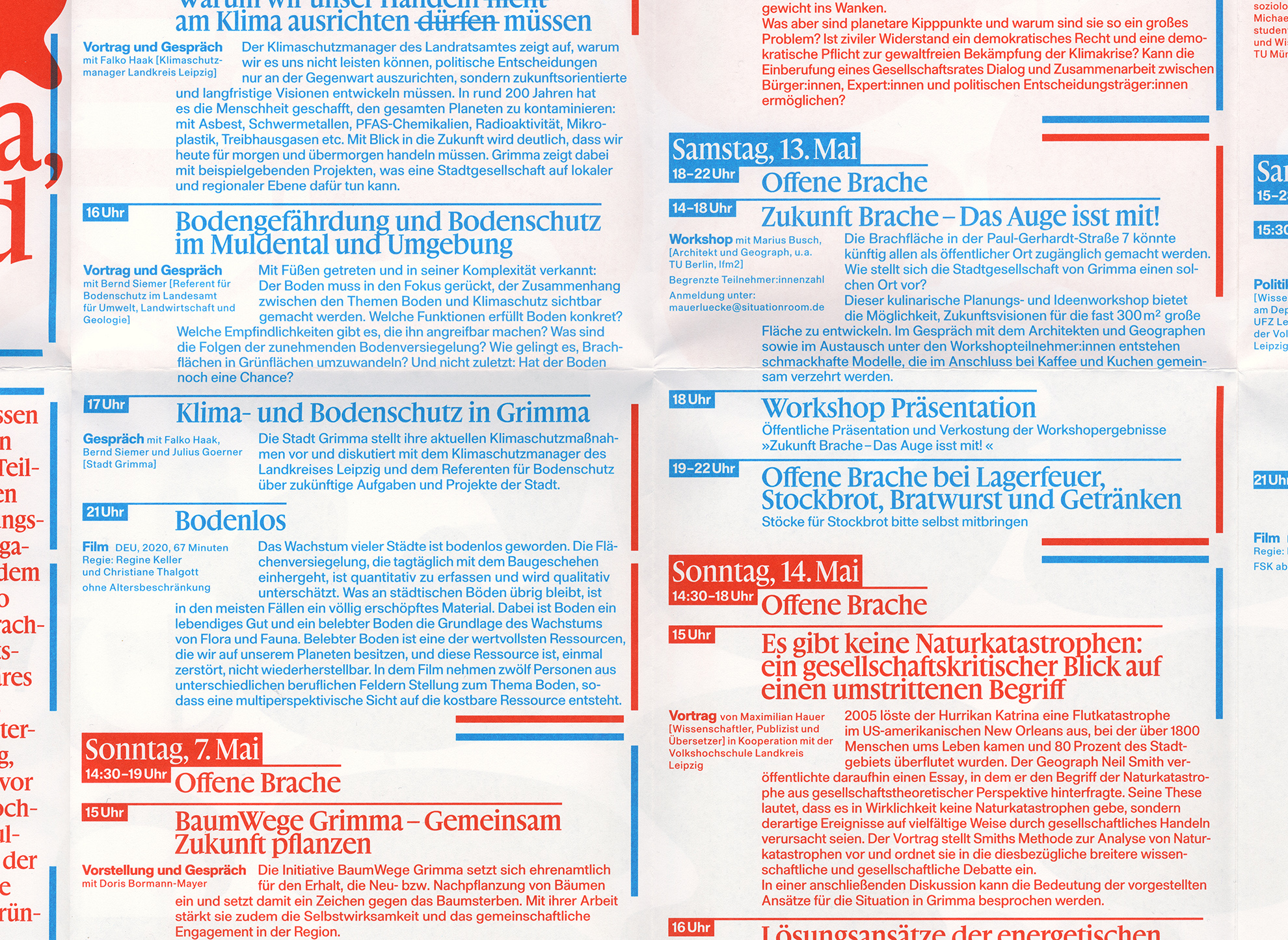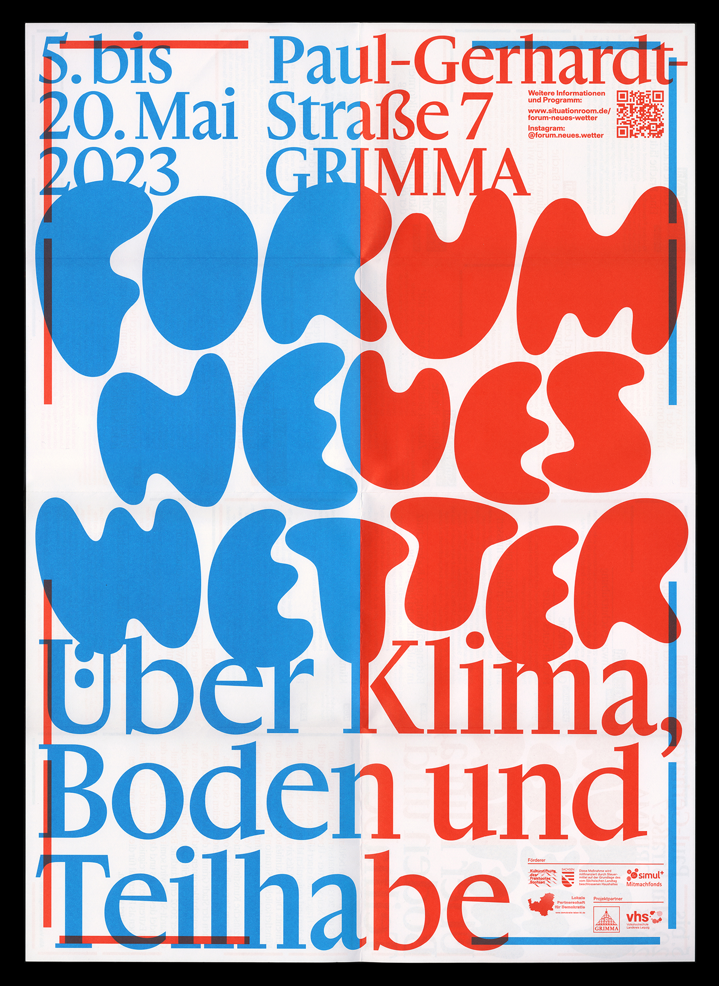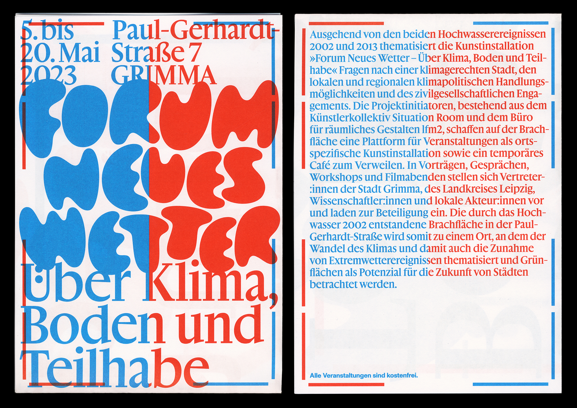 Poster and program flyer for Forum Neues Wetter, a series of talks in Grimma, Saxony, organized by the office for spatial design laufende quadratmeter (lfm2, Christian Göthner) and artist collective Situation Room (Sven Bergelt and Kai-Hendrik Windeler).
