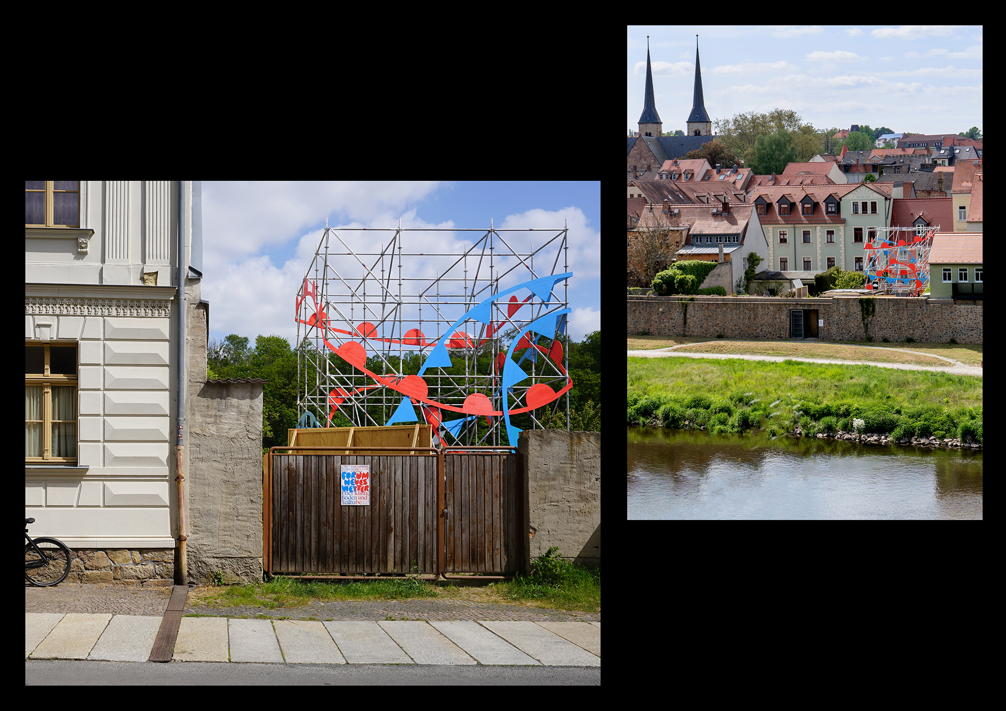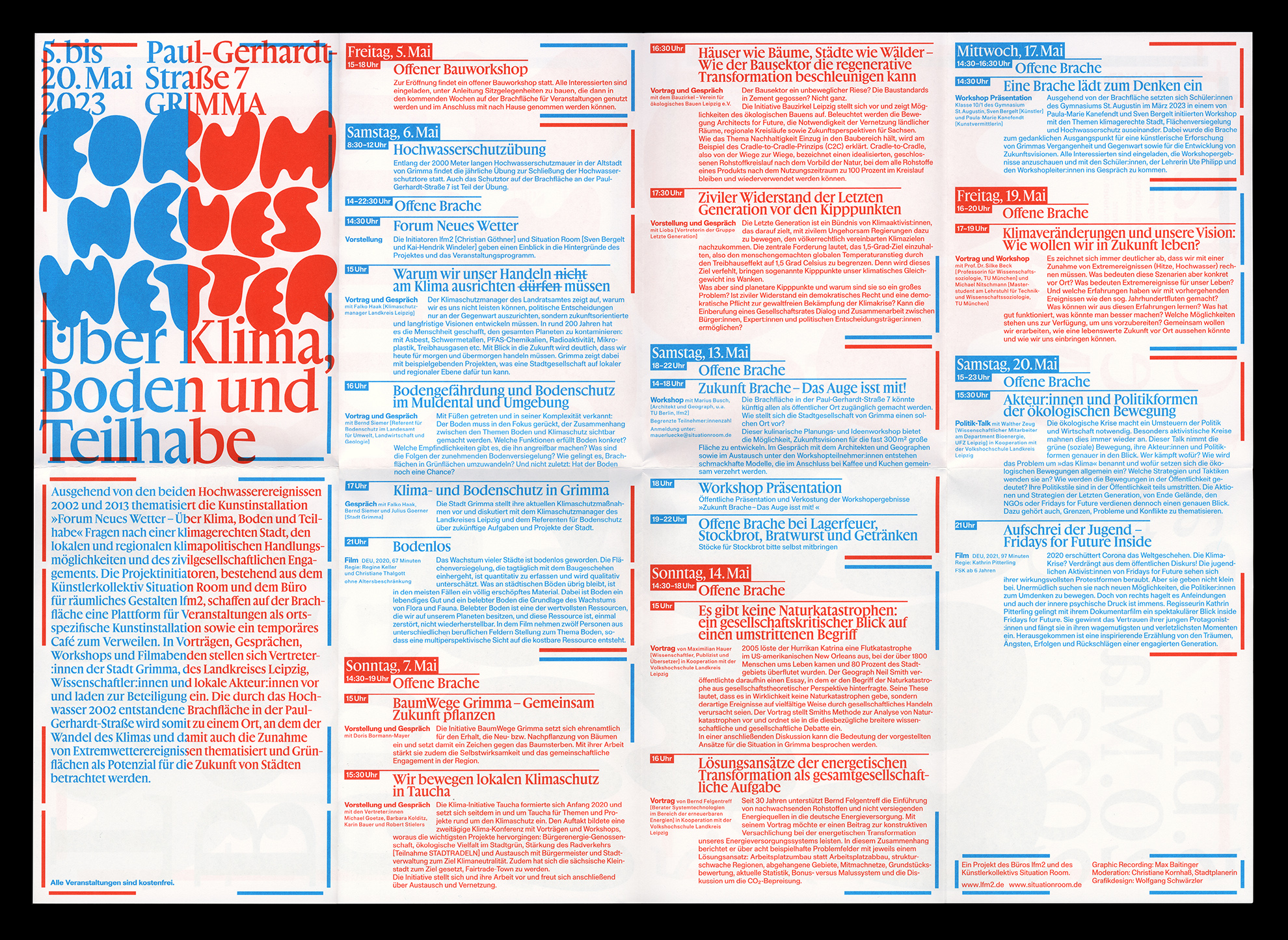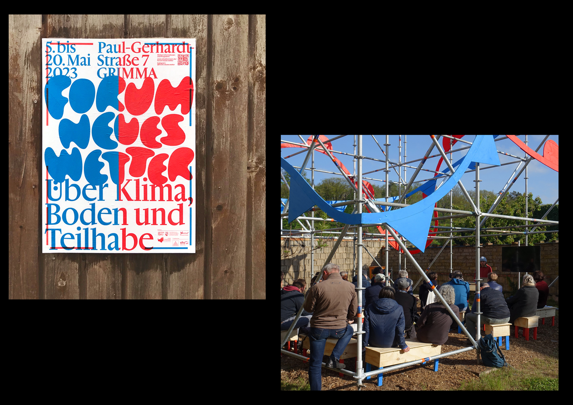 Poster and program flyer for Forum Neues Wetter, a series of talks in Grimma, Saxony, organized by the office for spatial design laufende quadratmeter (lfm2, Christian Göthner) and artist collective Situation Room (Sven Bergelt and Kai-Hendrik Windeler).
