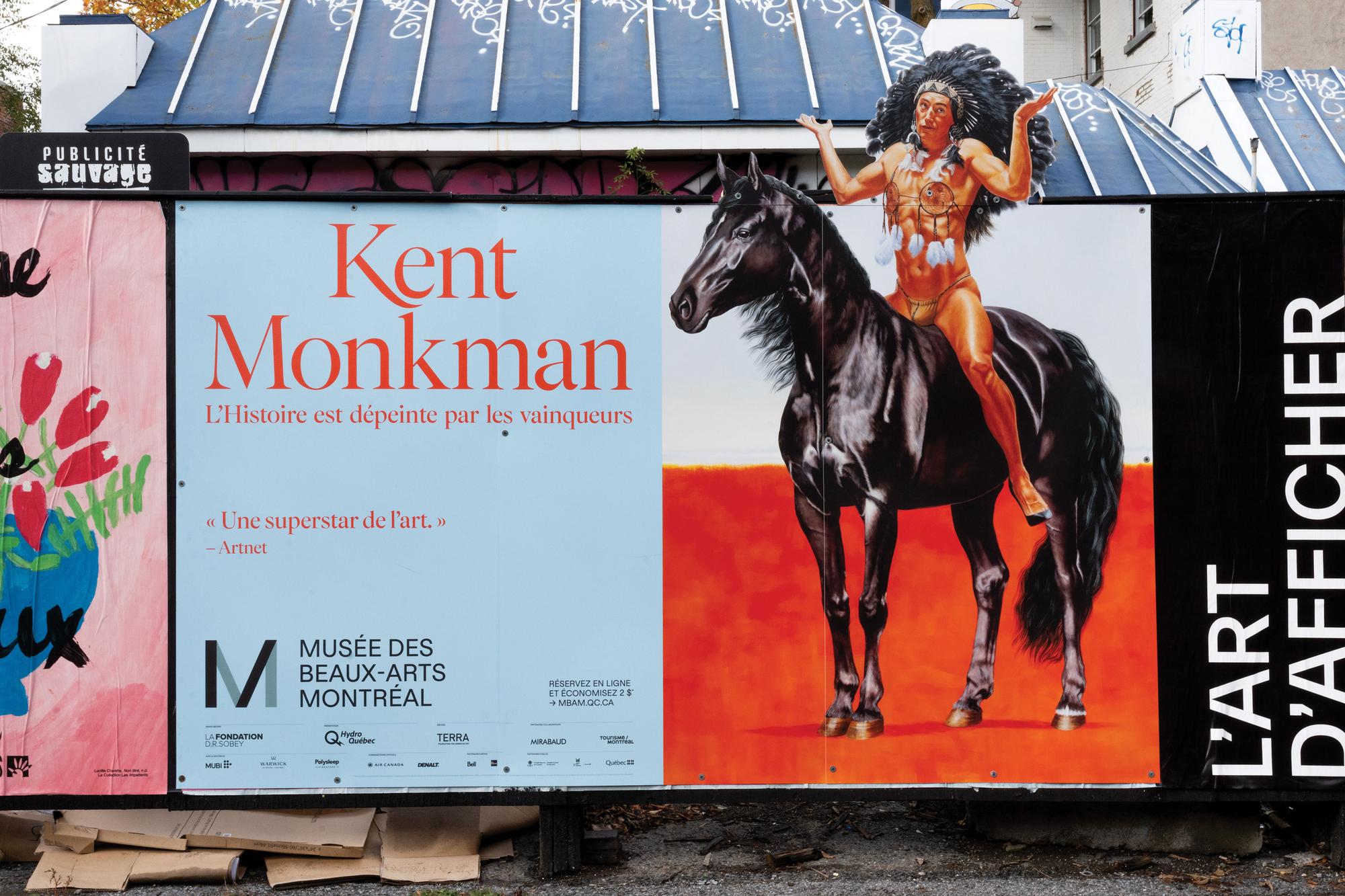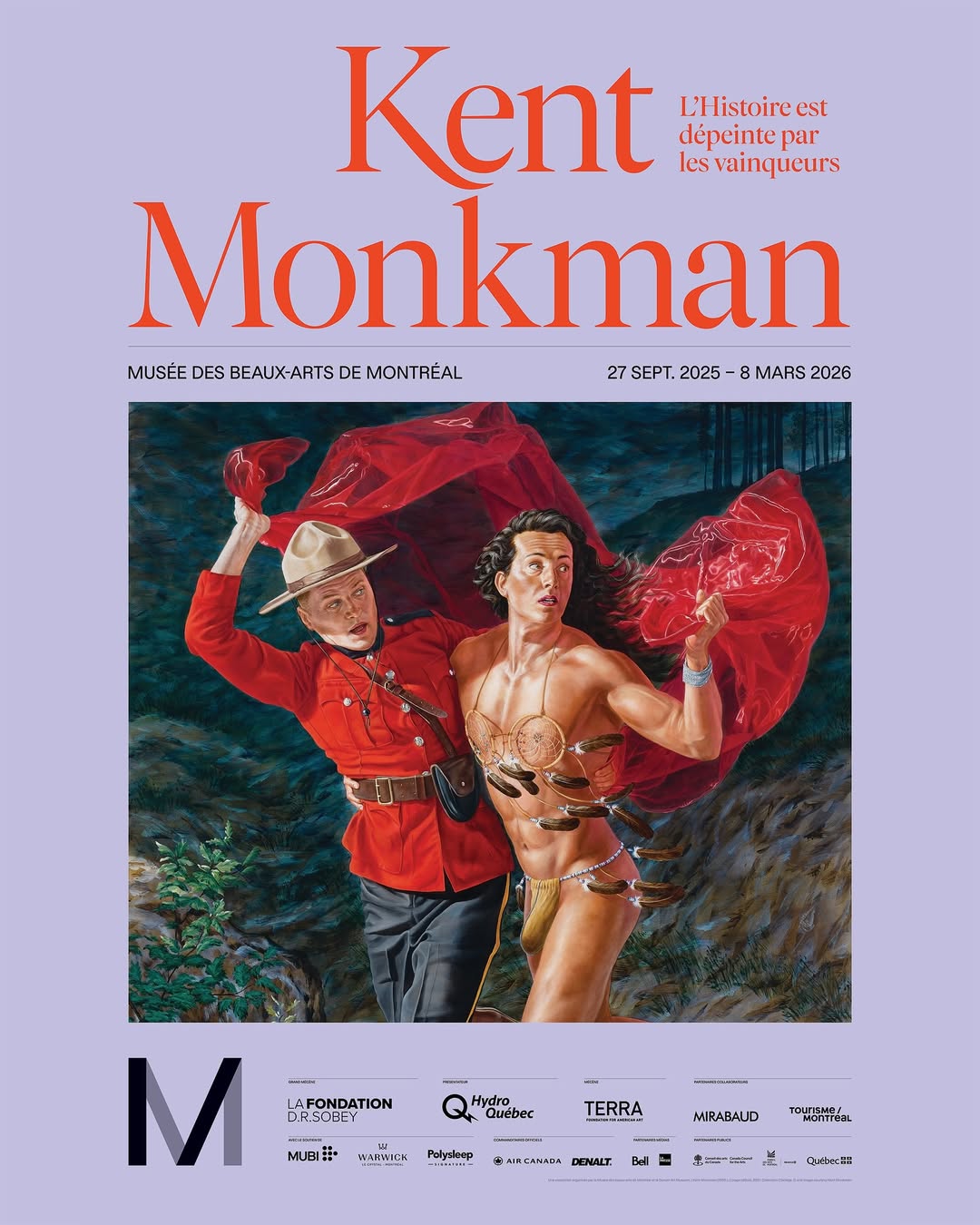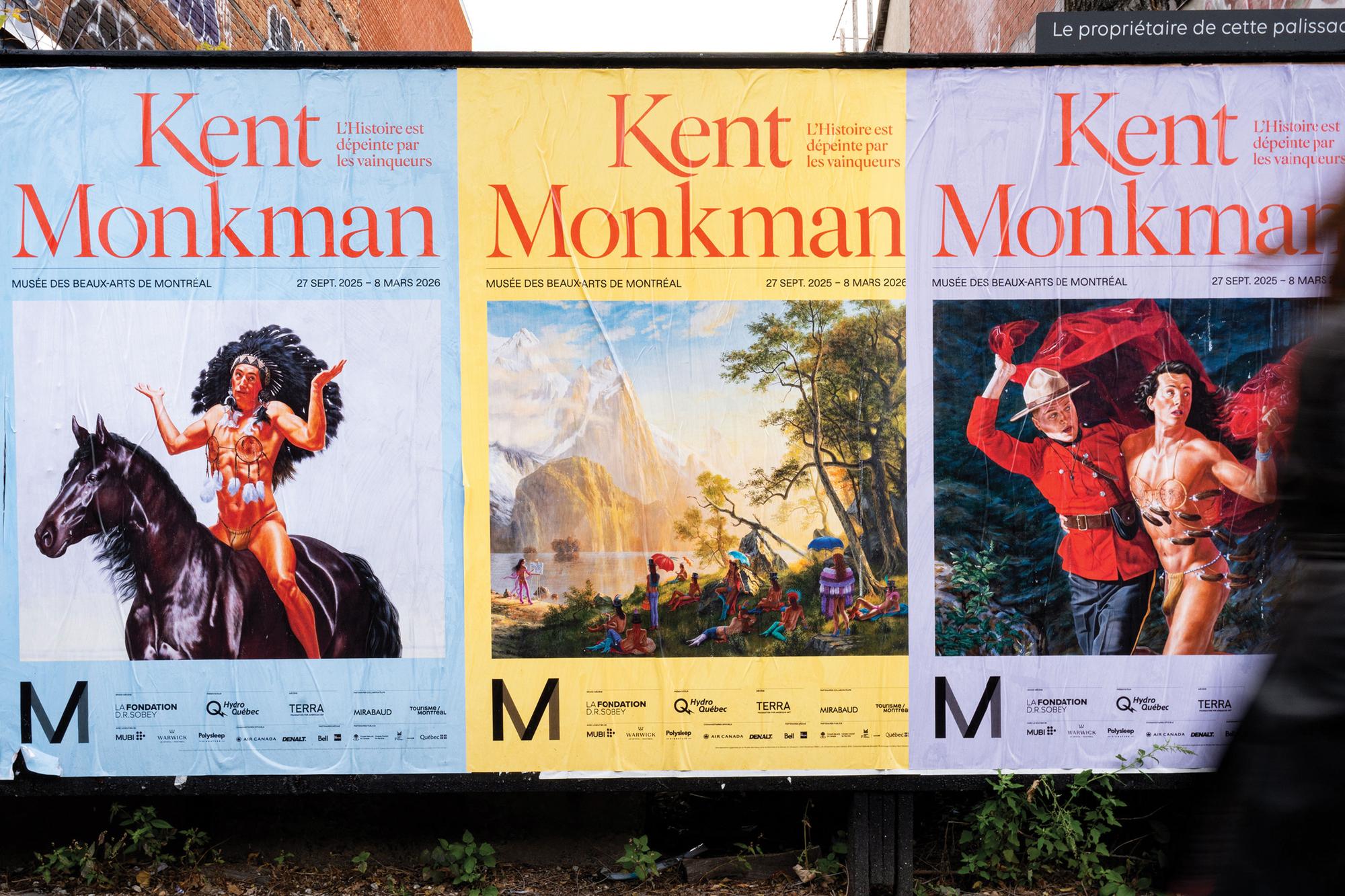 Visual identity designed for the exhibition L’histoire est dépeinte par les vainqueurs (English: History is Painted by the Victors; Cree: pihci nâway sapikahamwak kâ-paskiyâkêcik) showing works by Kent Monkman, an internationally acclaimed artist and member of the ôcêkwi sîpiy (Fisher River Cree Nation), known for his bold reinterpretations of history painting. Bringing together over forty monumental works, the exhibition explores the complexity of Indigenous experiences through themes such as colonization, climate crisis, and 2ELGBTQIA+ representation.