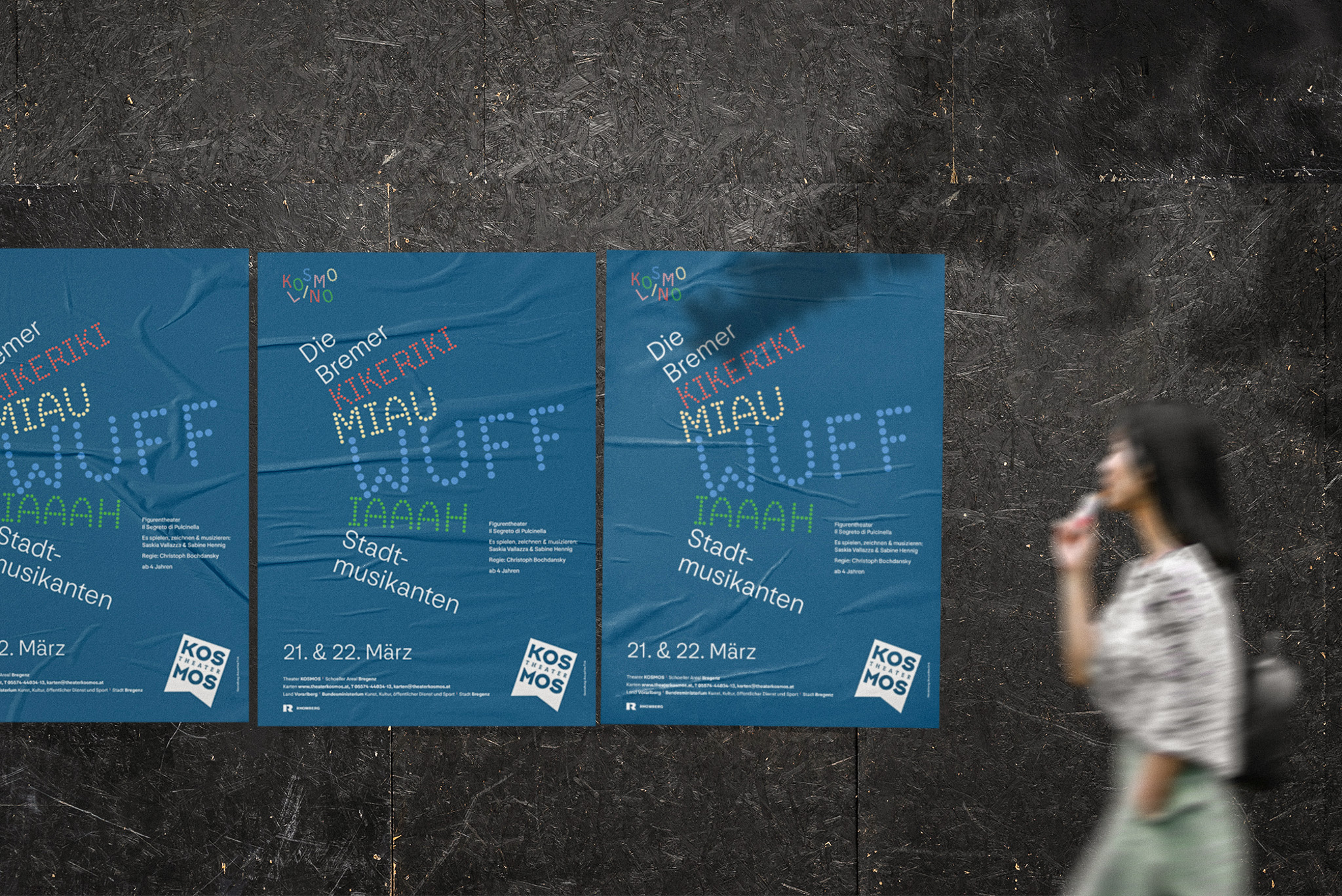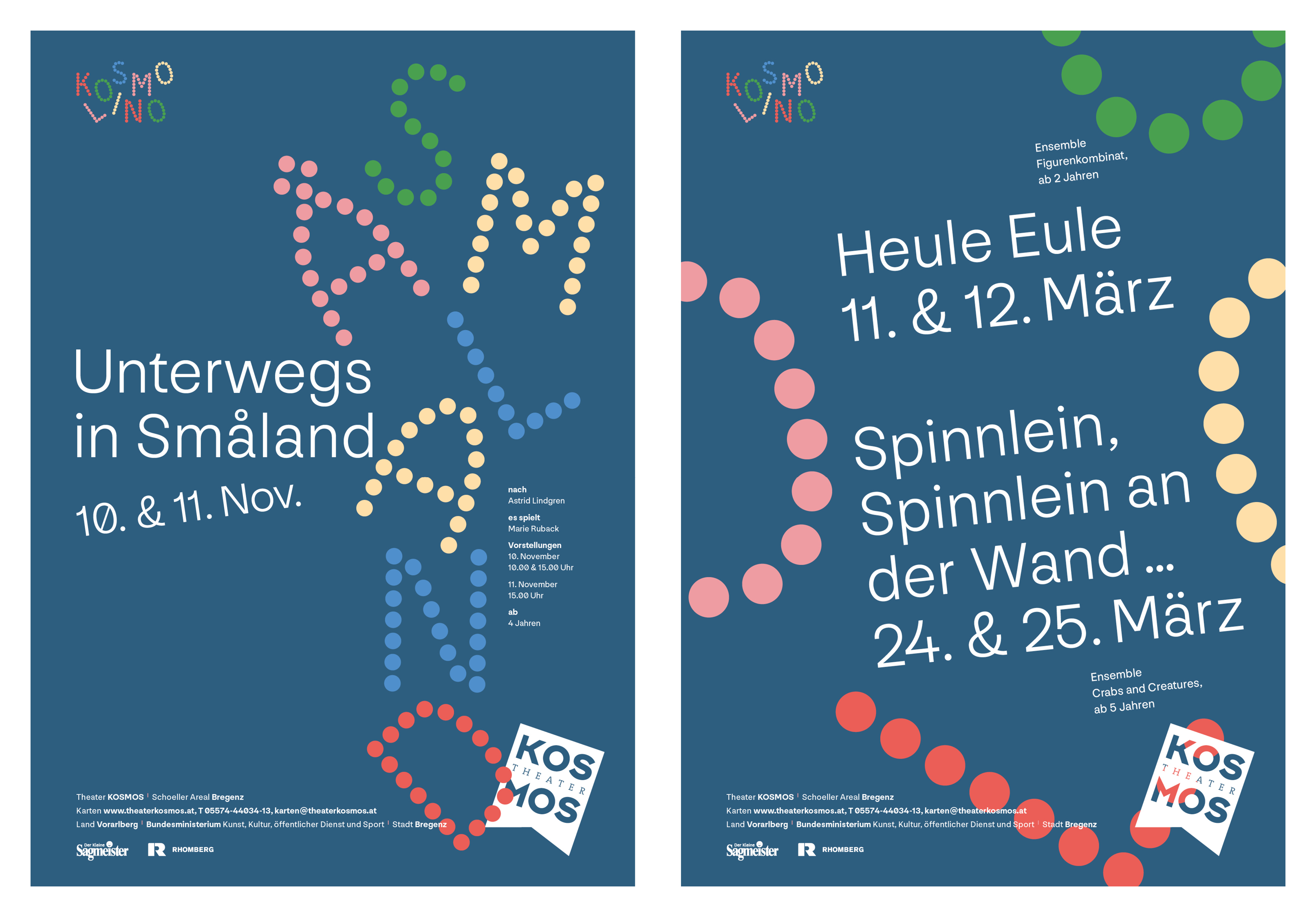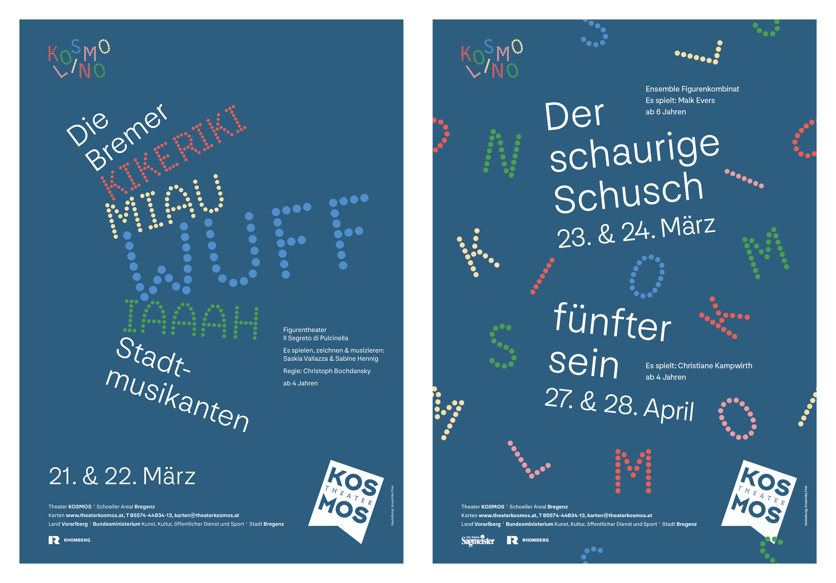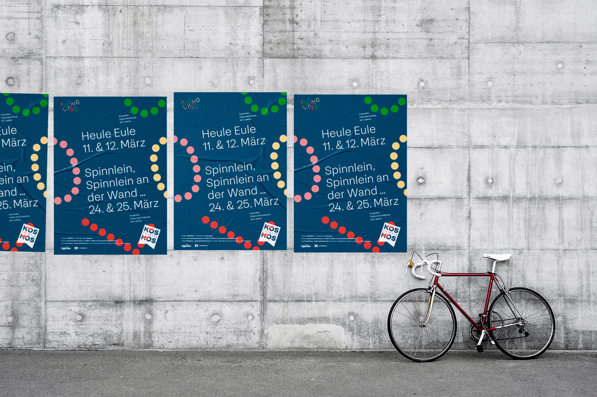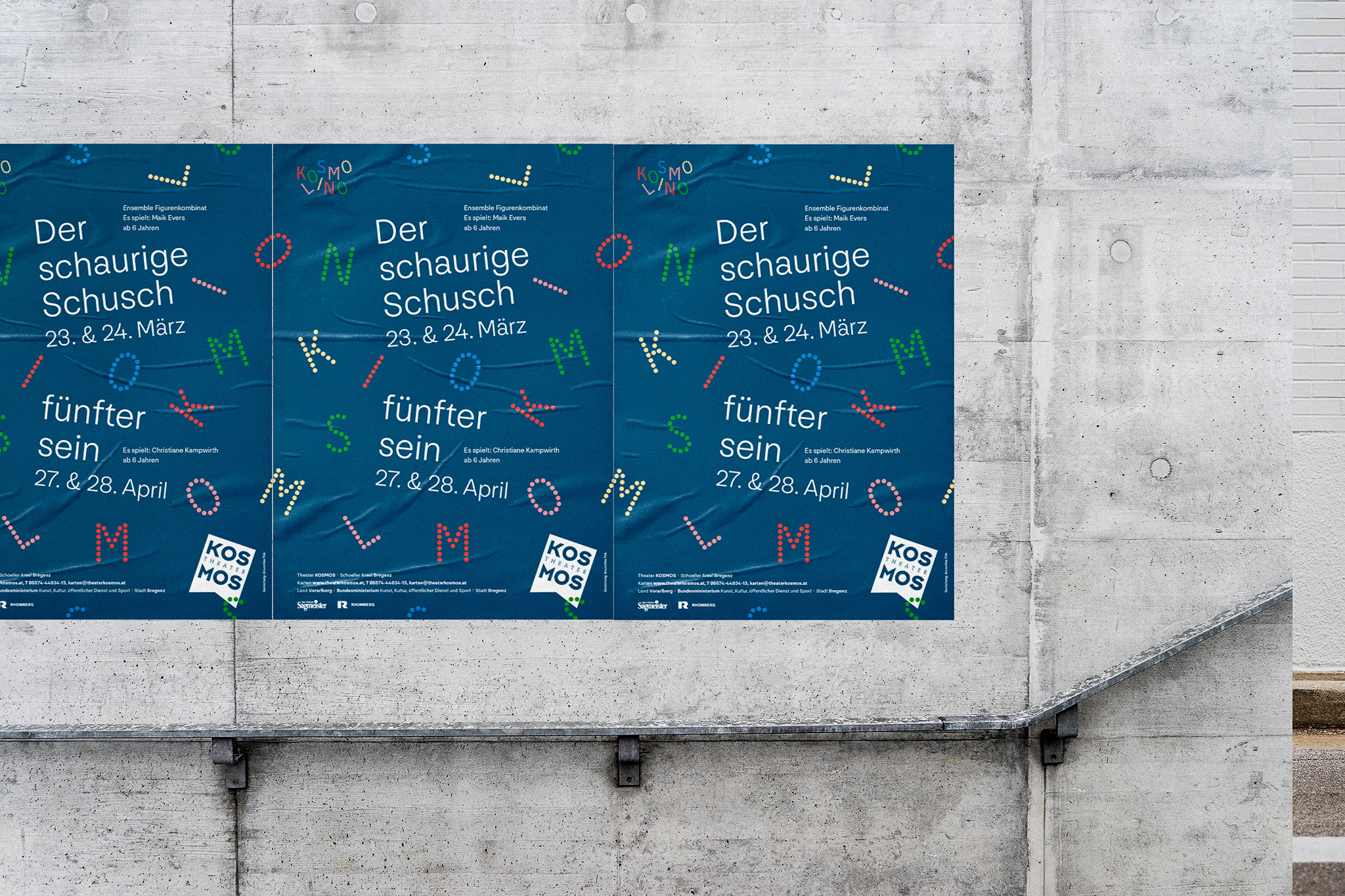 Inspired by this, I designed a graphic concept for both Kosmodrom and Kosmolino. The two visual identities were meant to share similarities while still remaining distinct and striking. The stars – or the light – of the stage backdrop became a key design element. Reduced to a single “dot,” it symbolizes the stars of the theater cosmos.