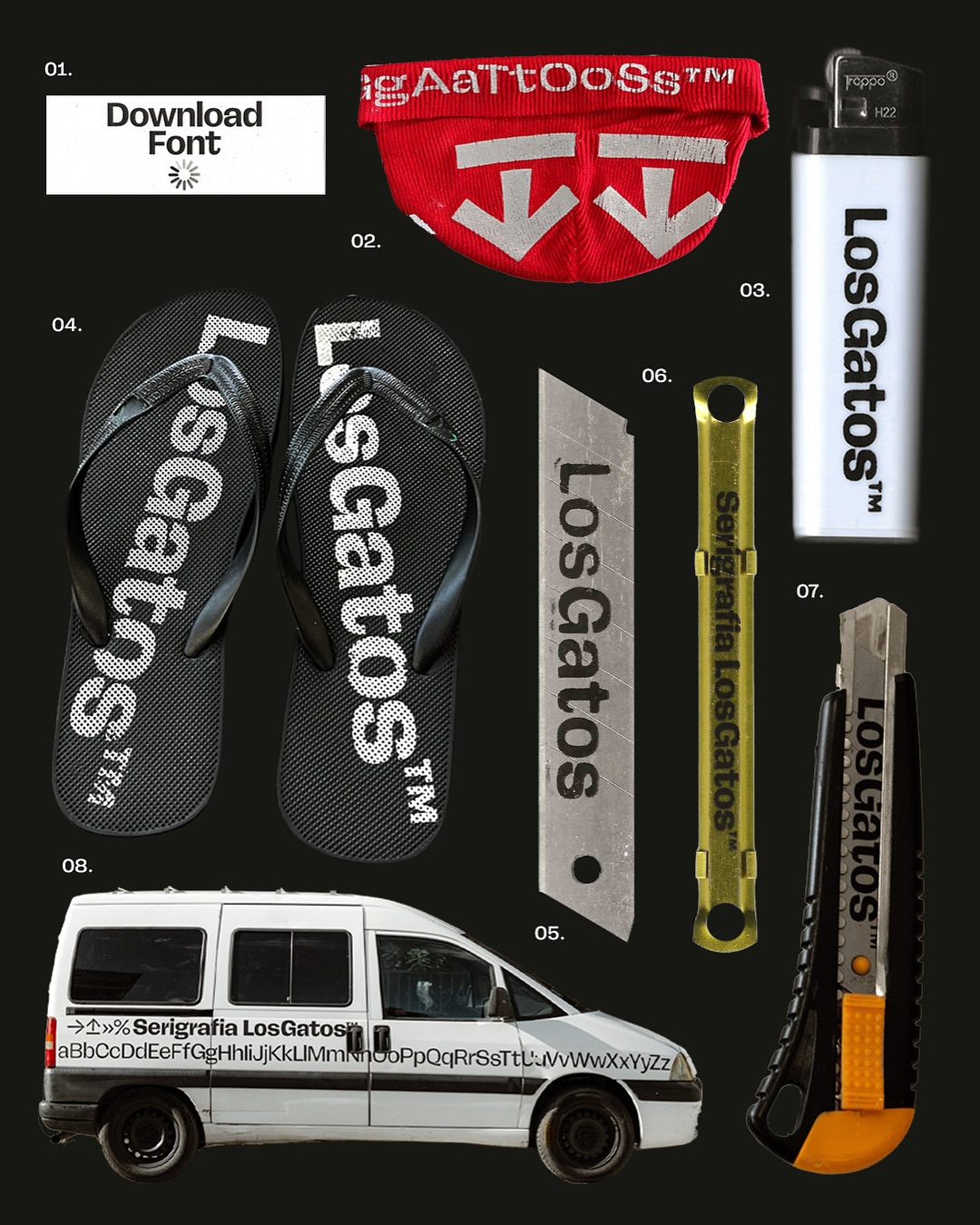 FL Rare by Flight Mode Type (Alex Slobzheninov) is the brand font of Serigrafia Los Gatos, as proposed by Design Office Fun (Paula de Álvaro):
