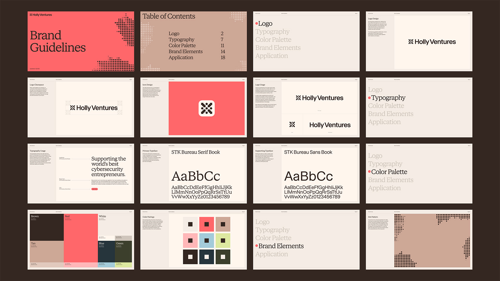 STK Bureau Serif and STK Bureau Sans from Smuss Type Kiosk are the brand typefaces of Holly Ventures, with Selecta by Maxitype used for the company’s logo. Their identity was designed by J.D. Reeves: