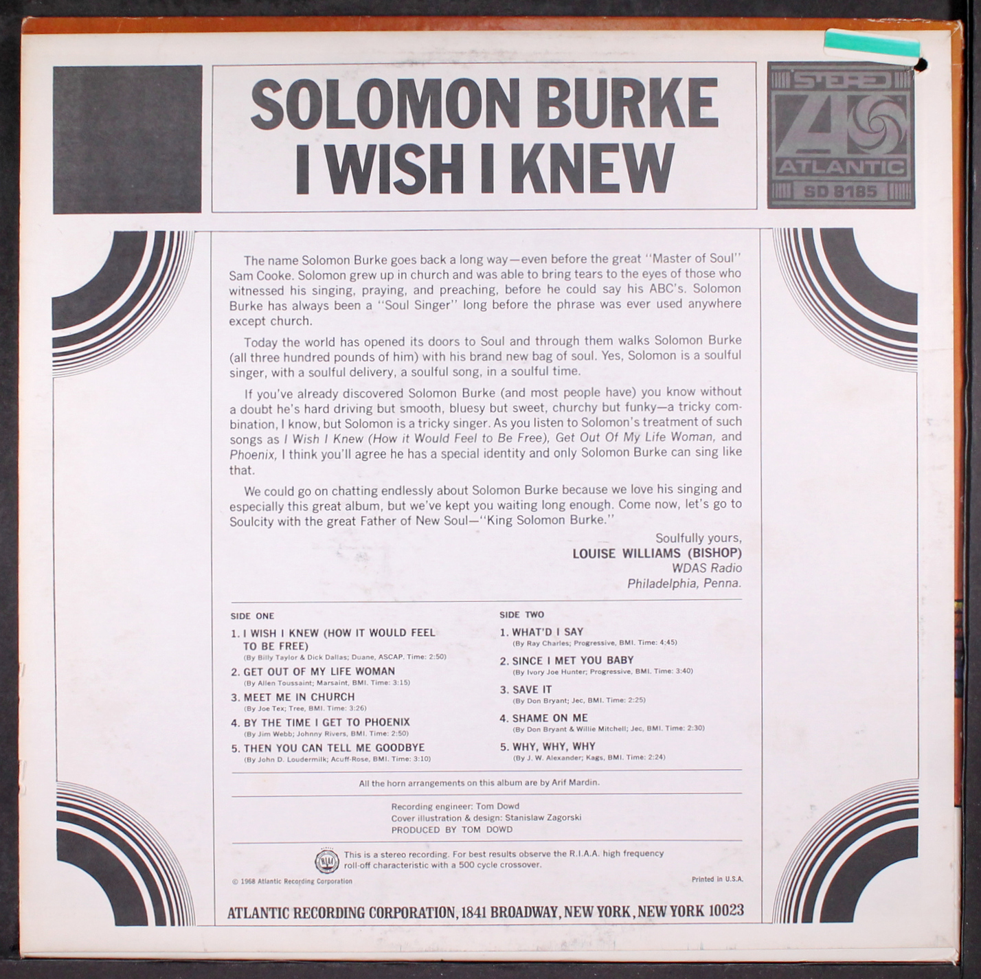 I Wish I Knew (1968) is the fourth studio album by soul/gospel singer Solomon Burke, his third for Atlantic Records after Rock ’n Soul four years earlier. Originally panned upon release for “playing it safe” right as the political climate had turned into a erupting volcano, it has become a minor classic in the 57 years since. The title track – penned by Billy Taylor and Dick Dallas – is a heartfelt confession of uncertainty over the possibility of being completely free, while Burke’s rendition of Allen Toussaint’s “Get Out of My Life, Woman” has been sampled (like a lot of other renditions of the song) by multiple artists – including by Dr. Dre on the intro track of The Chronic.